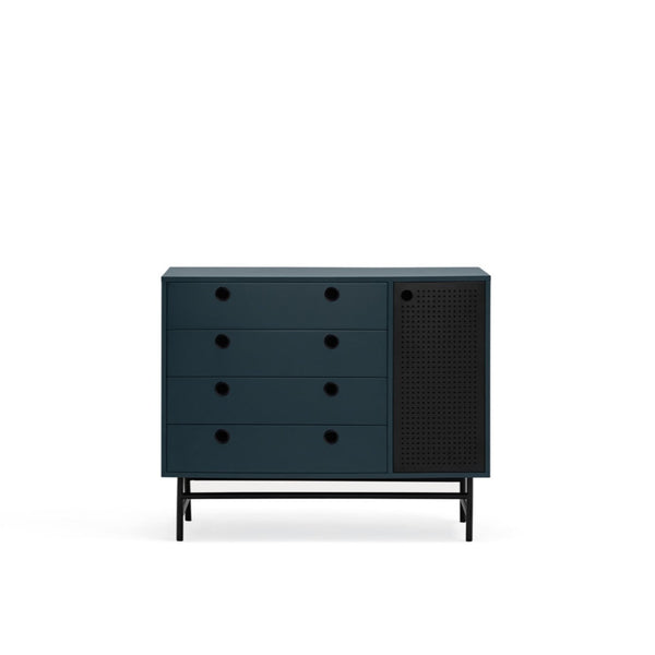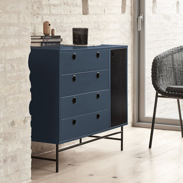 Punto Chest of Drawers, Four Drawers, One Metal Door Industrial Design, Four Shelves, Wood with Metal Frame - Dark Blue and Matt Black Finish