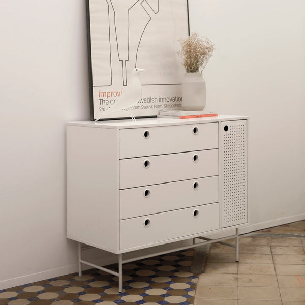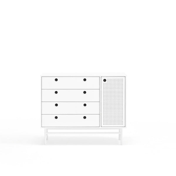 Punto Chest of Drawers, Four Drawers, One Metal Door Industrial Design, Four Shelves, Wood with Metal Frame - Matt White Finish