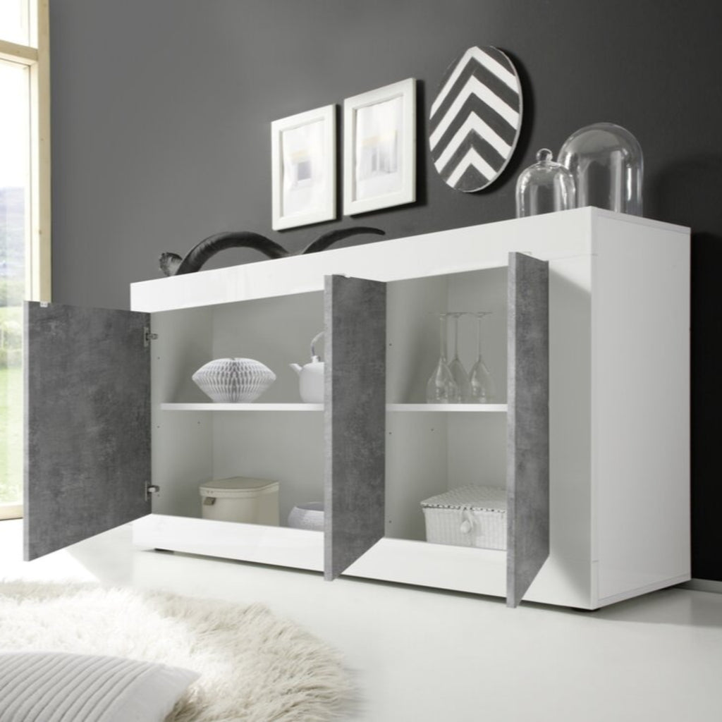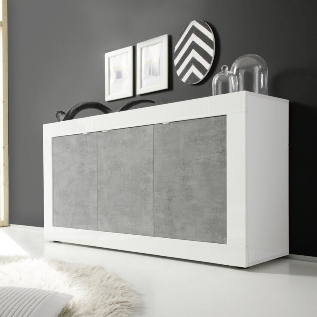 The Bologna Sideboard blends a glossy white lacquer finish with concrete grey doors, accented by discreet white metal handles for a contemporary edge.