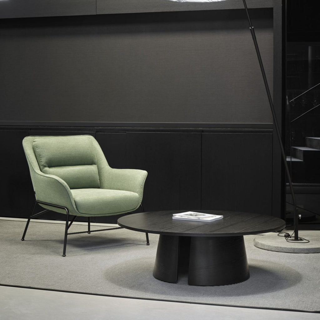 The Cep Coffee Table embodies minimalist elegance with its symmetrical wooden base supporting a generous 110 cm round top.