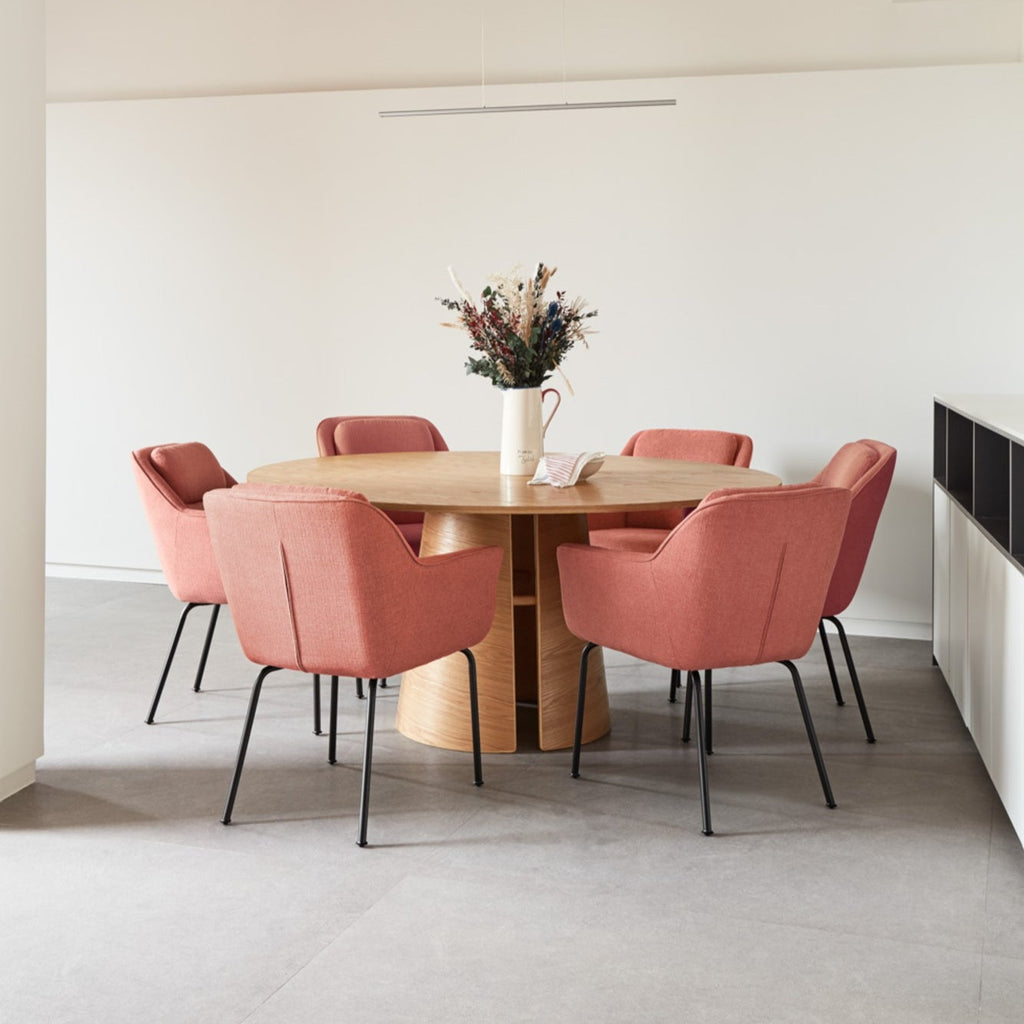 This minimalist masterpiece features a generous 157cm round ash veneer top in sophisticated natural finish, perfectly balanced on symmetrical rubberwood plywood legs. Comfortably seating 4-6 people, its thoughtful design by Cambres for Teulat combines Spanish artistry with practical elegance. The tactile surface and architectural base create a statement piece that transforms everyday dining into a luxurious experience. Professional UK delivery included, with minimal assembly required.