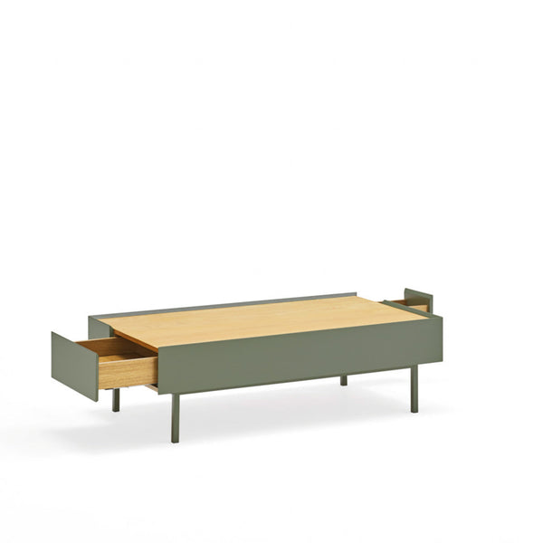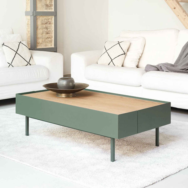 Arista Coffee Table, Rectangular, Two Drawer - Matt Green and Light Oak Finish