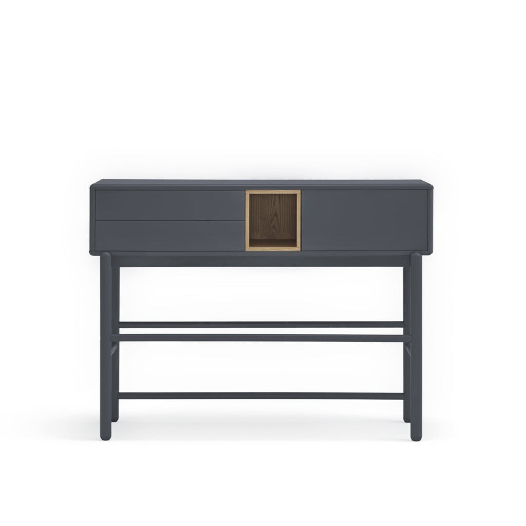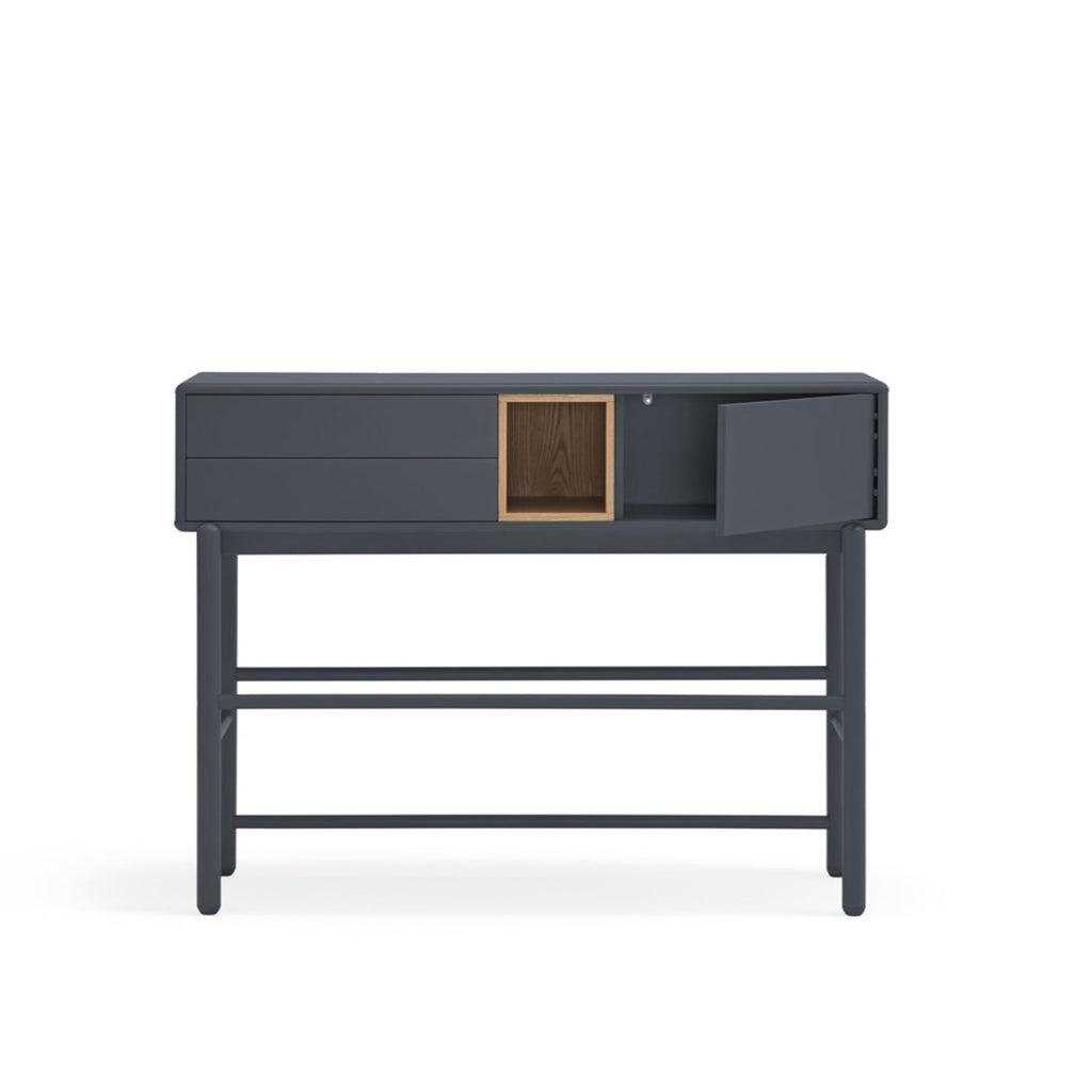 Its curved edges and anthracite finish harmonize beautifully with light oak accents, creating a contemporary statement piece for modern homes. Discover hidden storage behind the push-release door, organize essentials in two smooth soft-close drawers, and showcase treasured items on the oak-veneered open display shelf. Crafted from premium lacquered MDF with solid wood legs, this versatile 120cm wide console combines elegant aesthetics with practical storage solutions that will elevate your living space instantly.