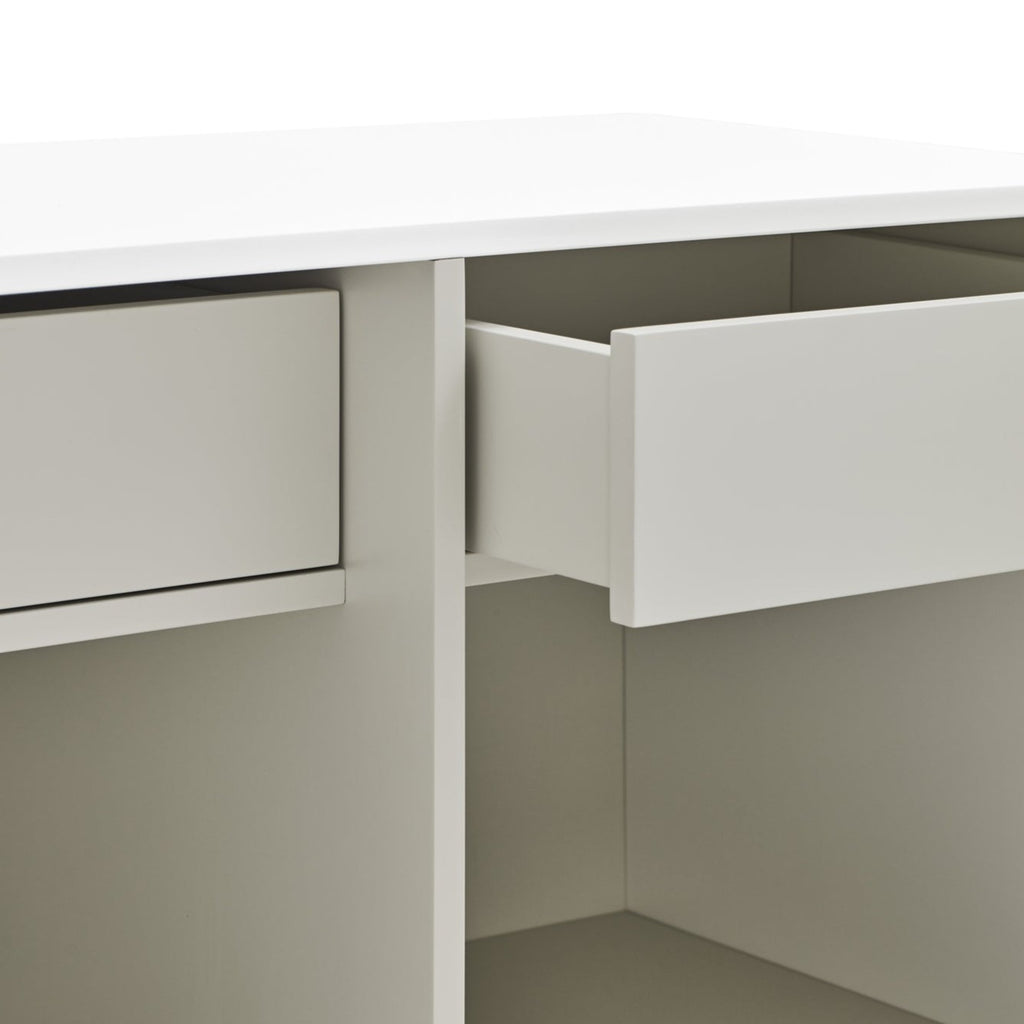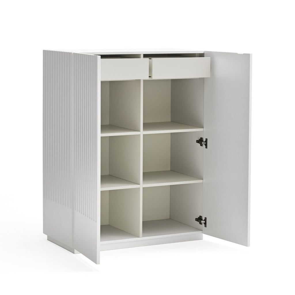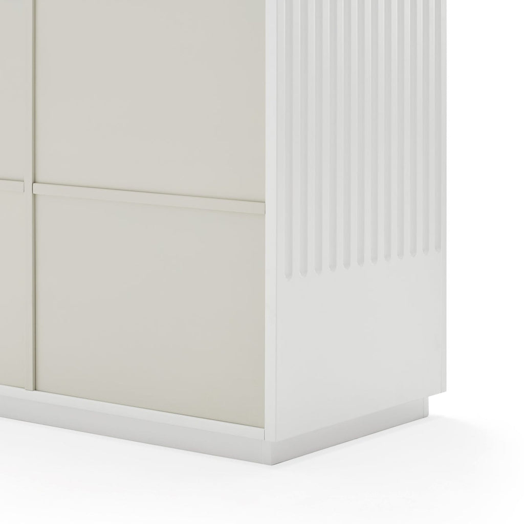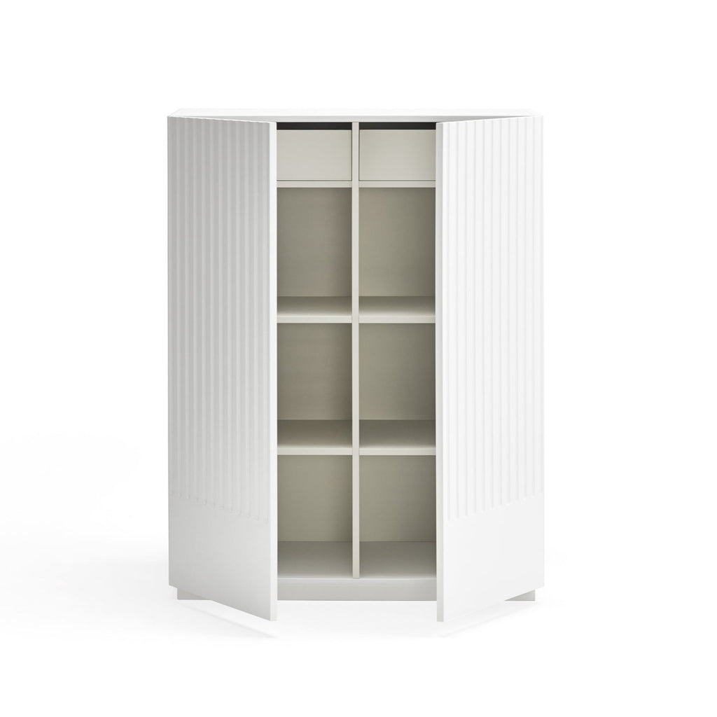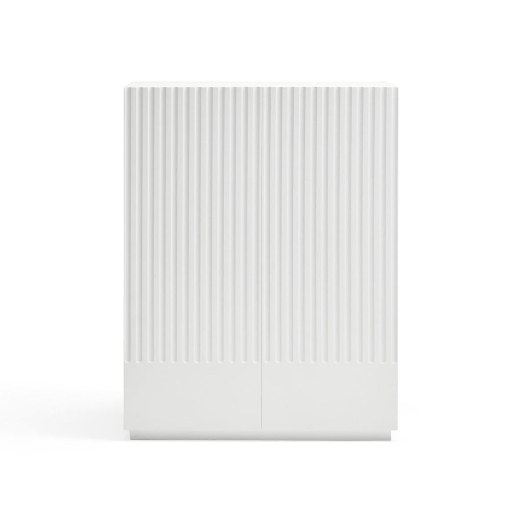 The ingeniously contoured doors create a captivating visual symphony, as light dances across the luxurious matt white finish, revealing dynamic dimensions that transform with your perspective. Behind the sophisticated push-release doors lies a thoughtfully designed interior featuring six adaptable shelves and two premium soft-close drawers in distinguished white—offering versatile storage while maintaining a cohesive aesthetic. Expertly crafted from superior lacquered MDF by the visionary Cambres Design for Teulat, this Spanish-inspired statement piece embodies contemporary European sophistication. Standing at an impressive yet perfectly balanced 91cm wide by 120cm high, this extraordinary sideboard doesn't merely furnish your home—it elevates it, becoming the conversation-starting focal point that defines your space and showcases your discerning taste for exceptional design that seamlessly blends form and function.