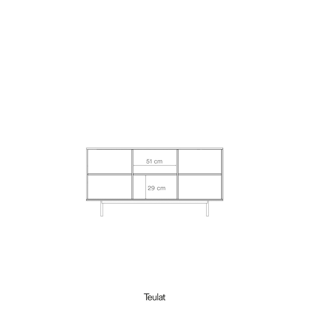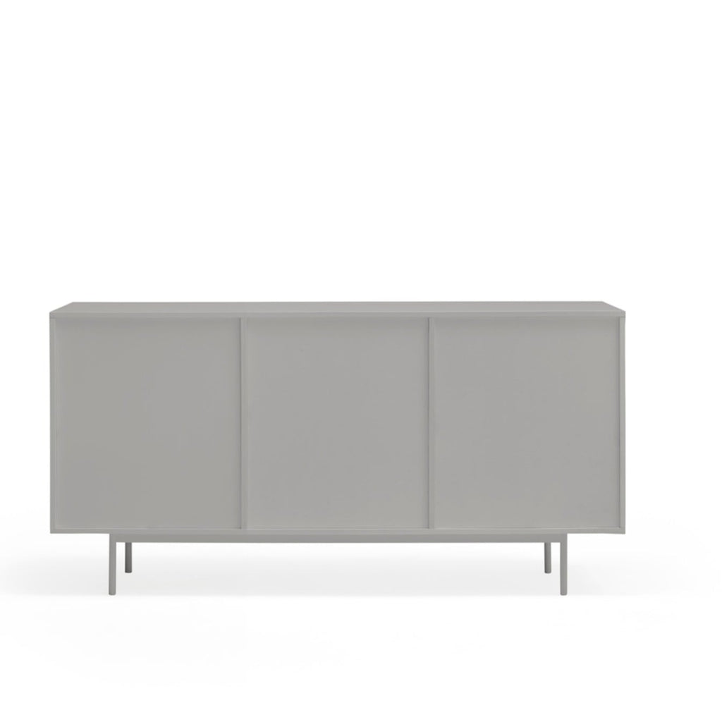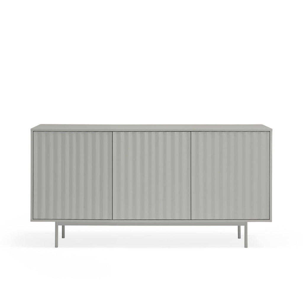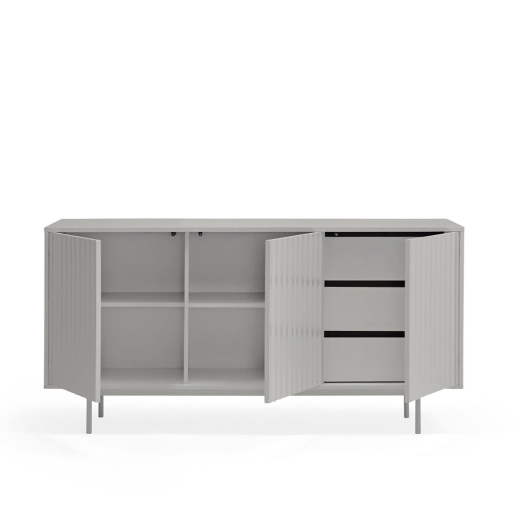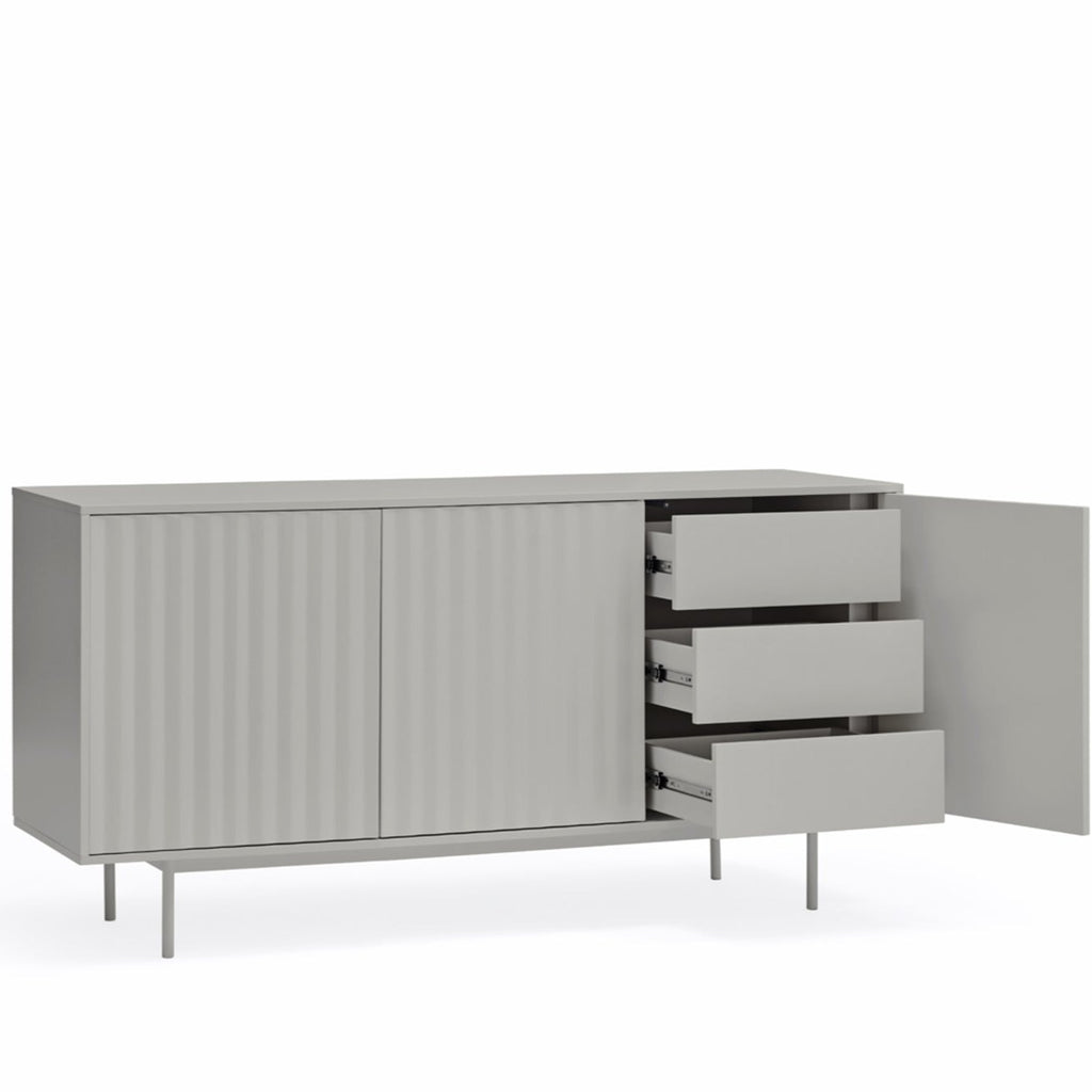 This statement piece offers intelligent storage with three push-release doors revealing four shelves and three soft-close drawers, perfect for organizing your treasured possessions with style. The pristine matt light grey finish and coordinating powder-coated metal legs exude contemporary elegance while complementing any modern interior. Meticulously designed by Teulat in Spain, this sophisticated 159.2cm wide sideboard combines premium lacquered MDF construction with exceptional craftsmanship. Delivered by professional furniture carriers and ready for simple self-assembly to transform your living space.