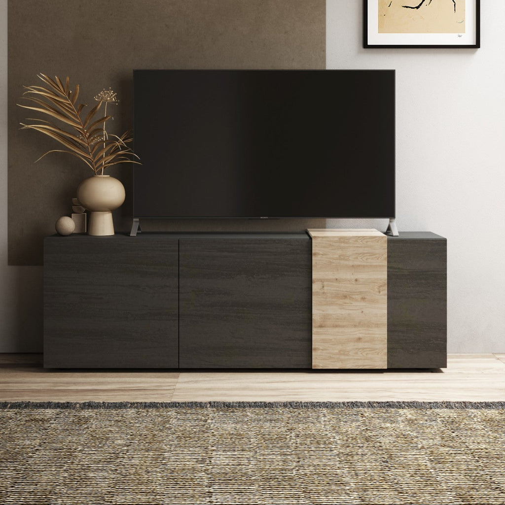 The Vinovo TV Stand offers a striking blend of anthracite and light oak detail on the far right door, creating a contemporary look that enhances any room.