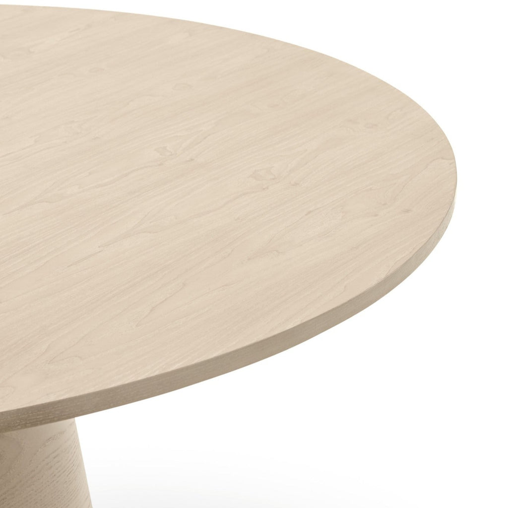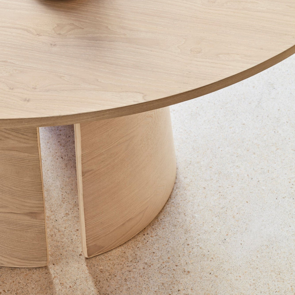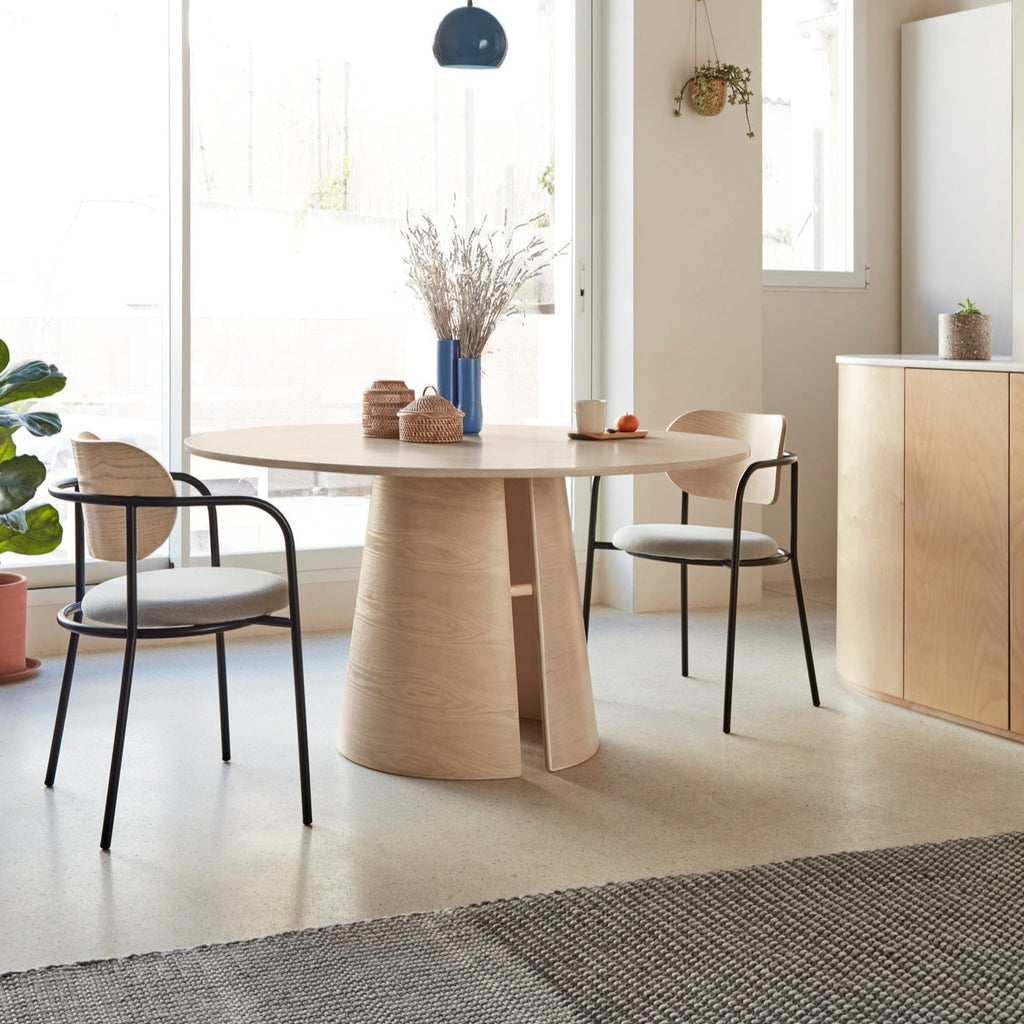 The striking contrast between the sleek light natural ash veneer top and wooden base creates a contemporary statement piece that elevates any dining space. Expertly crafted by Cambres Design for Teulat, this Spanish-designed table comfortably seats four around its generous 137cm diameter surface. The distinctive symmetrical base showcases beautiful natural wood grain, while the tactile top invites gathering and conversation. At 75cm high with professional UK delivery included, this sophisticated dining solution requires minimal assembly before becoming the heart of your home's most memorable moments.