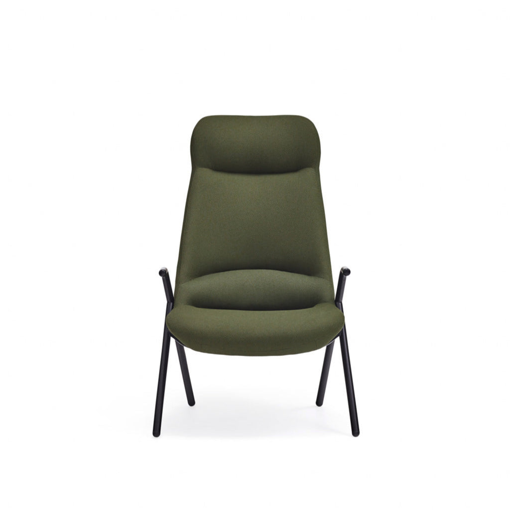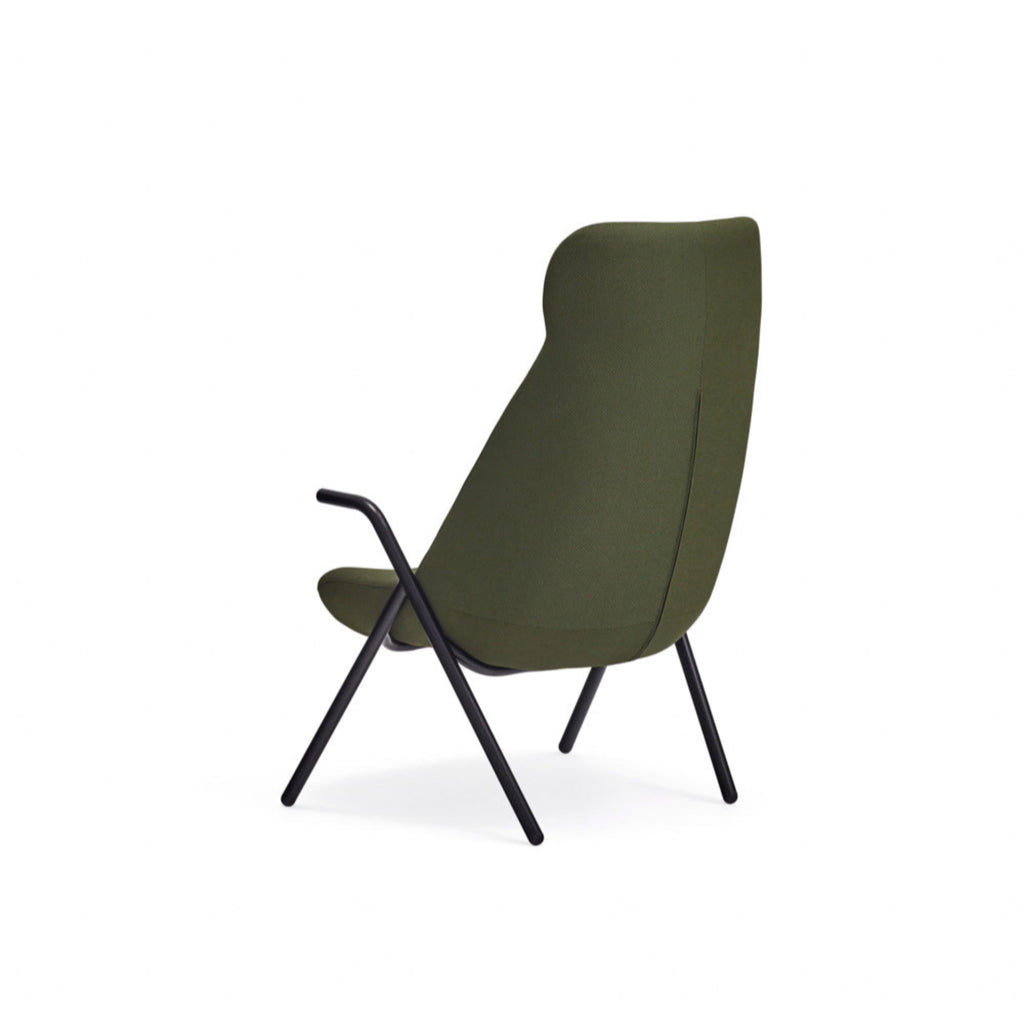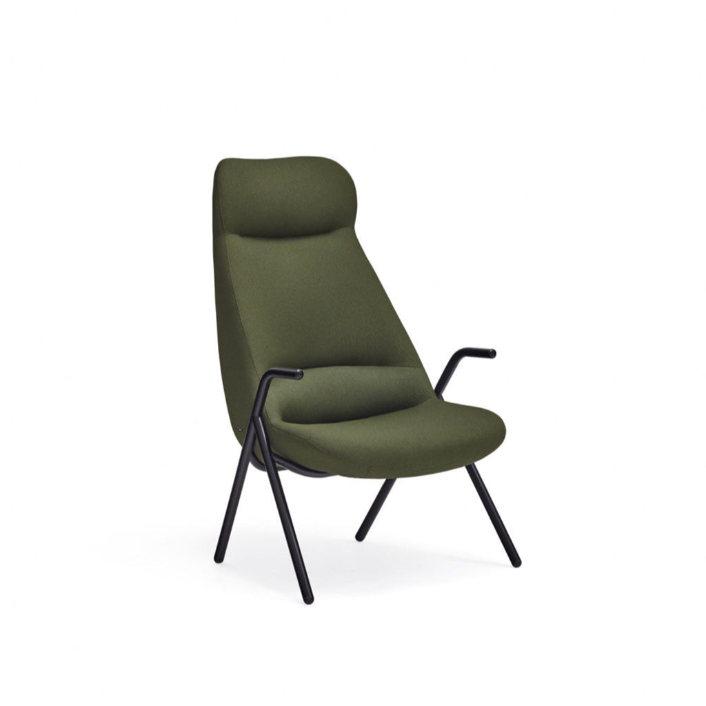The Dins High Back Armchair offers a stylish blend of a sleek black frame and arms with luxurious dark green RONDO 68226 fabric.