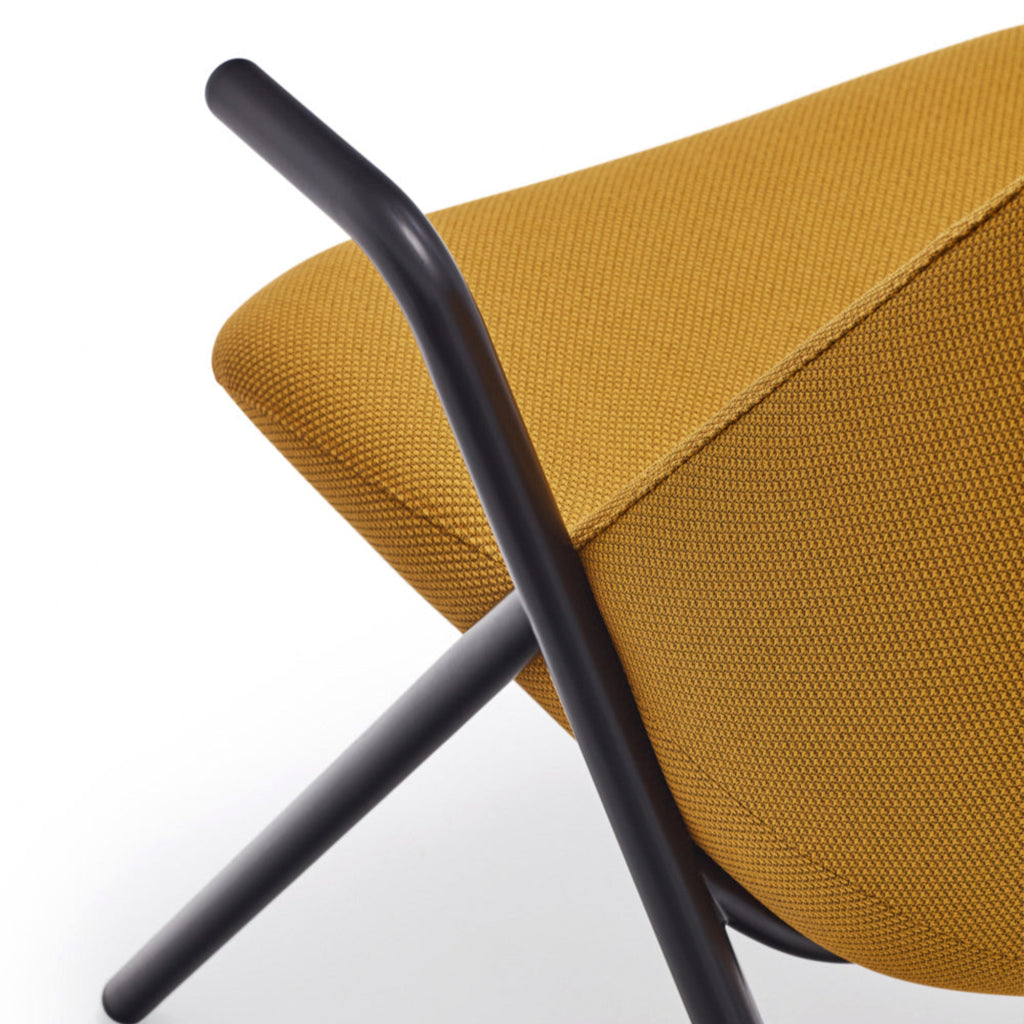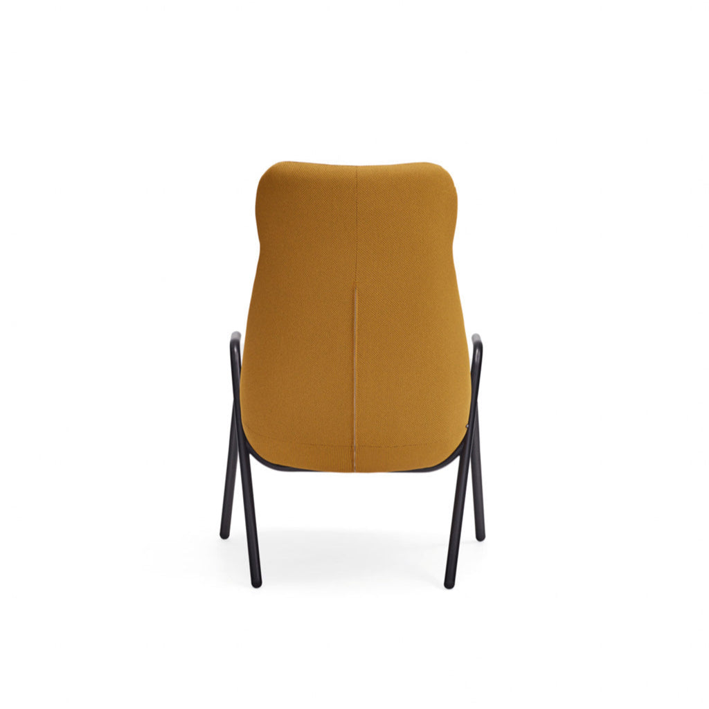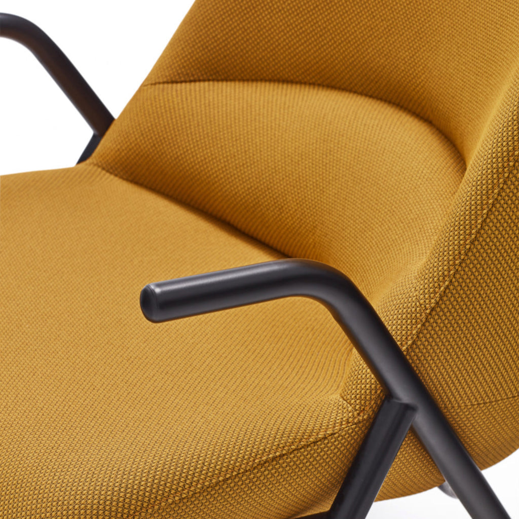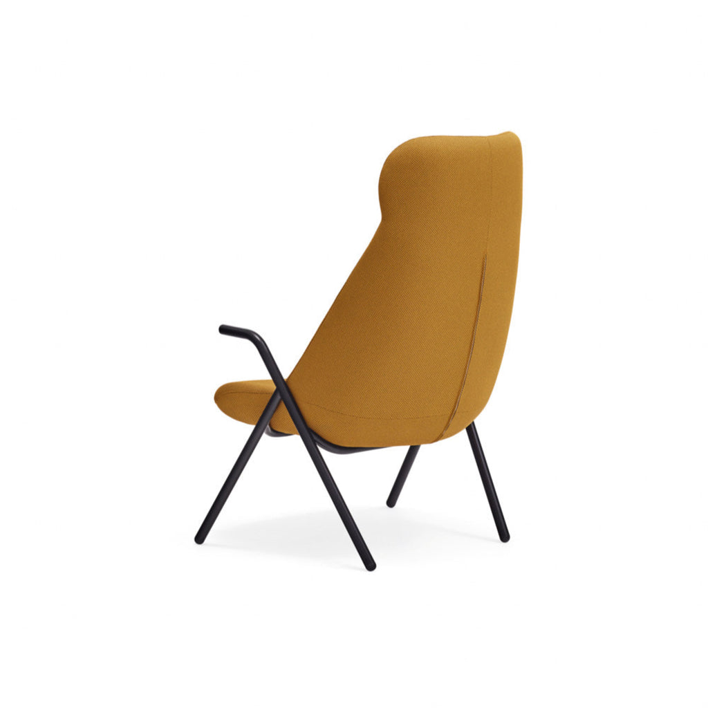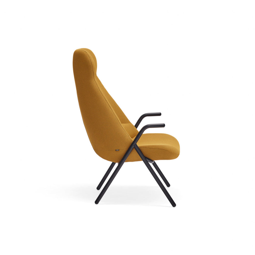 The Dins High Back Armchair offers a stylish blend of a sleek black frame and arms with luxurious mustard yellow RONDO 62108 fabric.