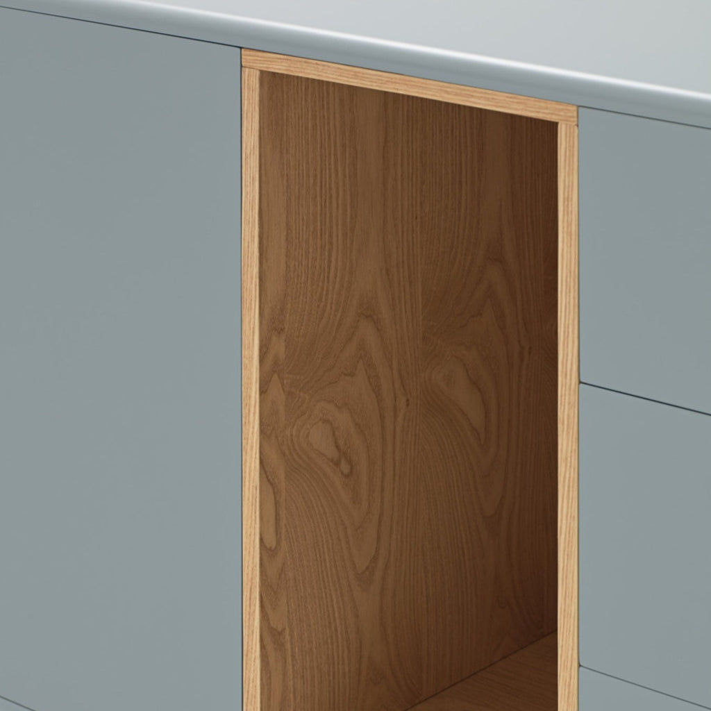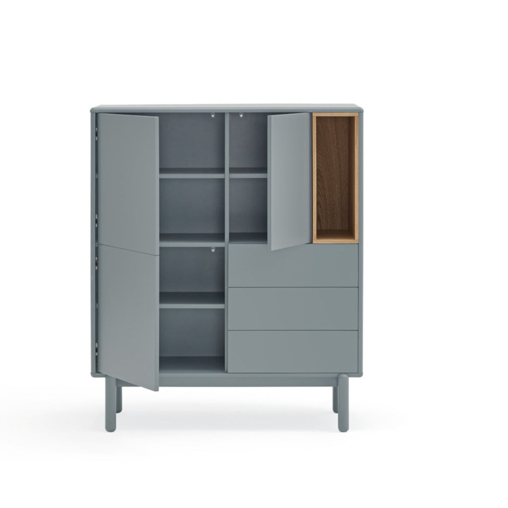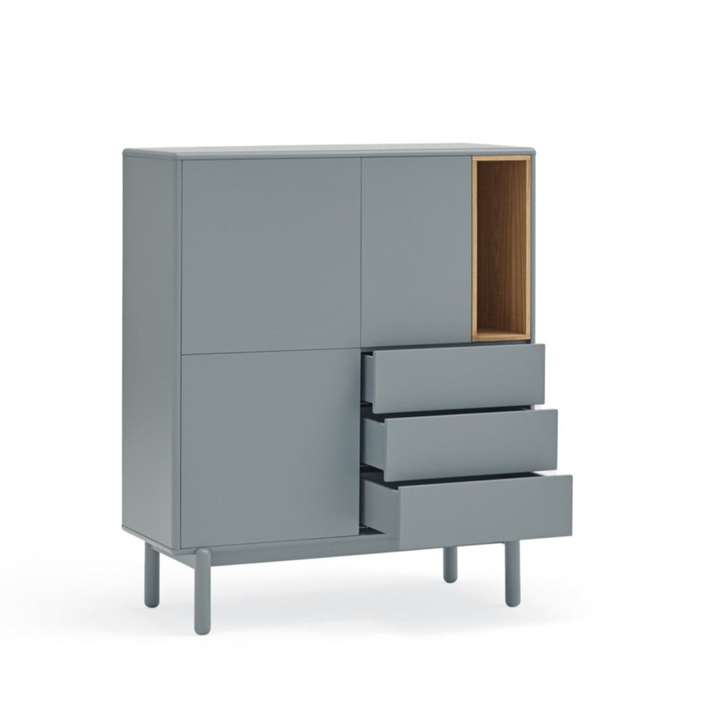 This sophisticated piece marries sleek light grey with warm oak accents, creating a perfect centerpiece for contemporary homes. The innovative design features three soft-close drawers and two push-release doors with five internal shelves, offering abundant hidden storage. The striking open display area, finished in light oak veneer, provides the ideal showcase for your treasured items. Standing on elegant solid wood legs at a perfect height of 120cm, this premium cabinet combines exceptional craftsmanship with versatile functionality. At 100cm wide, it's generously proportioned yet fits seamlessly into modern living spaces. Elevate your interior with this statement of refined style.