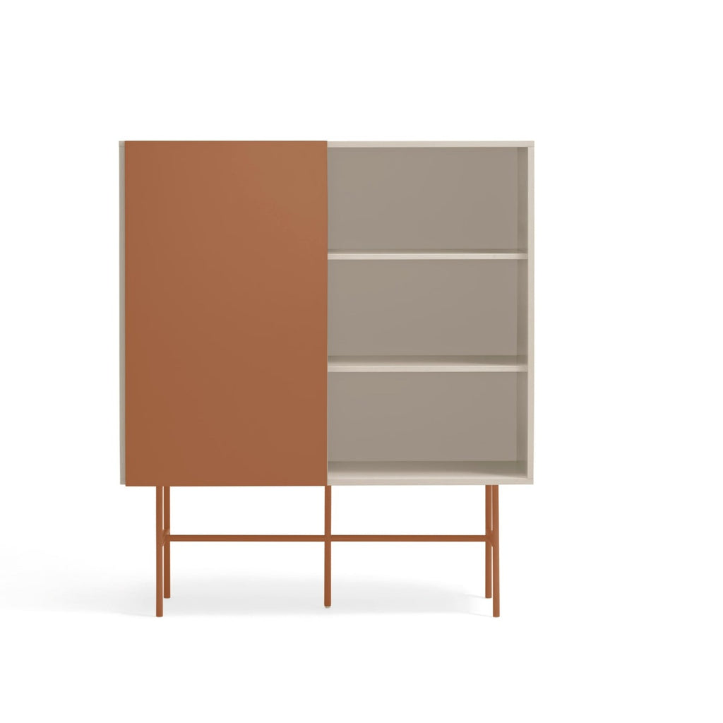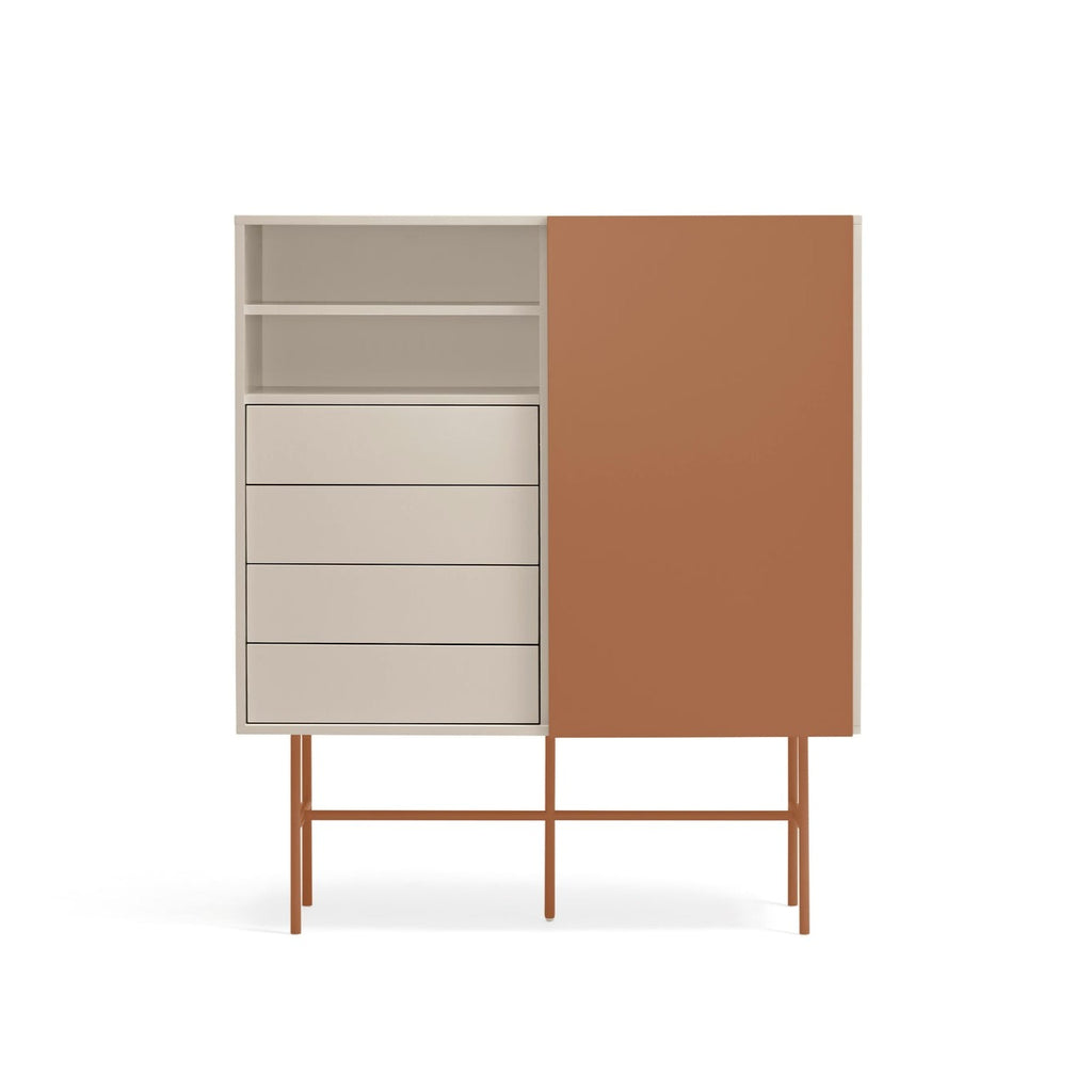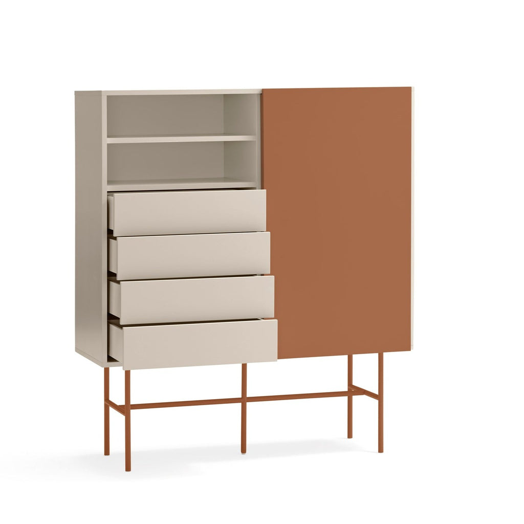 This premium storage solution combines sleek aesthetics with practical functionality, featuring four smooth-gliding drawers on soft-close runners and a versatile red sliding door that can be positioned to showcase or conceal different sections of the cabinet. The sophisticated cream lacquered MDF structure creates a stunning contrast against the red powder-coated metal frame, making this piece a true statement of contemporary style. At 120cm wide and 140cm tall, this impressive cabinet offers generous storage capacity while maintaining an elegant profile. The thoughtfully designed interior includes three shelves, providing flexible organization for all your essentials. Delivered by professional UK furniture carriers and designed for straightforward self-assembly, the Nube Sideboard transforms any room with its perfect balance of luxury and practicality—an investment piece that enhances both your storage options and your home's aesthetic appeal.