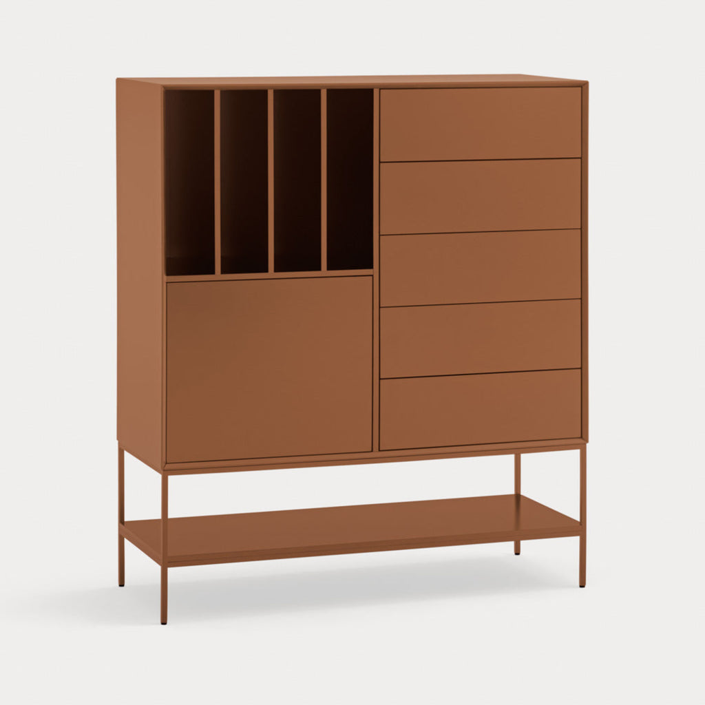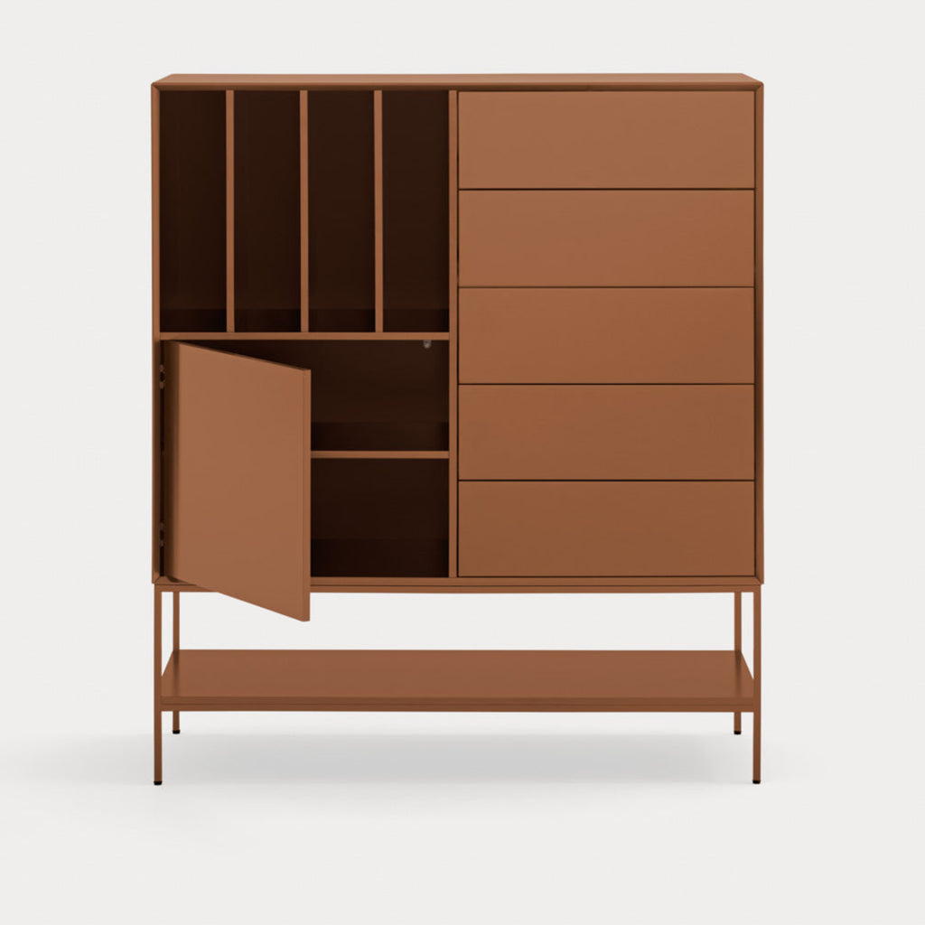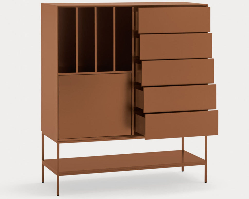 This architectural statement piece from prestigious Spanish design house Teulat transforms storage into an art form. The meticulously crafted cabinet features five precision-engineered drawers and a generous door compartment with integrated shelf, offering abundant organization while enhancing your interior aesthetic. Standing at 140cm tall with a 120cm width, the premium lacquered MDF construction is elegantly supported by contemporary metal legs, creating a compelling visual presence. Invest in European craftsmanship that seamlessly blends functionality with refined style. Professionally delivered by UK furniture specialists, this versatile storage solution requires simple self-assembly to complete your sophisticated living space.