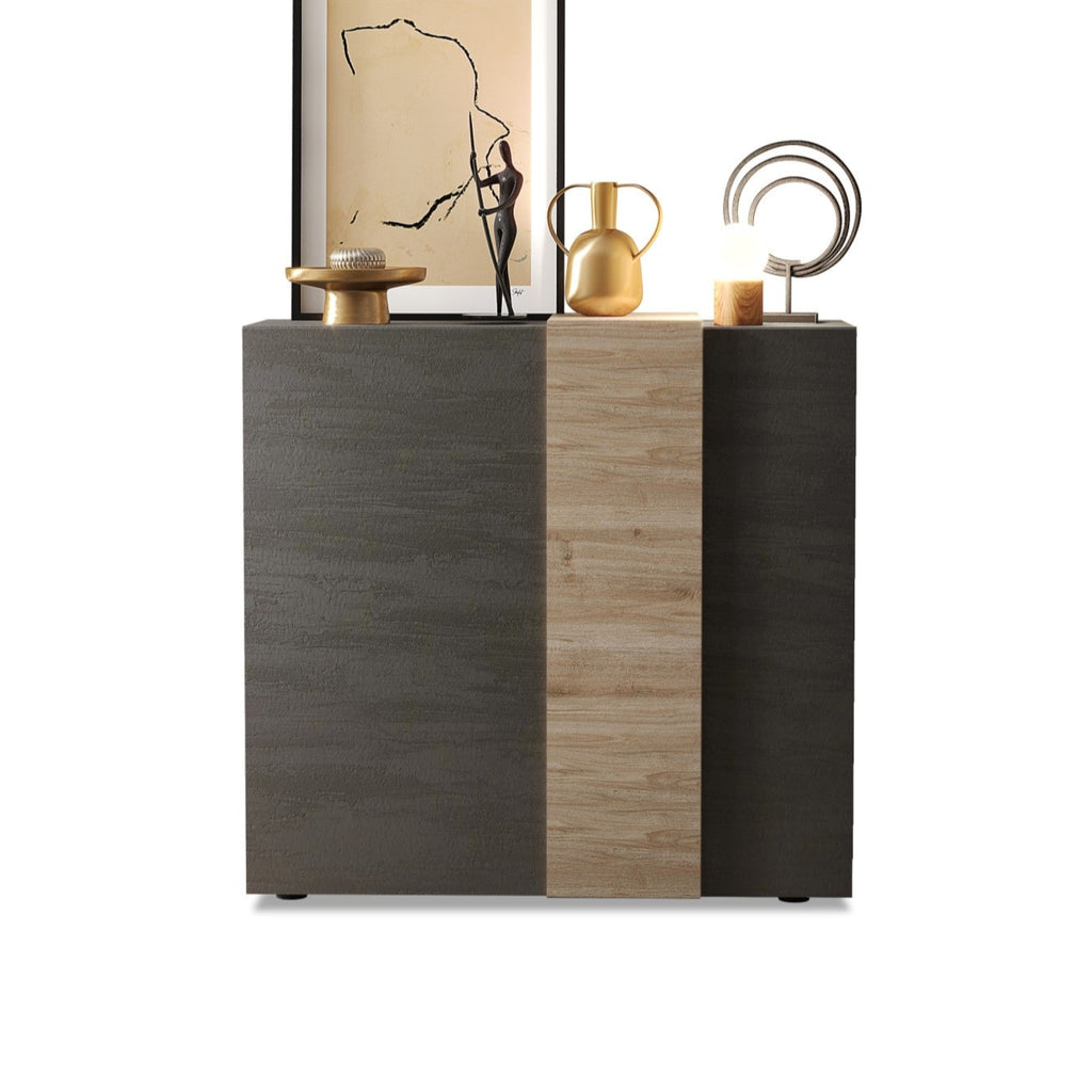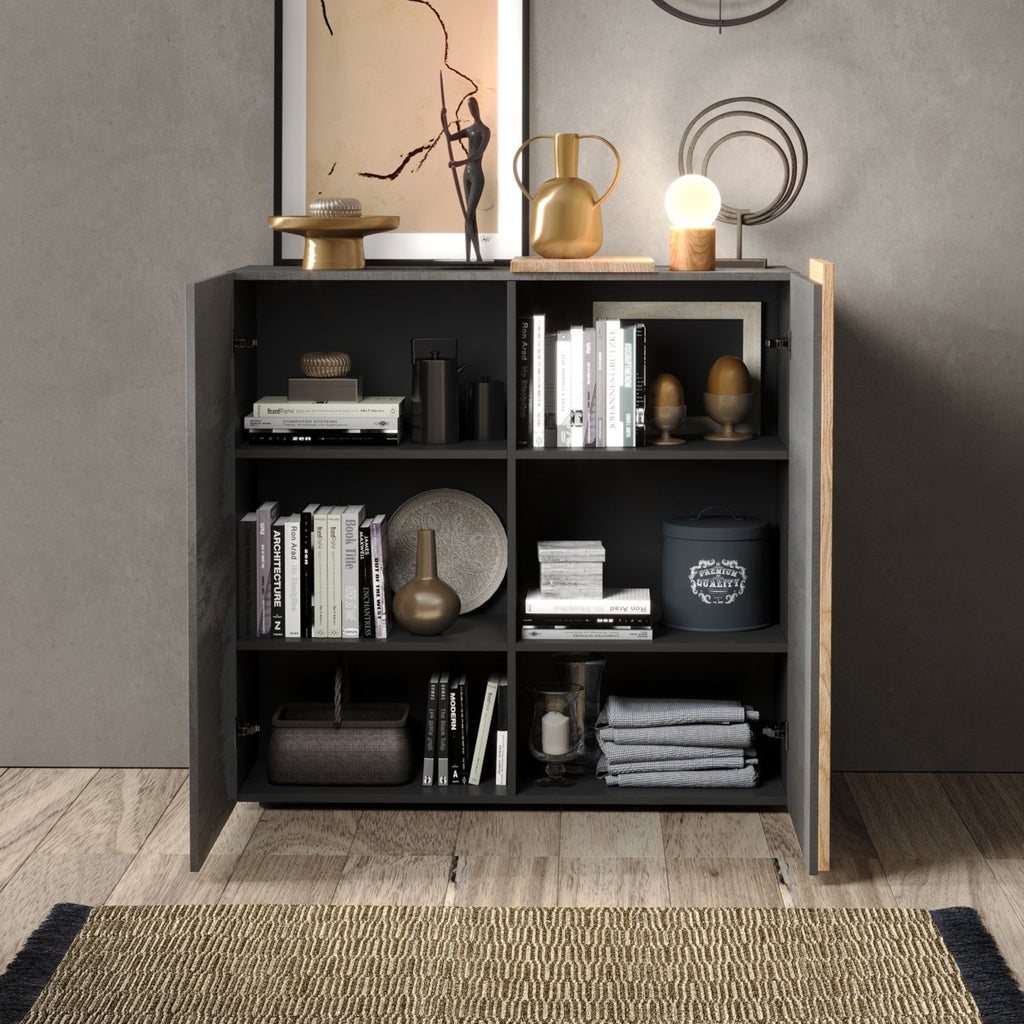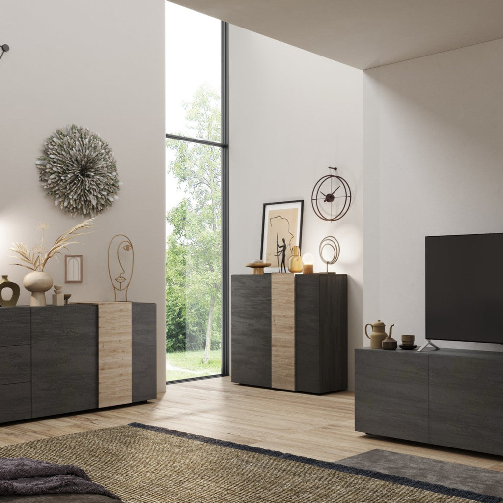 The Vinovo High Sideboard offers a perfect blend of style and functionality with its anthracite finish and distinctive light oak design on the right door.