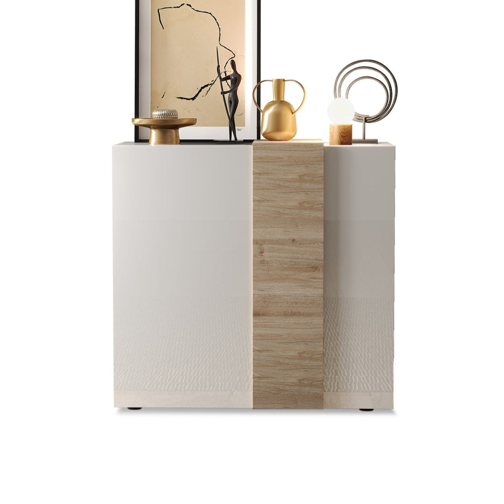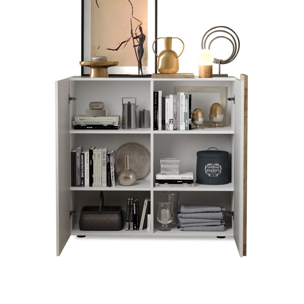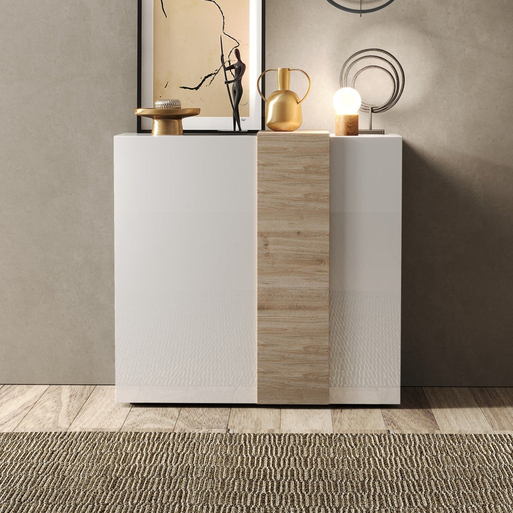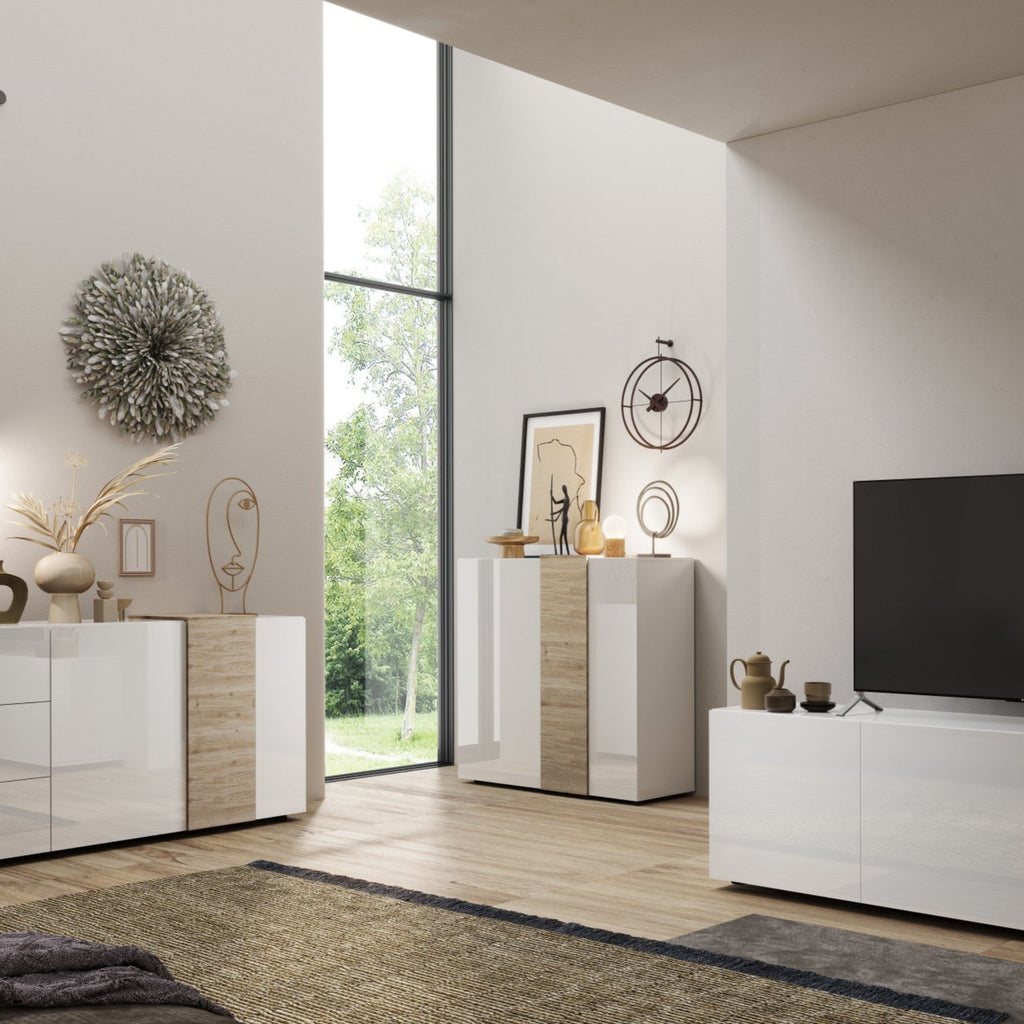 The Vinovo High Sideboard offers a perfect blend of style and functionality with its glossy white finish and distinctive light oak design on the right door.