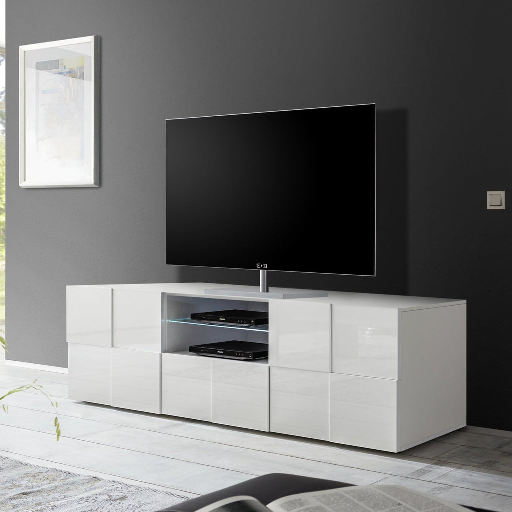 The Donato TV Stand from the Treviso Collection combines sleek high gloss white lacquer with a distinctive chequerboard pattern on doors and drawer fronts.