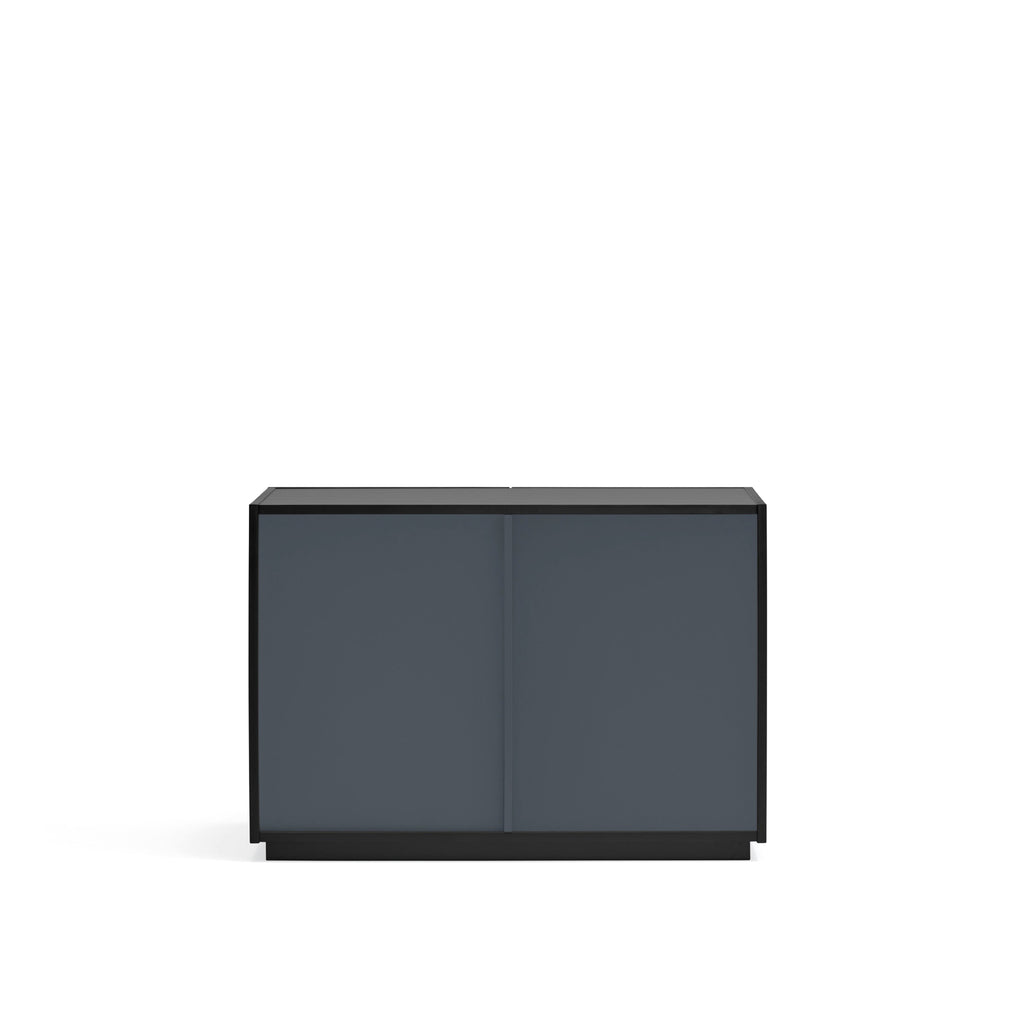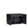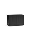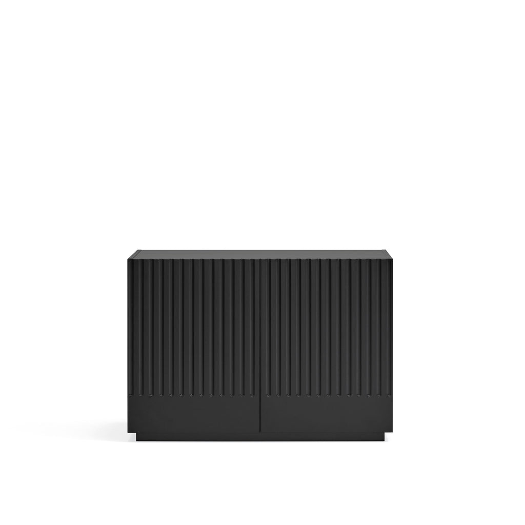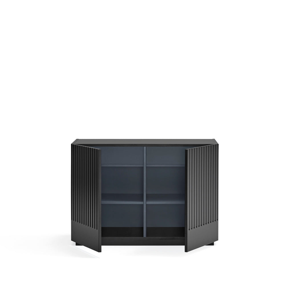 This sophisticated storage solution features a striking contoured finish that creates an enchanting play of light and shadow. Behind two push-release doors, discover practical storage with two soft-close drawers and four shelves, all elegantly contrasted in anthracite grey. Crafted from premium lacquered MDF by Cambres Design for Teulat, this statement piece combines artistic flair with everyday functionality. At 100cm wide, it's perfectly proportioned to make a bold impression while offering abundant storage for your dining essentials.