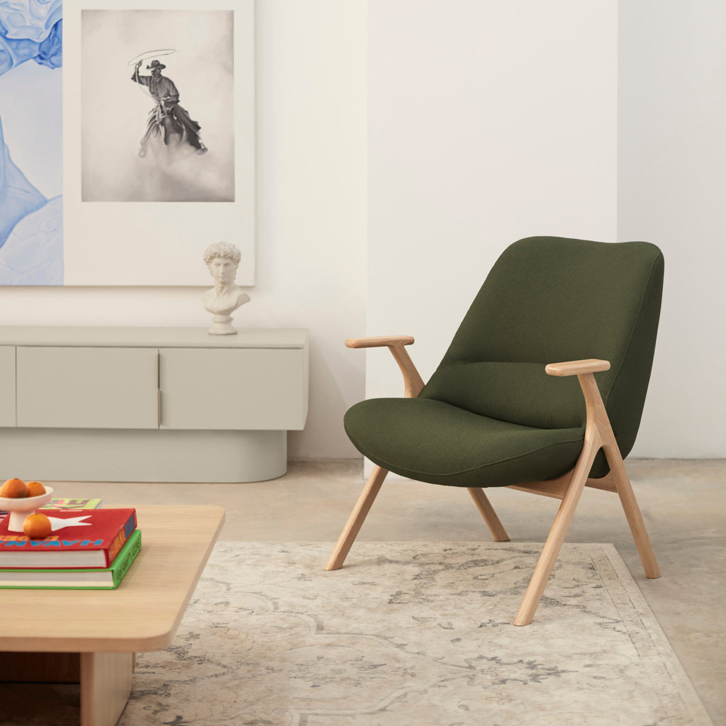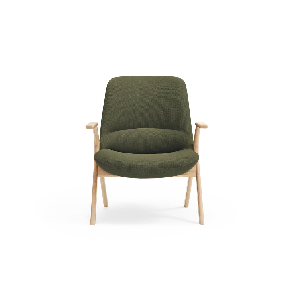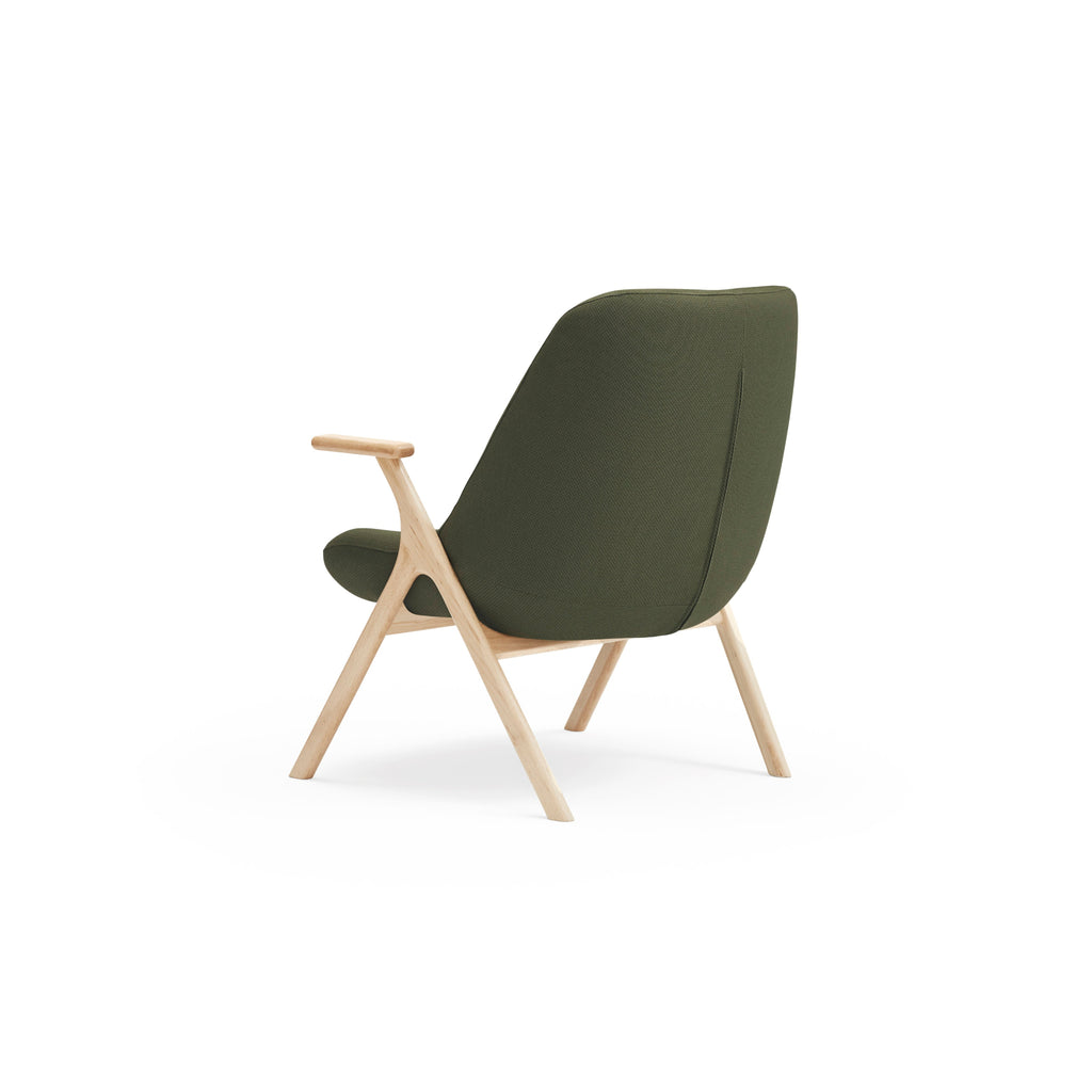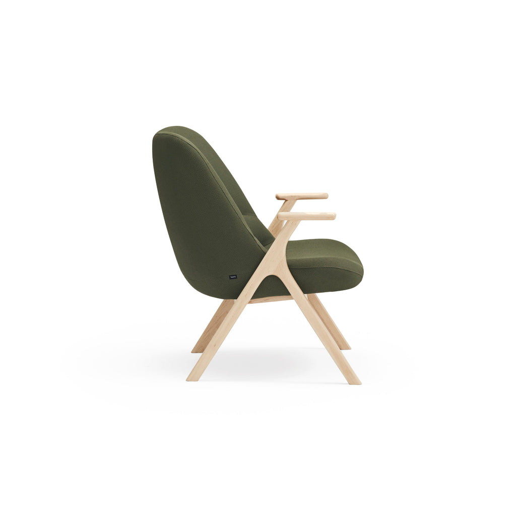 The Dins Armchair offers a stylish blend of a sleek light wood frame and arms with luxurious dark green RONDO 68226 fabric.