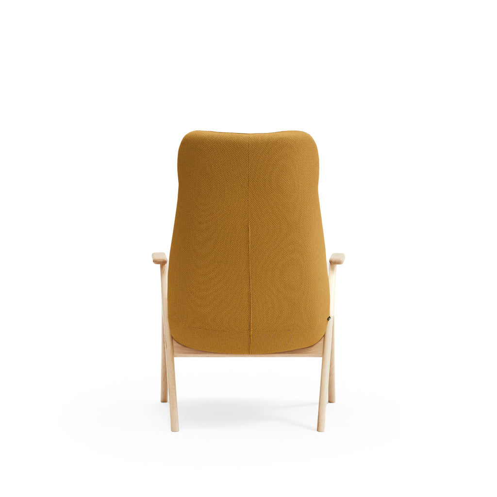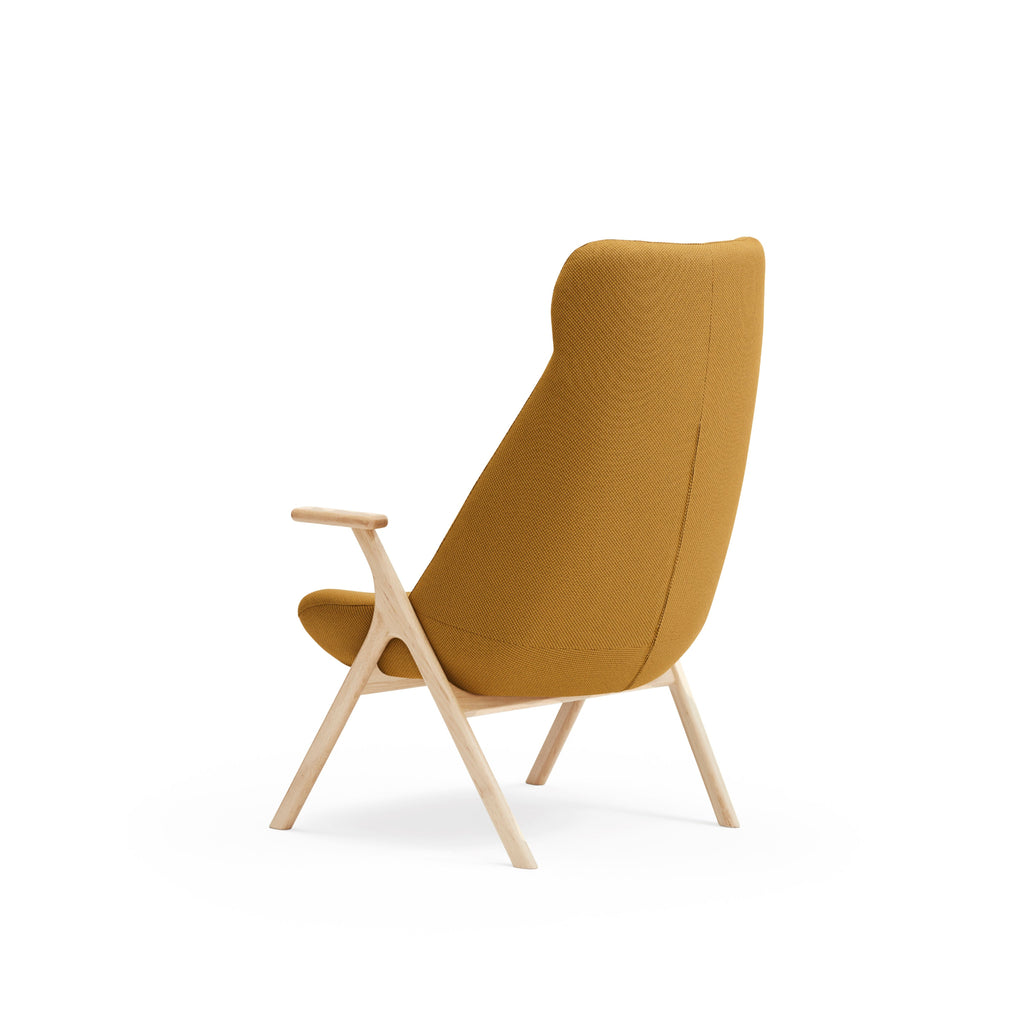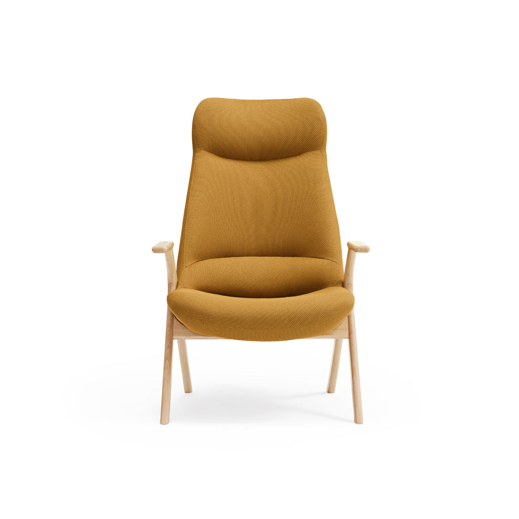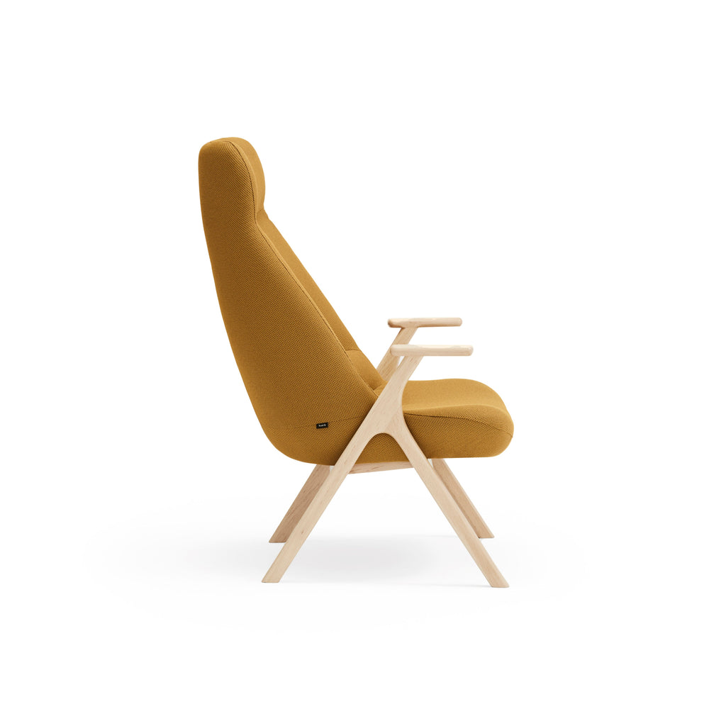 The Dins High Back Armchair offers a stylish blend of a sleek light wood frame and arms with luxurious mustard yellow RONDO 62108 fabric.