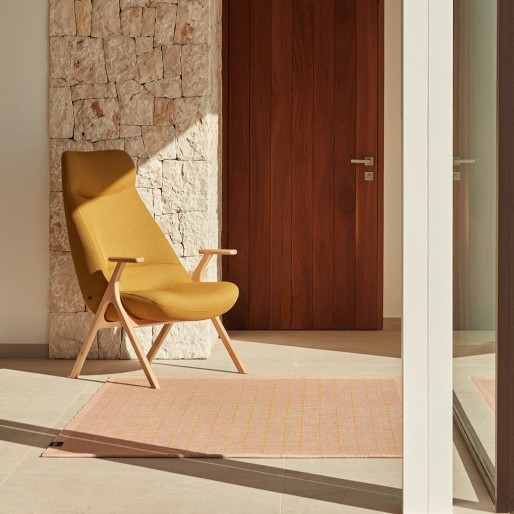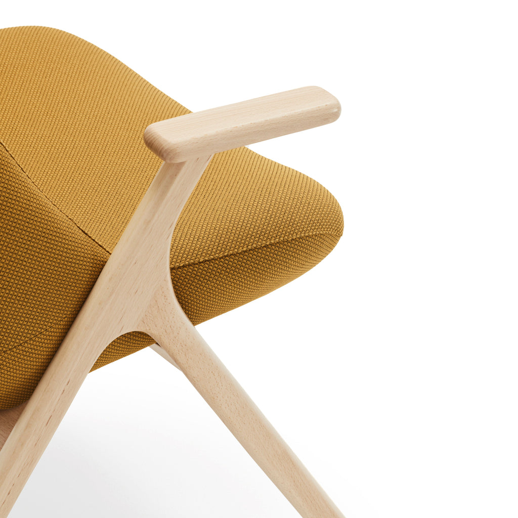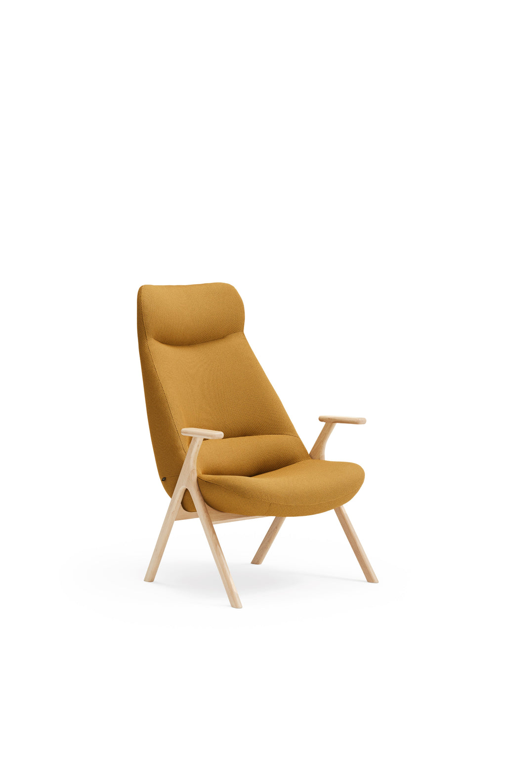 The Dins High Back Armchair offers a stylish blend of a sleek light wood frame and arms with luxurious mustard yellow RONDO 62108 fabric.