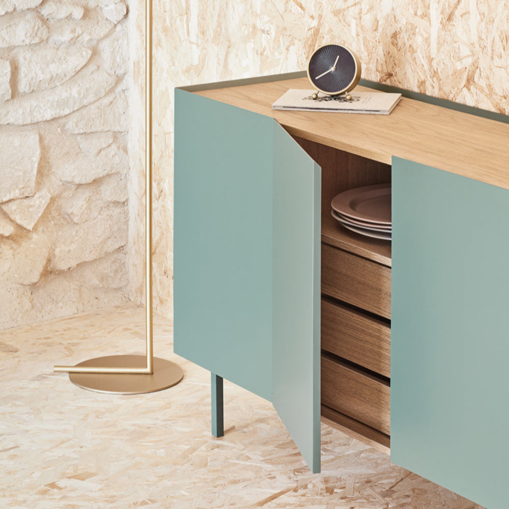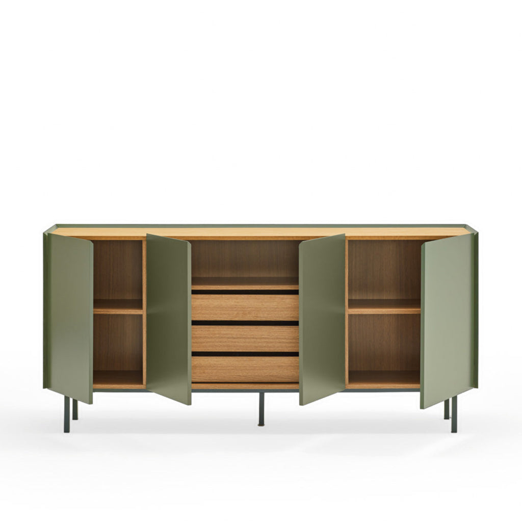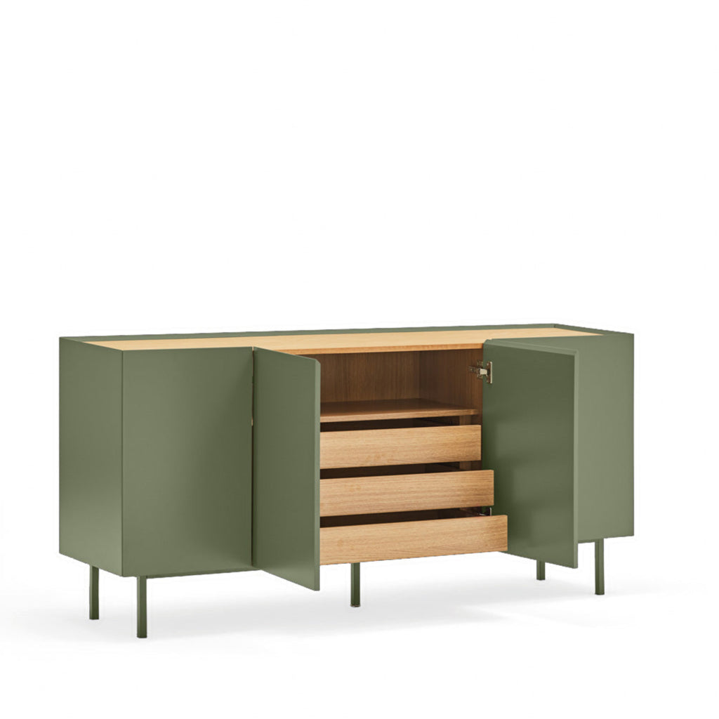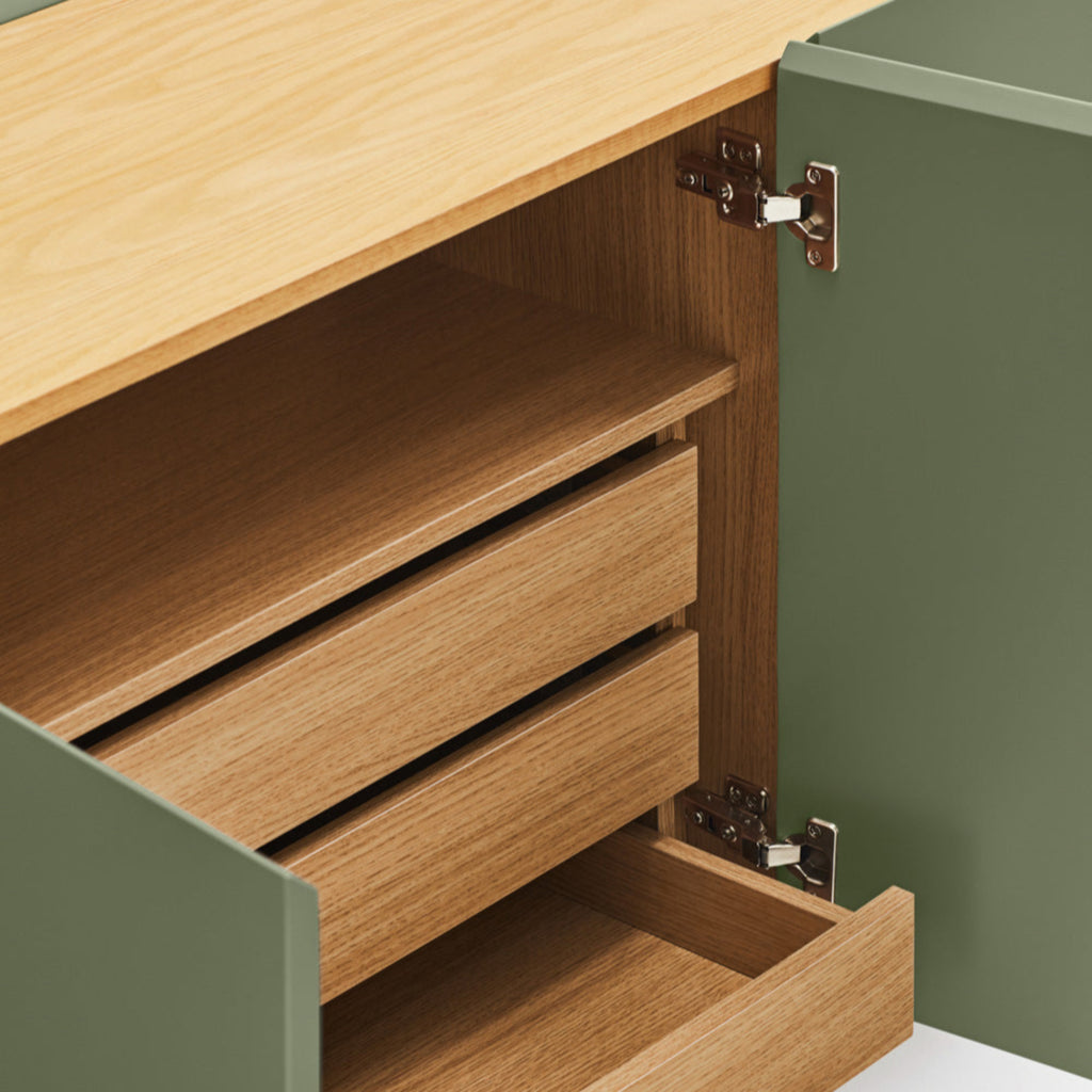 This contemporary piece showcases a stunning contrast between its matt green structure and light oak veneer top, creating an instant focal point in any room. Behind its four elegant doors lies a thoughtfully designed interior—featuring two shelves in the outer compartments and three smooth soft-close drawers plus a shelf behind the central doors. The distinctive raised border adds both style and practicality, keeping your displayed items secure, while the powder-coated metal legs provide sturdy support with sophisticated flair. At 165cm wide, this versatile sideboard offers generous storage without compromising on style—perfect for the modern home that demands both function and aesthetic appeal.