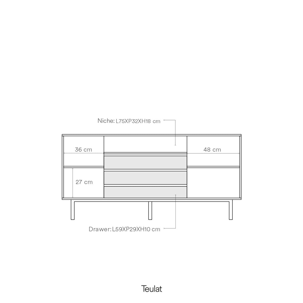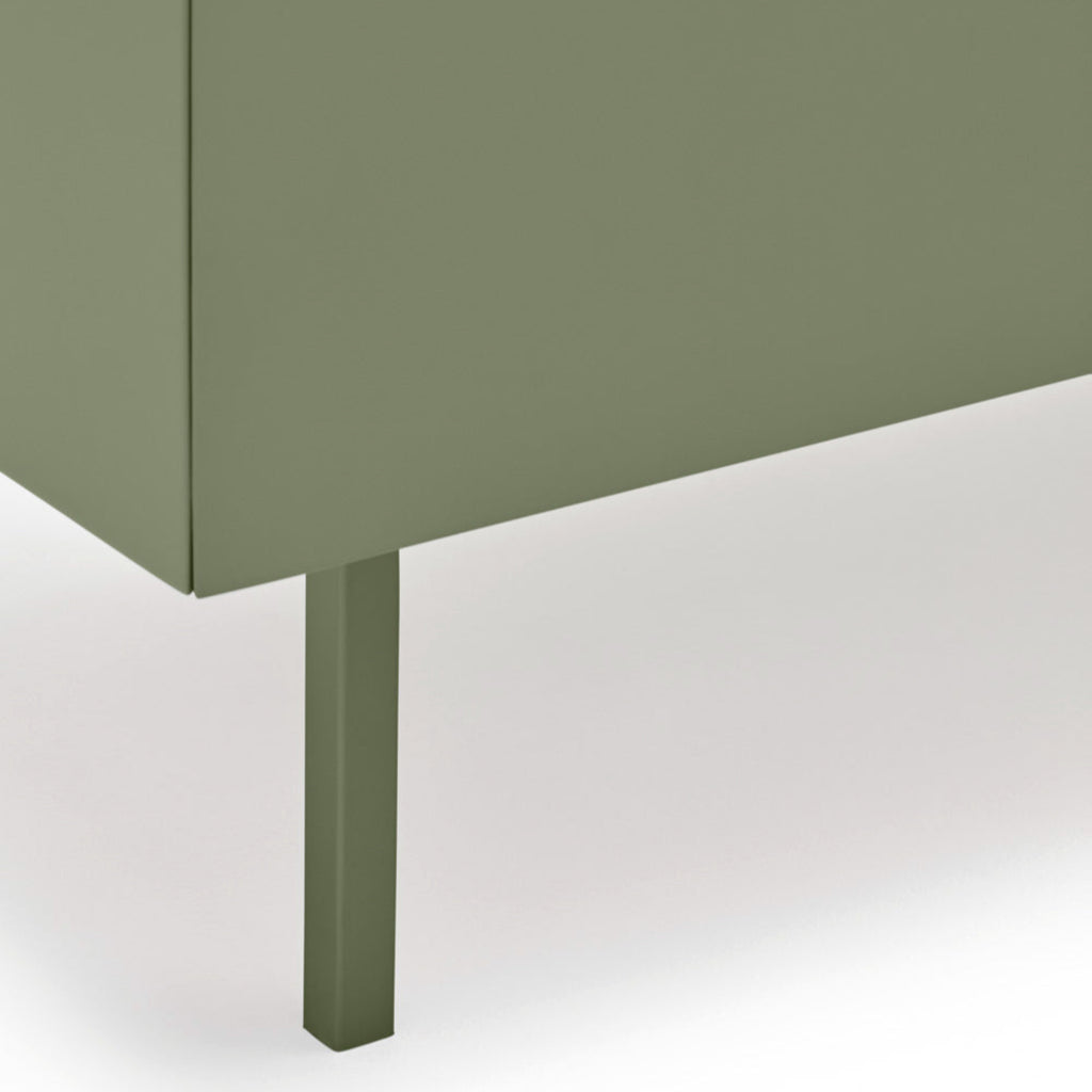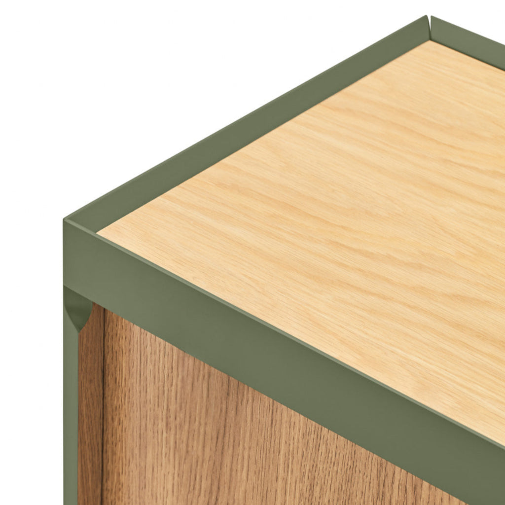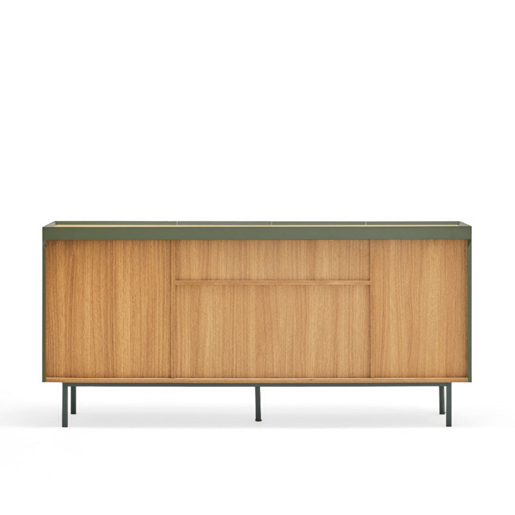 This contemporary piece showcases a stunning contrast between its matt green structure and light oak veneer top, creating an instant focal point in any room. Behind its four elegant doors lies a thoughtfully designed interior—featuring two shelves in the outer compartments and three smooth soft-close drawers plus a shelf behind the central doors. The distinctive raised border adds both style and practicality, keeping your displayed items secure, while the powder-coated metal legs provide sturdy support with sophisticated flair. At 165cm wide, this versatile sideboard offers generous storage without compromising on style—perfect for the modern home that demands both function and aesthetic appeal.