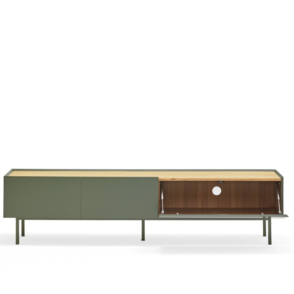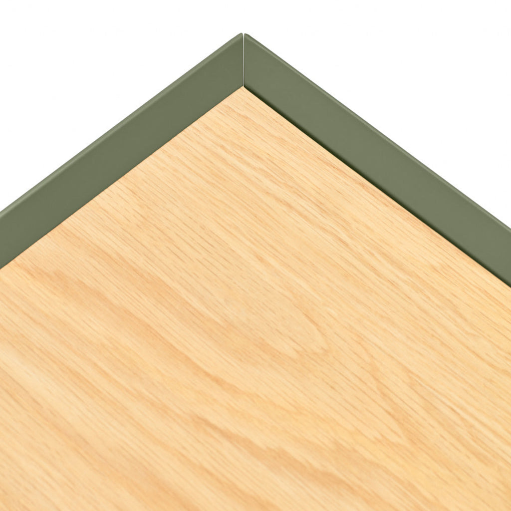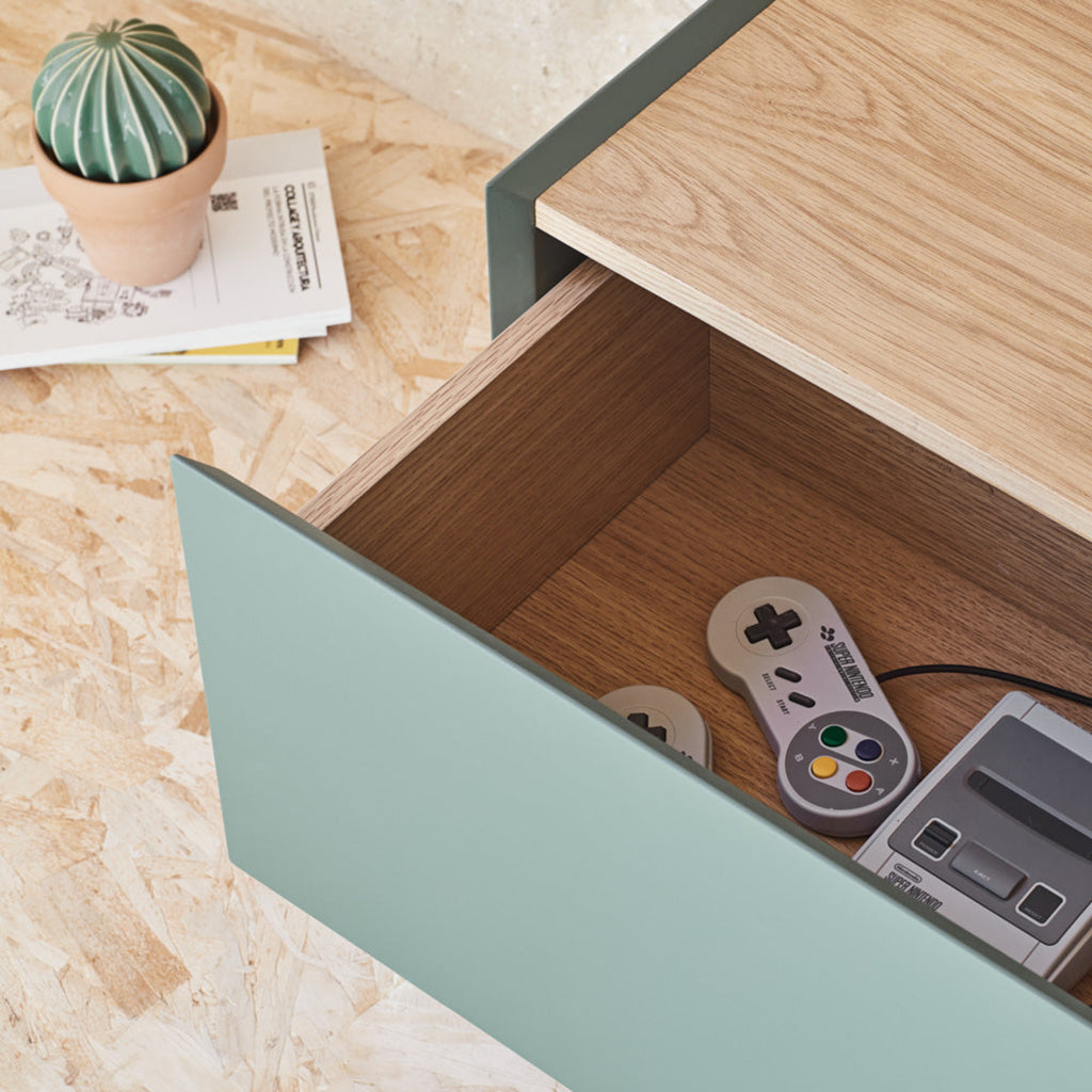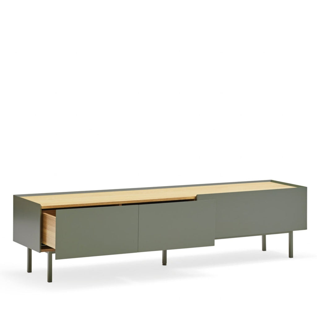The stunning contrast between matt green structure and light oak veneer top creates a contemporary focal point in any room. Featuring two smooth soft-close drawers for discreet storage, plus a practical drop-down door with premium gas pistons for media components. The thoughtful cable management gap eliminates unsightly wires, while the protective raised border keeps electronics secure. Standing on stylish powder-coated metal legs, this substantial media unit (W180 x D40 x H45cm) delivers both practicality and modern aesthetic appeal. Self-assembly required.