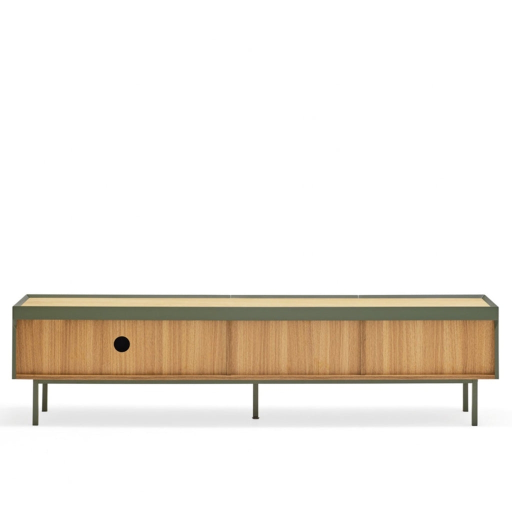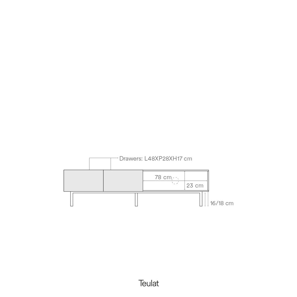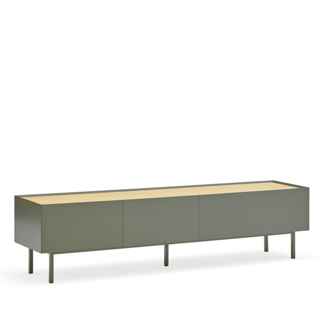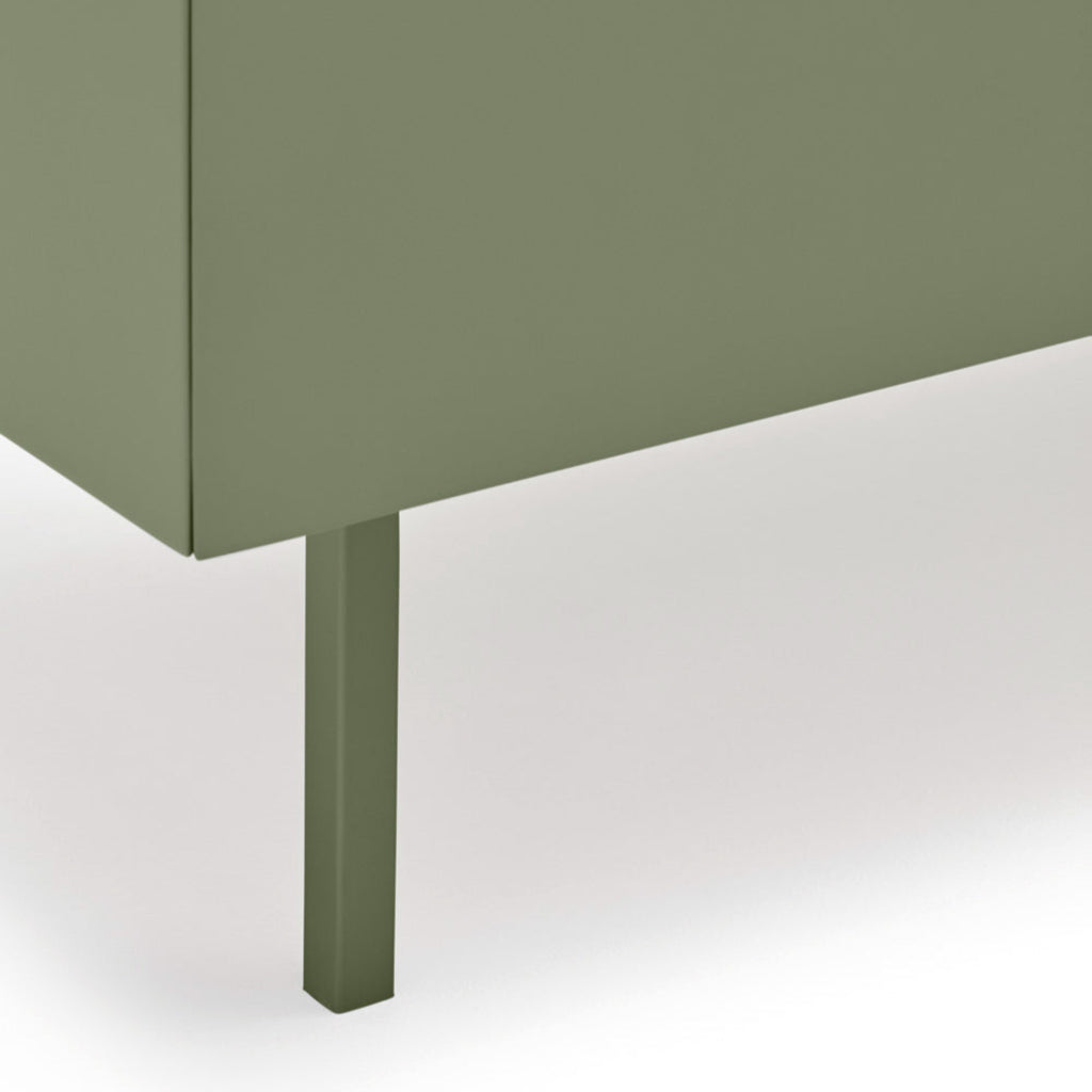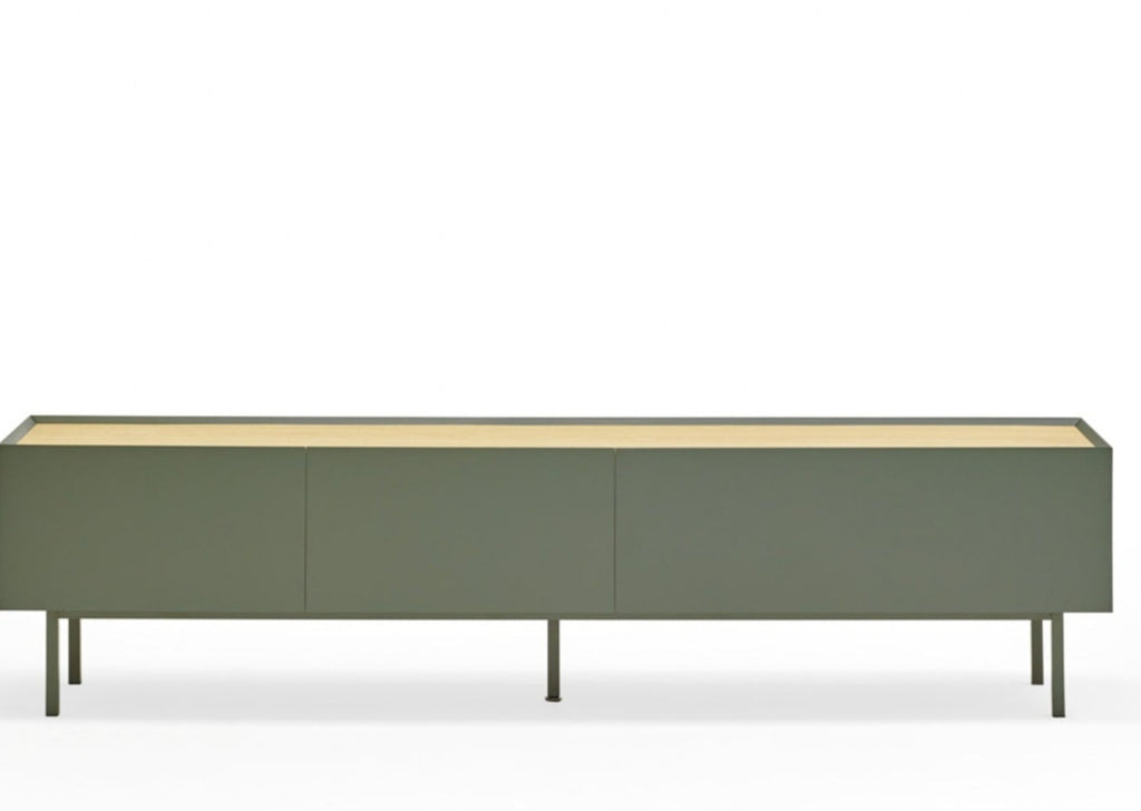 The stunning contrast between matt green structure and light oak veneer top creates a contemporary focal point in any room. Featuring two smooth soft-close drawers for discreet storage, plus a practical drop-down door with premium gas pistons for media components. The thoughtful cable management gap eliminates unsightly wires, while the protective raised border keeps electronics secure. Standing on stylish powder-coated metal legs, this substantial media unit (W180 x D40 x H45cm) delivers both practicality and modern aesthetic appeal. Self-assembly required.
