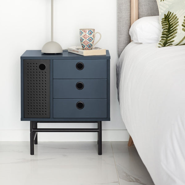 Punto Night Table, Set of Two, Three Drawer, One Industrial Design Metal Door, One Shelf, Wood with Metal Frame - Dark Blue and Matt Black Finish