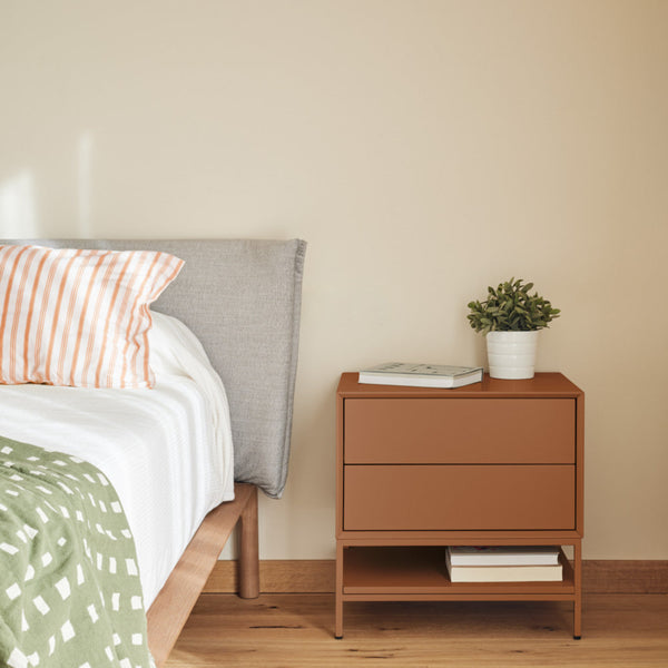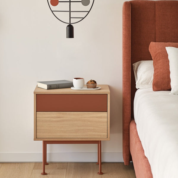 Yoko Night Table, Set of Two, Two Drawers, Modern Wood Design With Metal Frame - Red Brick and Oak Finish