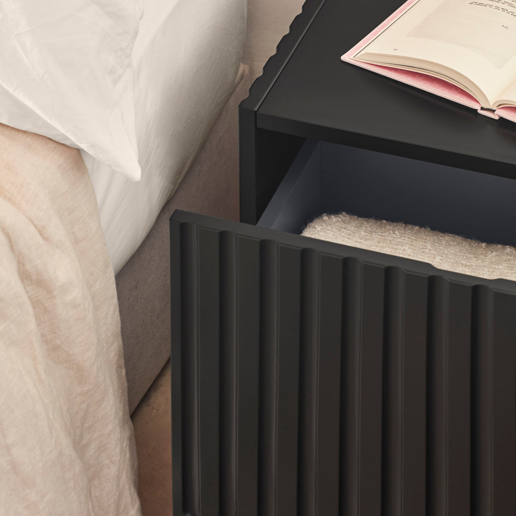 Featuring a crisp black exterior paired with a anthracite interior, these nightstands blend classic charm with modern elegance. Their spacious drawers offer practical storage, keeping your essentials within easy reach while maintaining a clean, organized look. Perfect for adding a touch of sophistication and functionality to your bedside, these tables are designed to complement a variety of decor styles effortlessly.