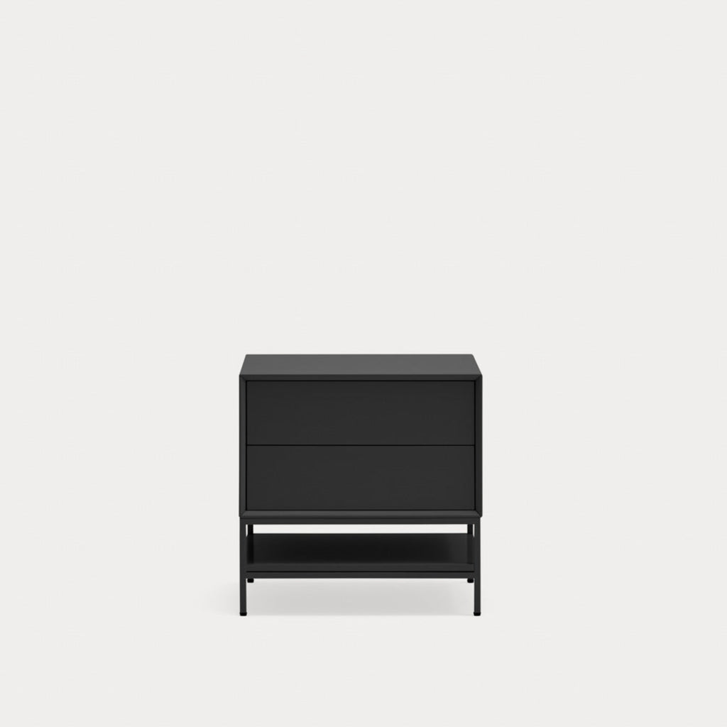 These sleek black tables feature two spacious drawers for bedside essentials, complemented by a stylish metal shelf and frame. Crafted from high-quality lacquered MDF with elegant metal legs, these 55cm square tables blend functionality with sophisticated Spanish design. Perfect for contemporary interiors, this Teulat pair arrives ready for self-assembly and is delivered by professional UK furniture carriers. Transform your bedroom with these versatile, space-efficient nightstands that combine storage convenience with refined style.