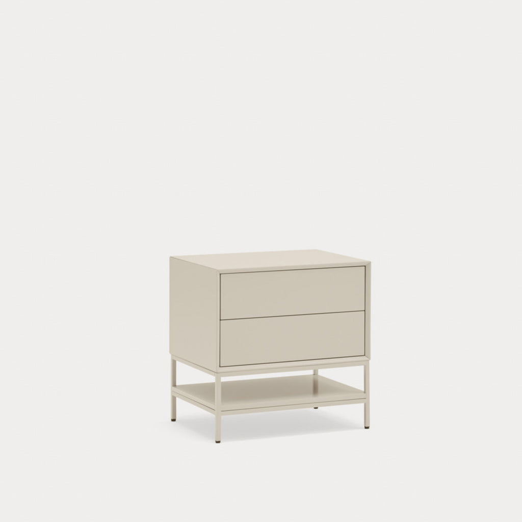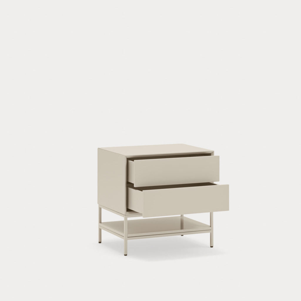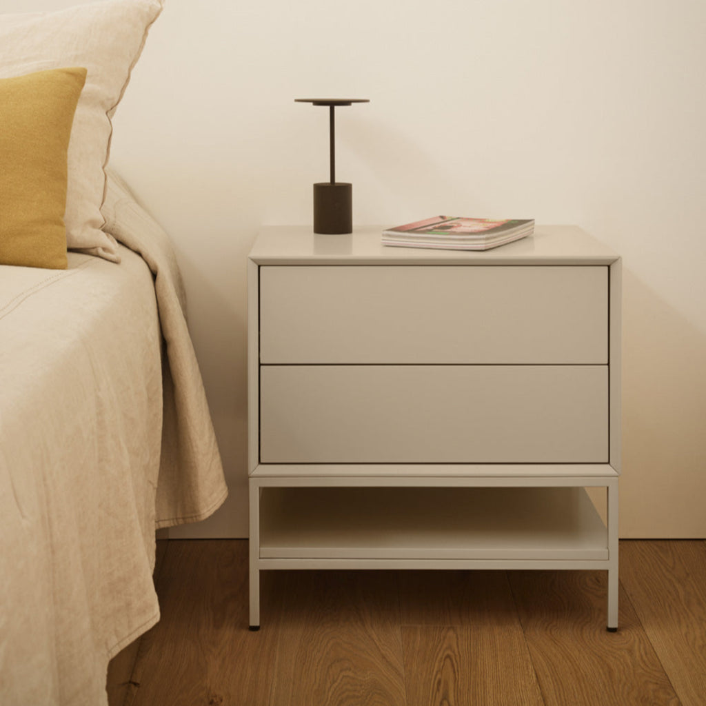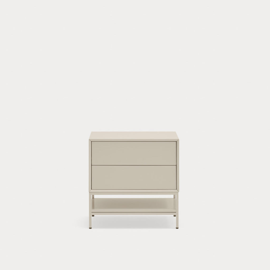 These sleek sand tables feature two spacious drawers for bedside essentials, complemented by a stylish metal shelf and frame. Crafted from high-quality lacquered MDF with elegant metal legs, these 55cm square tables blend functionality with sophisticated Spanish design. Perfect for contemporary interiors, this Teulat pair arrives ready for self-assembly and is delivered by professional UK furniture carriers. Transform your bedroom with these versatile, space-efficient nightstands that combine storage convenience with refined style.