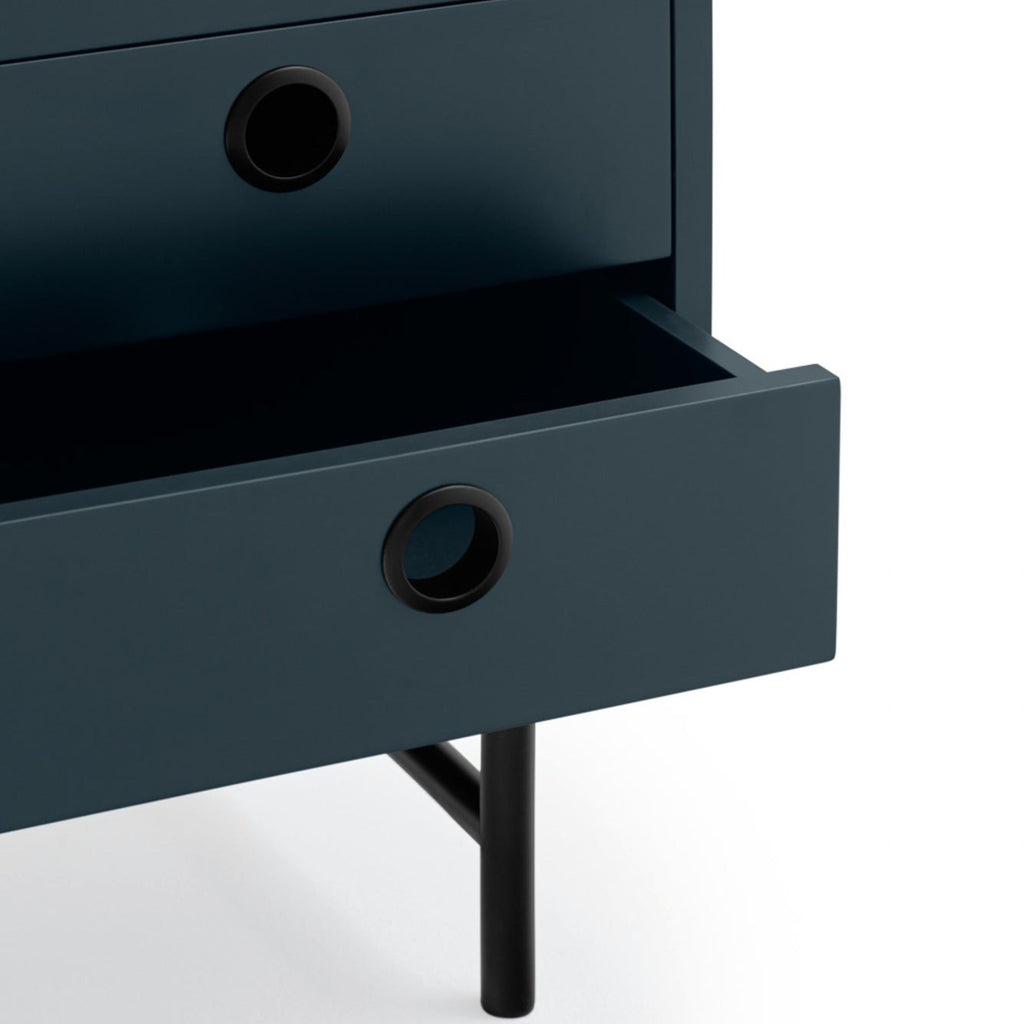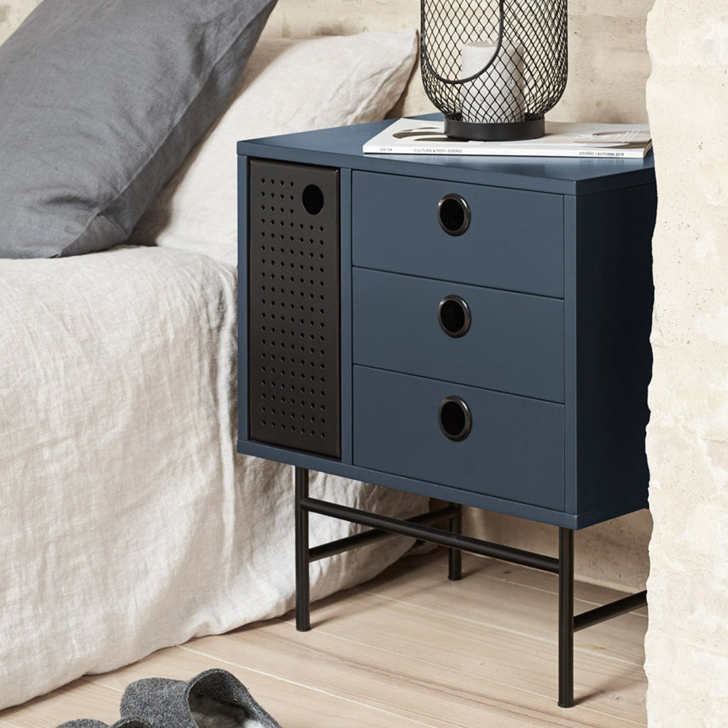 These contemporary pieces blend industrial edge with practical luxury, featuring three soft-close drawers in sumptuous dark blue lacquer and a distinctive matt black perforated metal door revealing hidden storage shelves. The flush circular handles elegantly unite the contrasting elements, while sturdy powder-coated metal legs provide stability with style. At W 48 cm x D 38 cm x H 55 cm, these night tables offer the perfect balance of form and function for modern living.