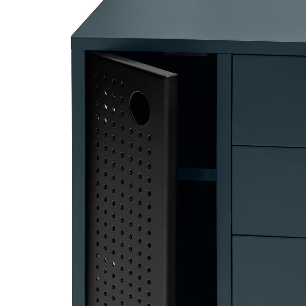 Lacquered MDF structure; Perforated metal doors; MDF inner shelves, drawers; Powder Coated Metal legs