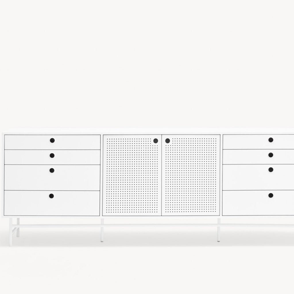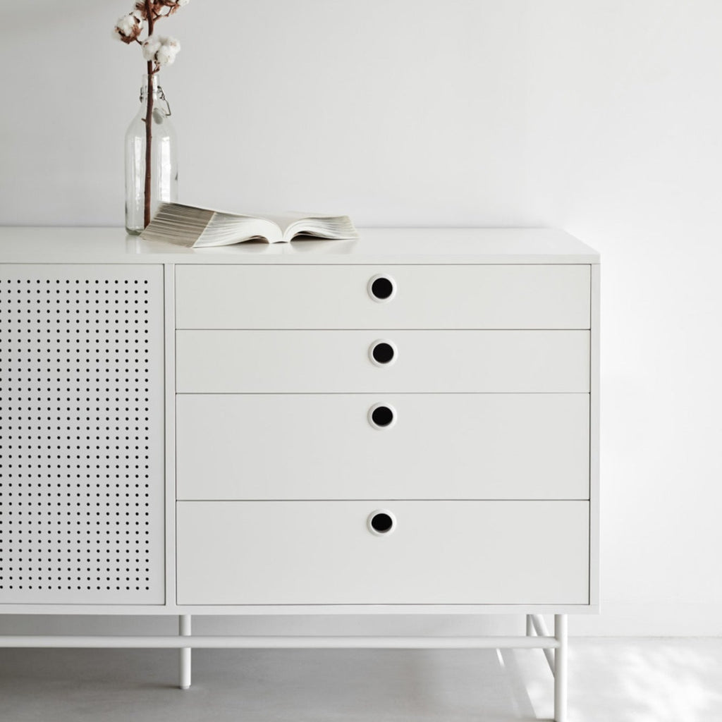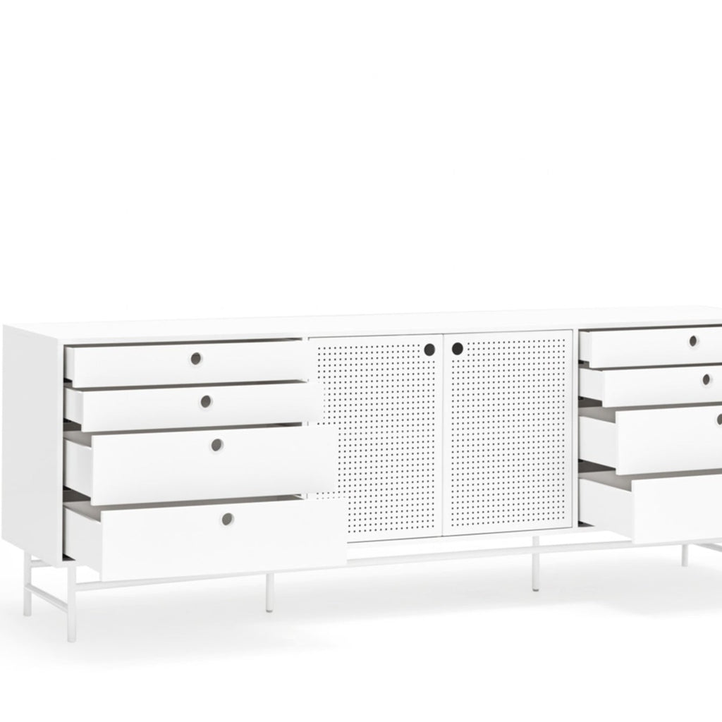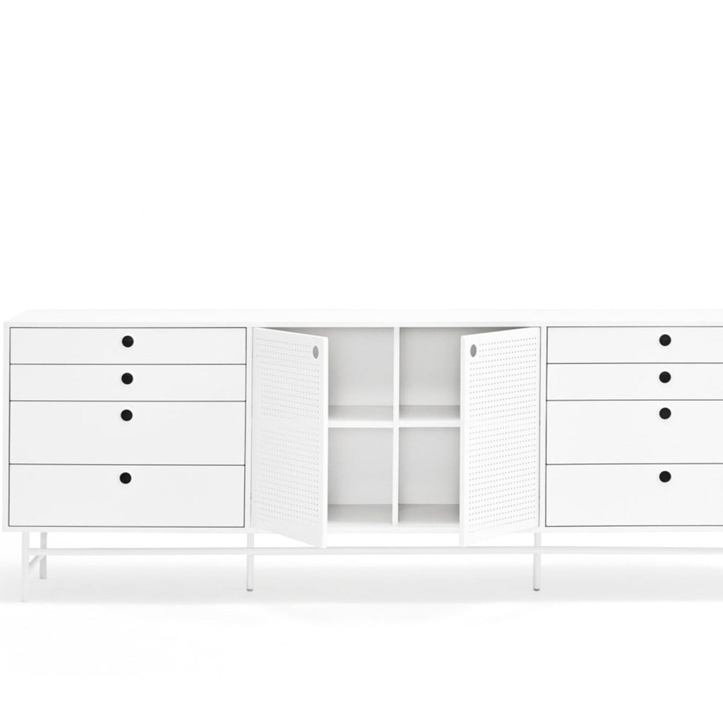 The dramatic interplay between rich matt white lacquered drawers and contemporary matt white perforated metal doors creates an unforgettable visual impact that elevates any interior. Experience unparalleled organization with eight spacious drawers for everyday essentials, complemented by four concealed shelves behind the statement metal doors—perfect for displaying cherished collections or tucking away items out of sight. The thoughtfully designed circular handles create a seamless connection between contrasting elements, while the sturdy powder-coated metal legs provide both stability and sleek style. This innovative sideboard doesn't just meet your storage needs—it exceeds them while simultaneously transforming your space with its bold character and exceptional craftsmanship that will impress for years to come.