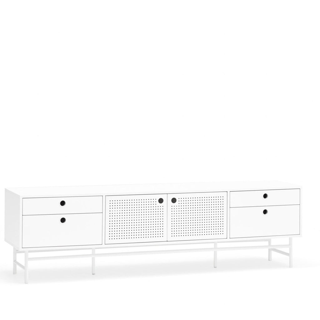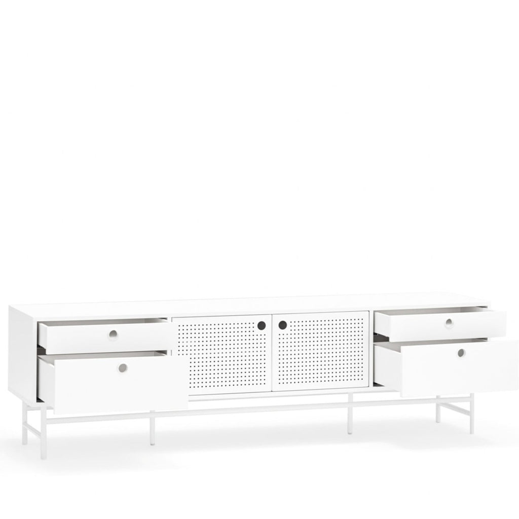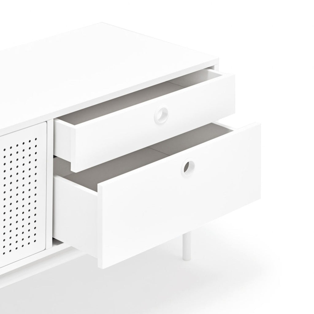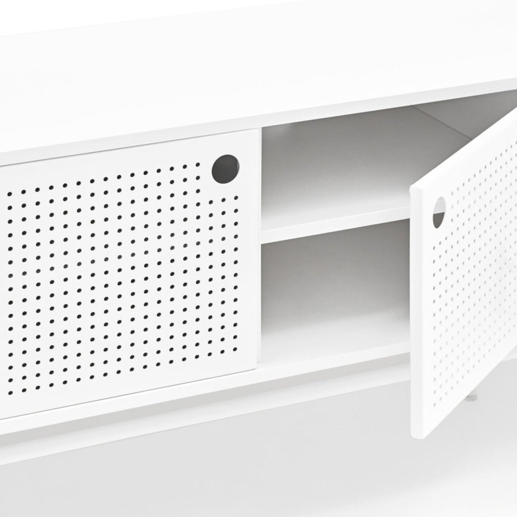 The Punto TV Stand merges industrial design with contemporary elegance, featuring perforated matt white metal doors concealing four shelves with cable management.