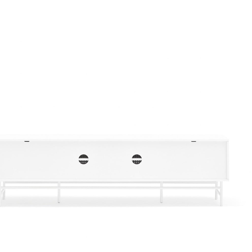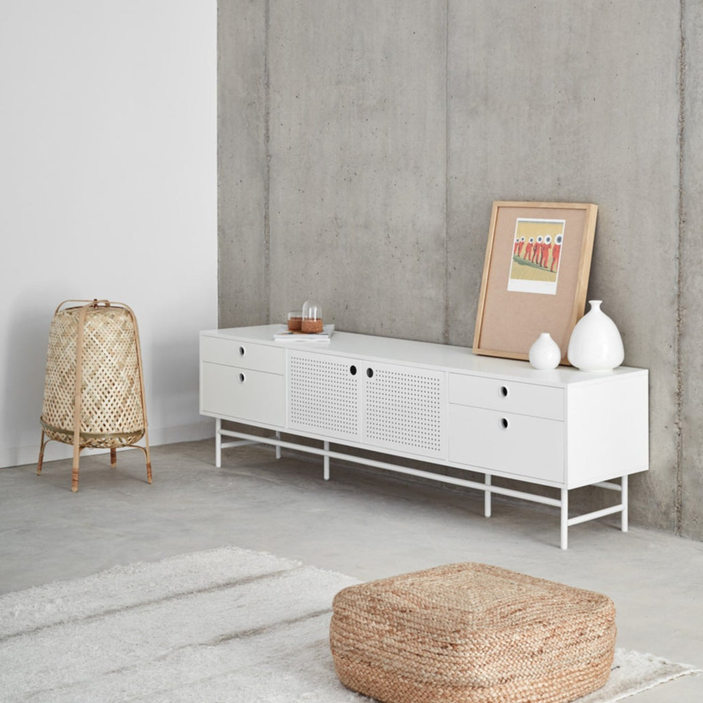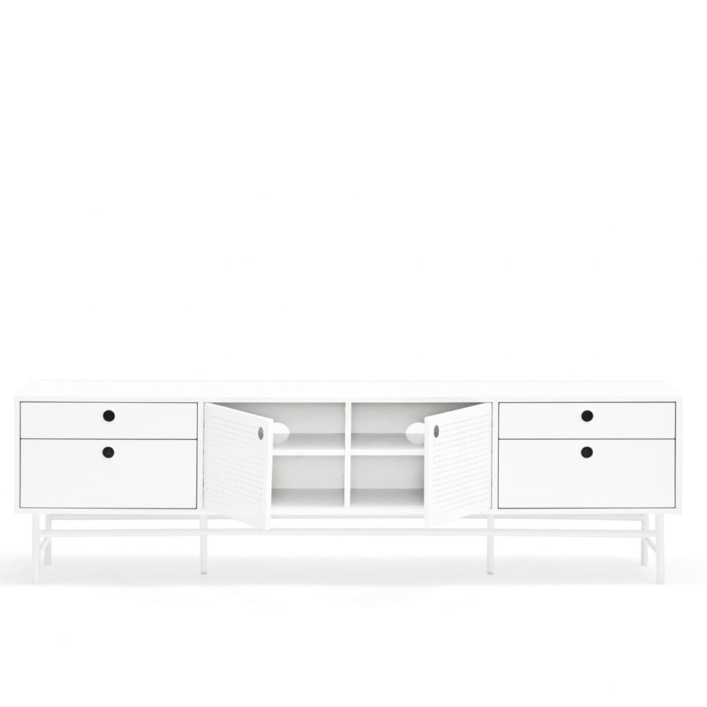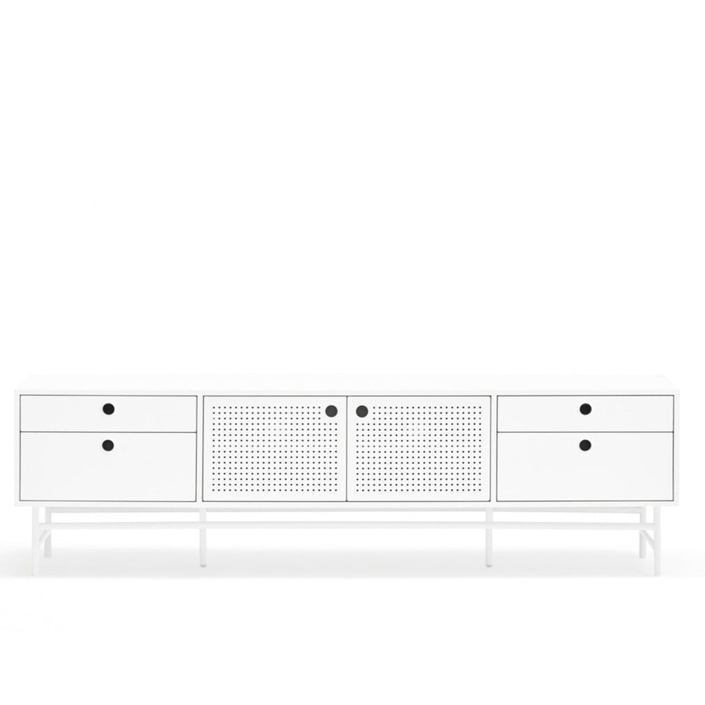 The Punto TV Stand merges industrial design with contemporary elegance, featuring perforated matt white metal doors concealing four shelves with cable management.