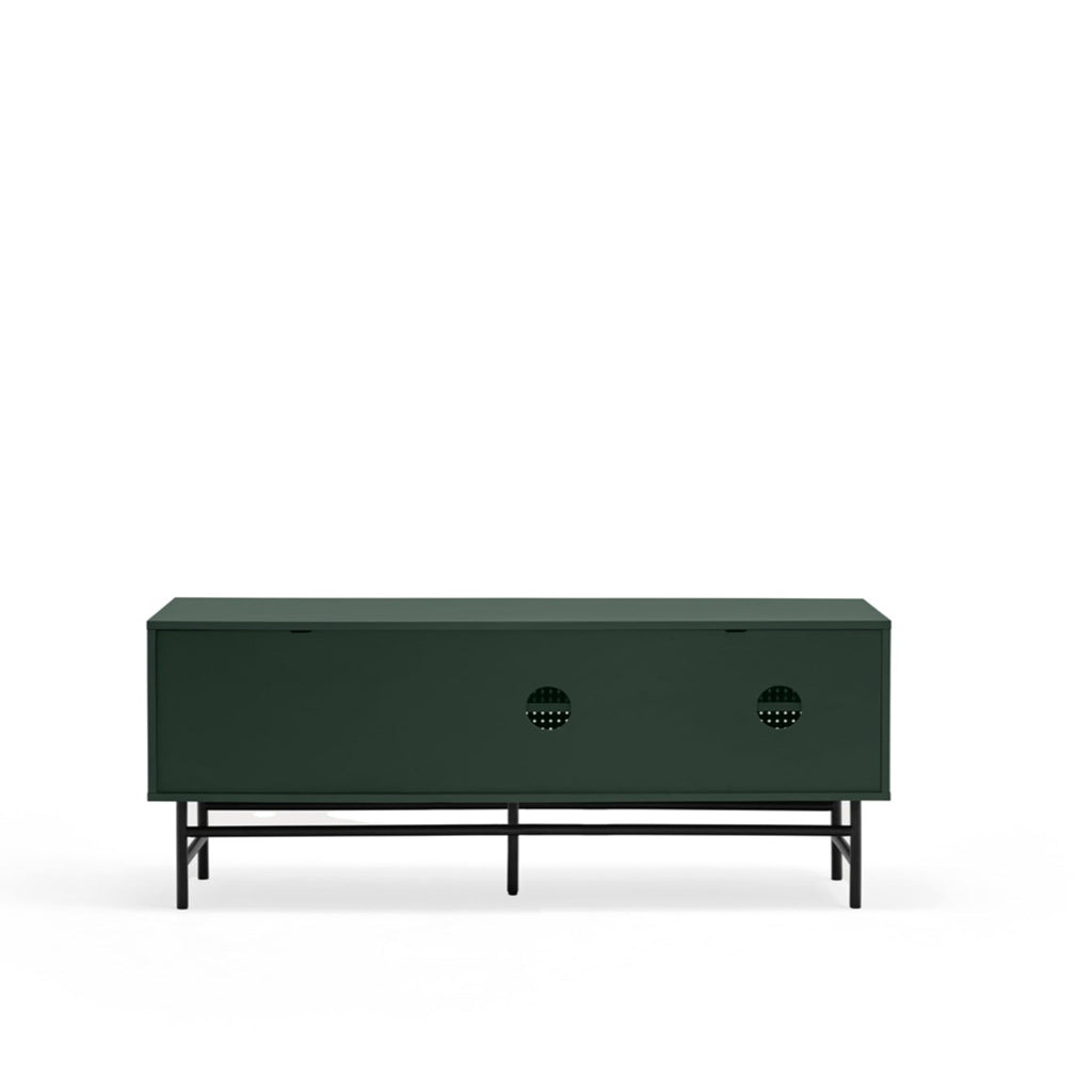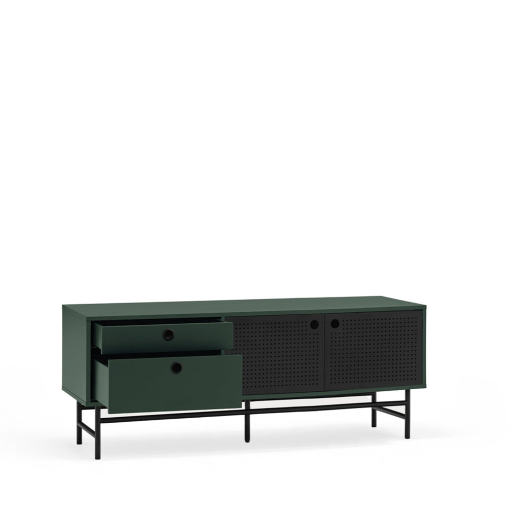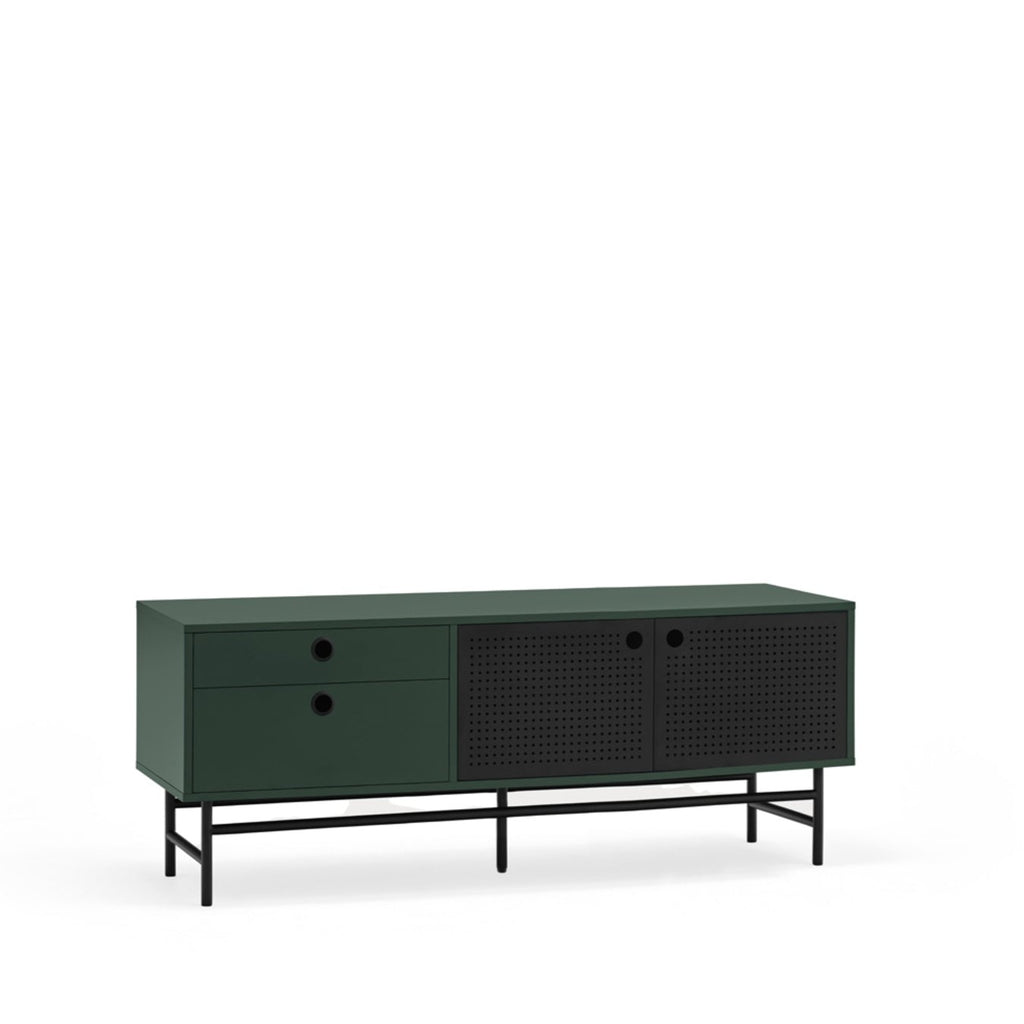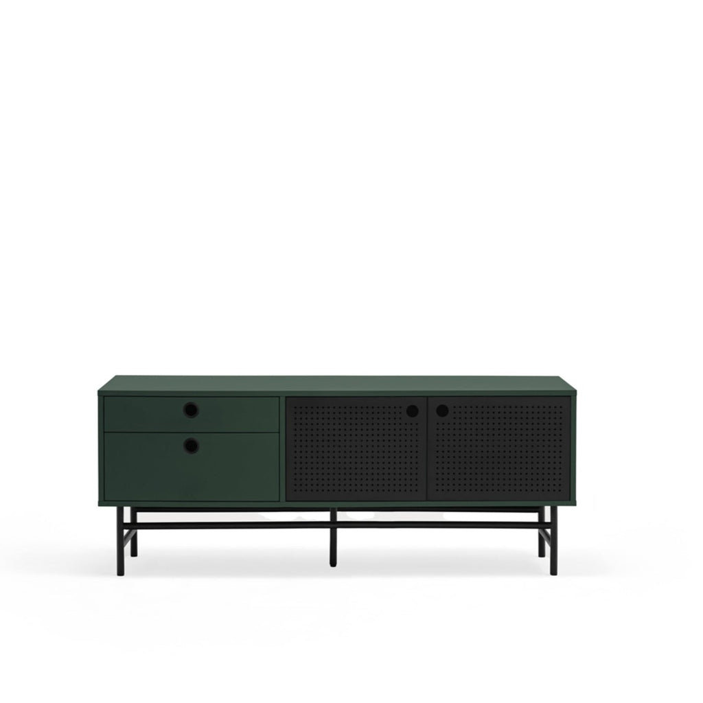 Featuring perforated matt black metal doors concealing two shelves with cable management, plus two rich dark green lacquered MDF drawers with flush circular handles. The sturdy metal frame with powder-coated black legs provides stability and completes this innovative piece. Perfect for modern living spaces where style meets functionality.