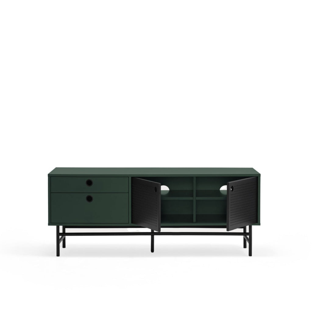 Punto TV Stand, Two Drawers, Two Industrial Design Metal Doors, Wood with Metal Frame, AV Access Point - Dark Green and Matt Black Finish