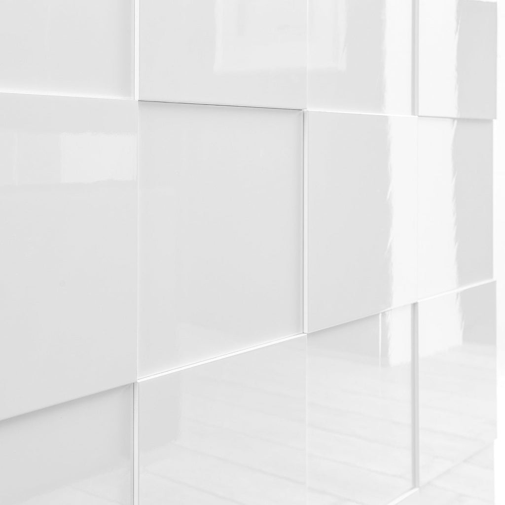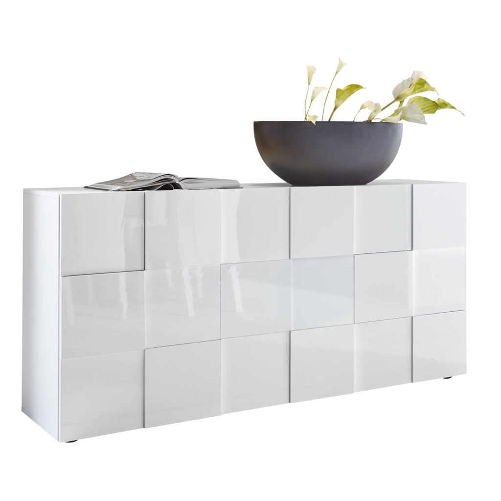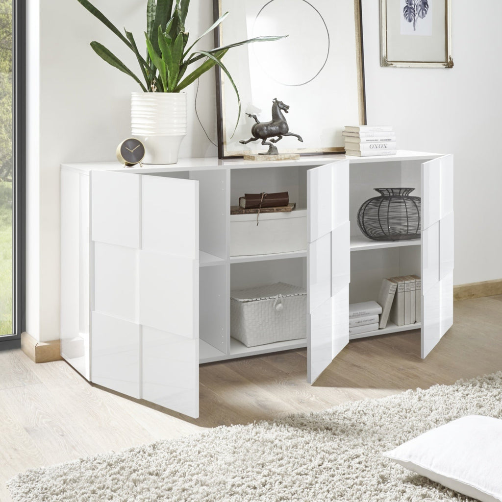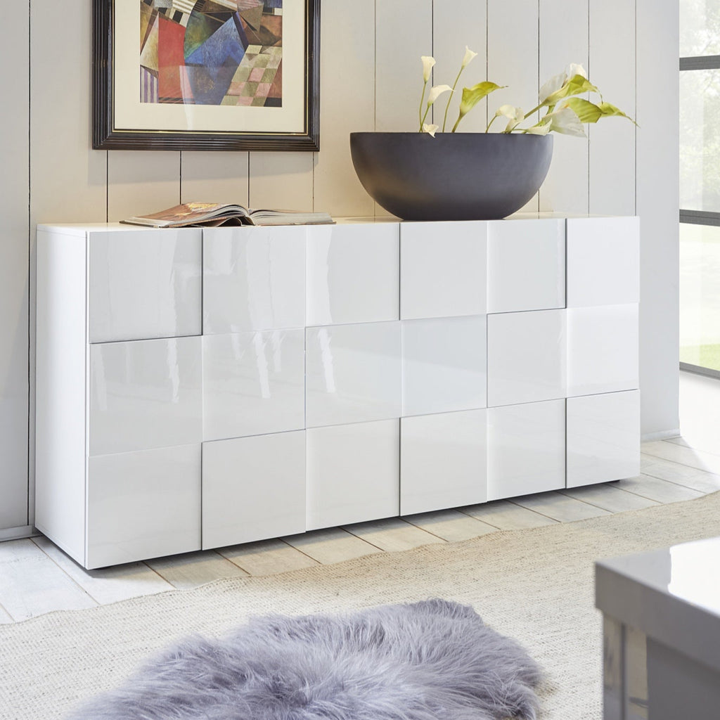 The Donato Sideboard features a striking high gloss white lacquer finish with a distinctive chequerboard pattern on its three right-opening doors.