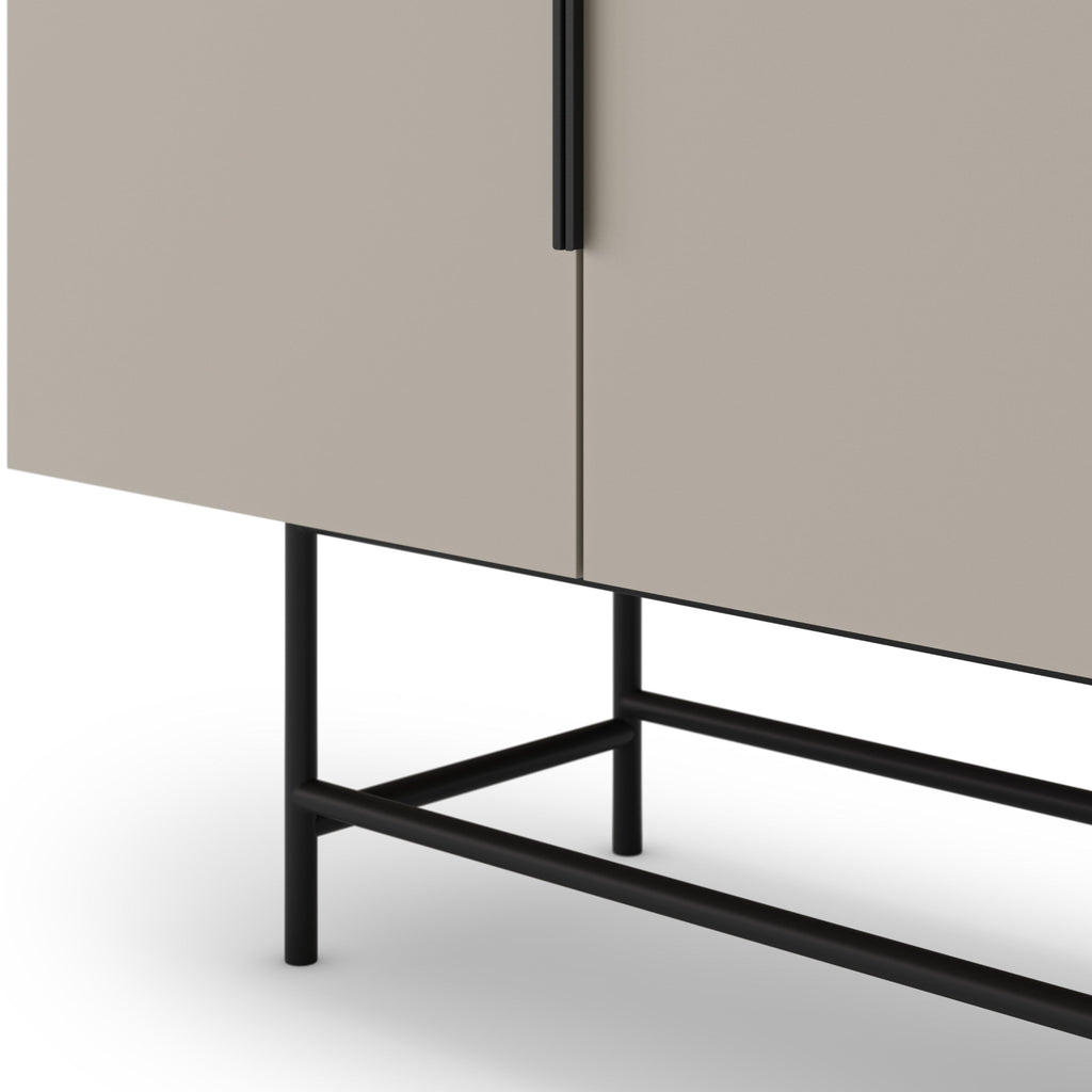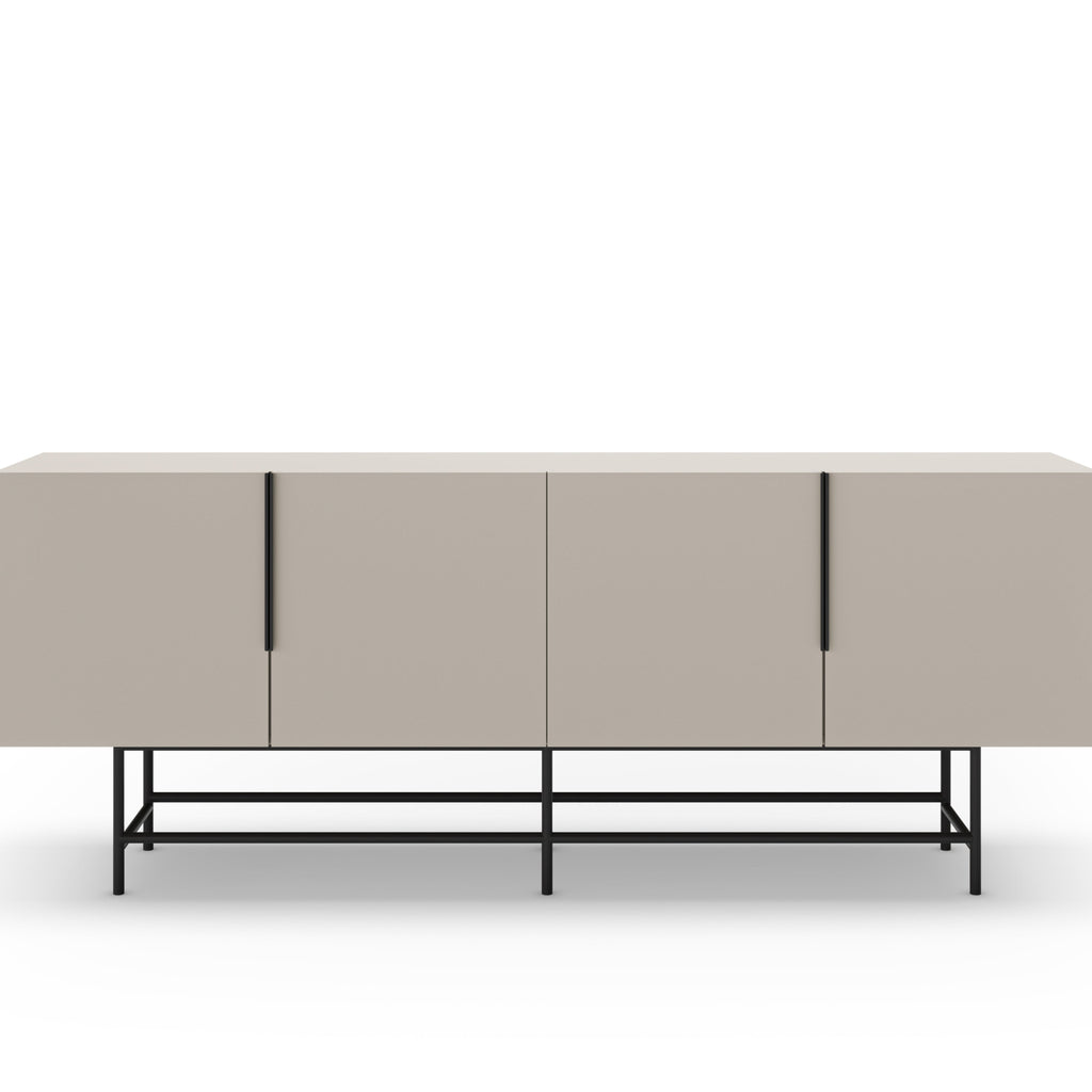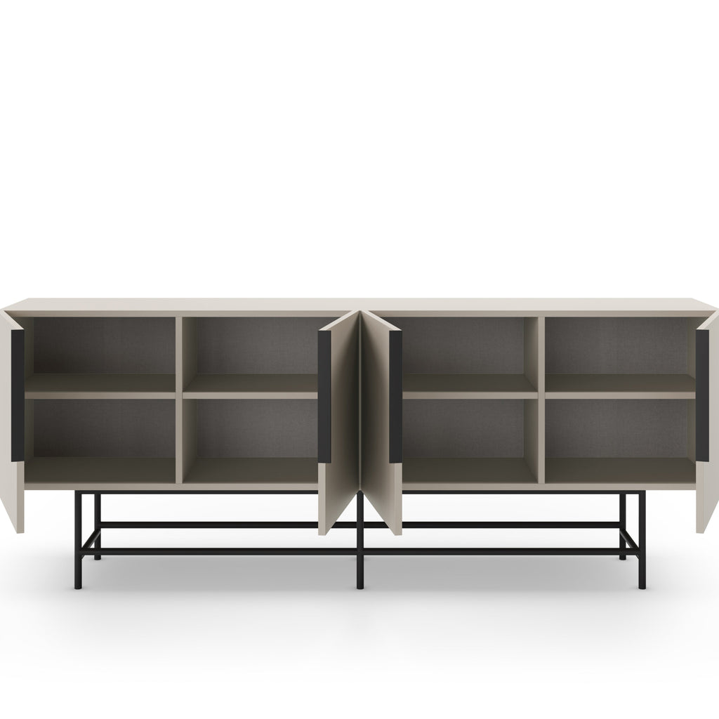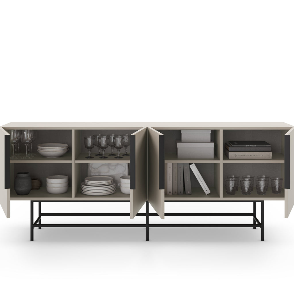 Its four cream MDF and metal doors open to reveal spacious internal shelves, ideal for organising your essentials. Supported by a sleek black metal frame, this sideboard adds a contemporary touch to any room while ensuring durability. Elevate your living space with this stylish and functional piece designed to complement modern interiors.
