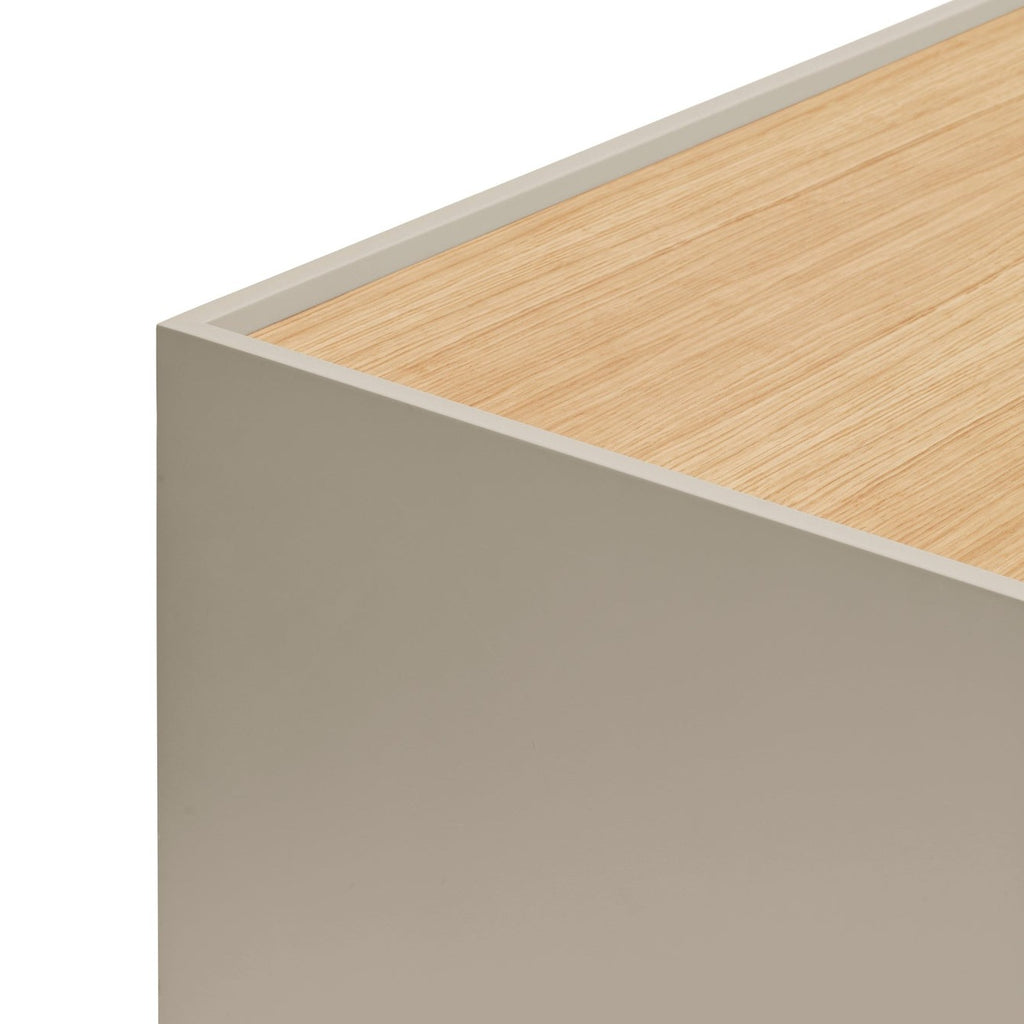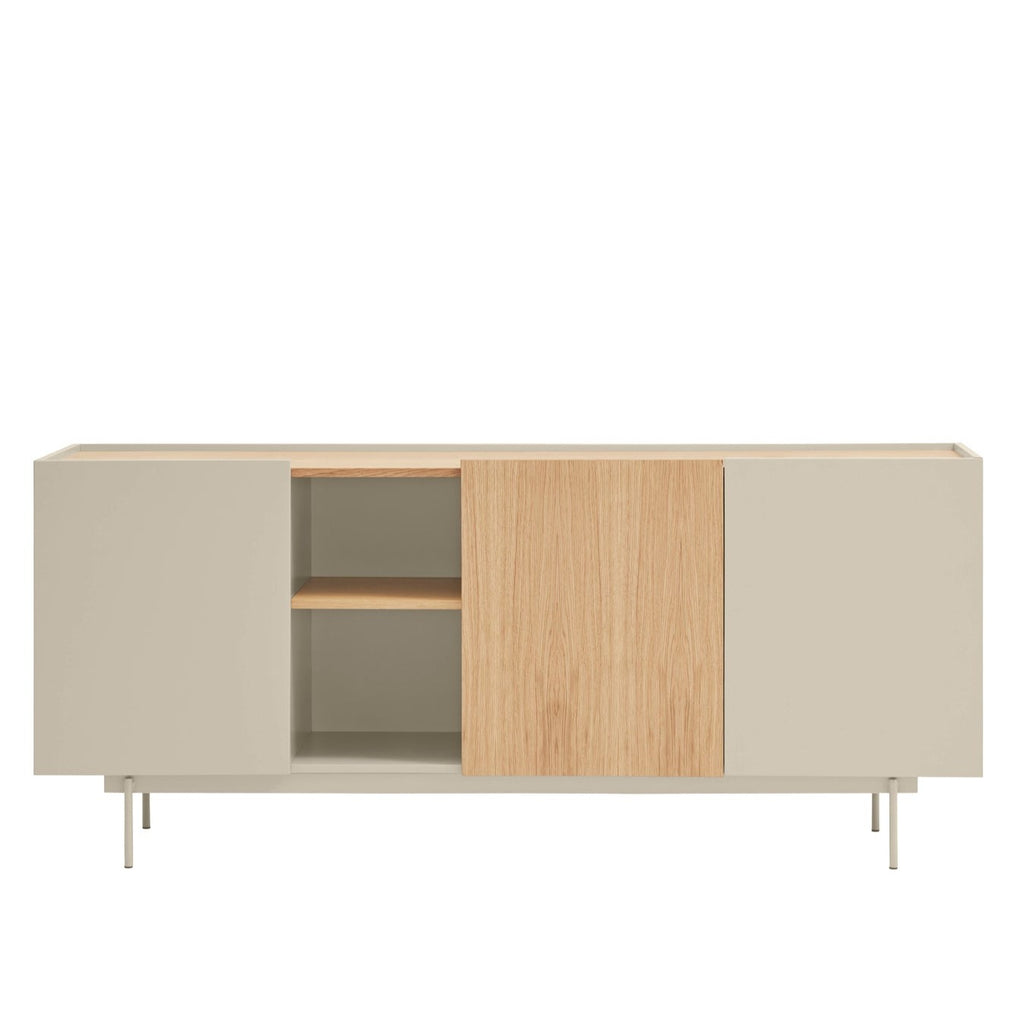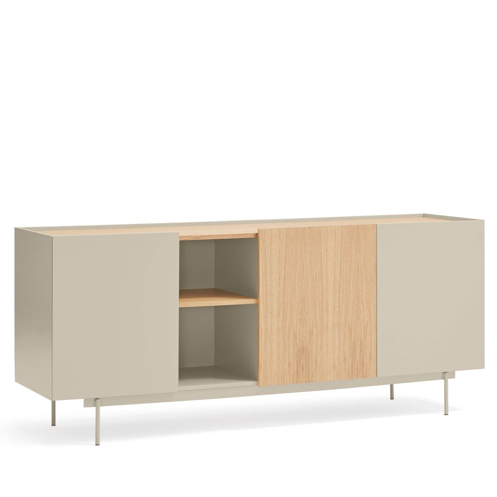 This contemporary storage solution features a sleek sand MDF structure with soft-close doors on both sides, an elegant oak-finished open shelf section, and three hidden drawers behind the center oak door. The stunning oak top creates a beautiful contrast against the sand metal frame, making this piece a standout addition to any room. Measuring 180cm wide, this spacious sideboard provides ample storage while enhancing your décor. Invest in quality craftsmanship that elevates your living space. Professional UK delivery included, with simple self-assembly required.