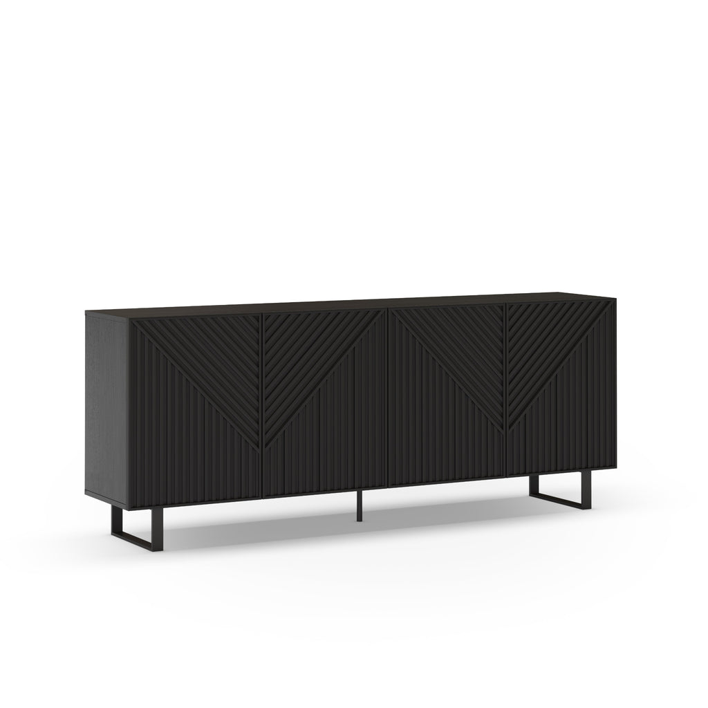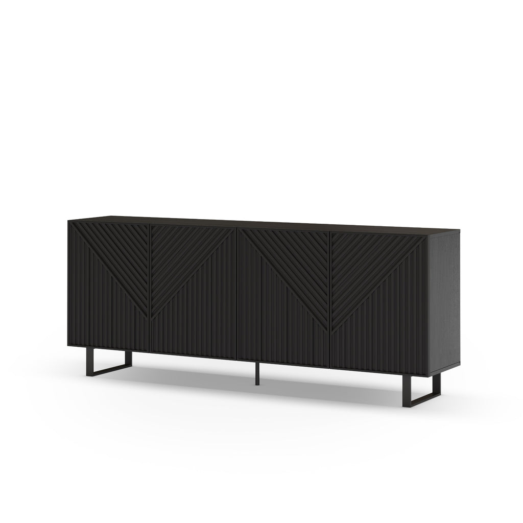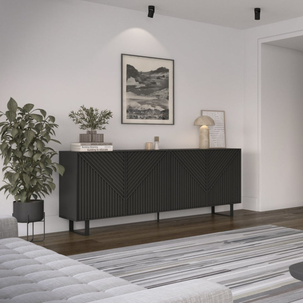 The Peta Sideboard combines modern style with practical storage, featuring four chevron-patterned doors and sleek curved metal legs in a striking black finish.