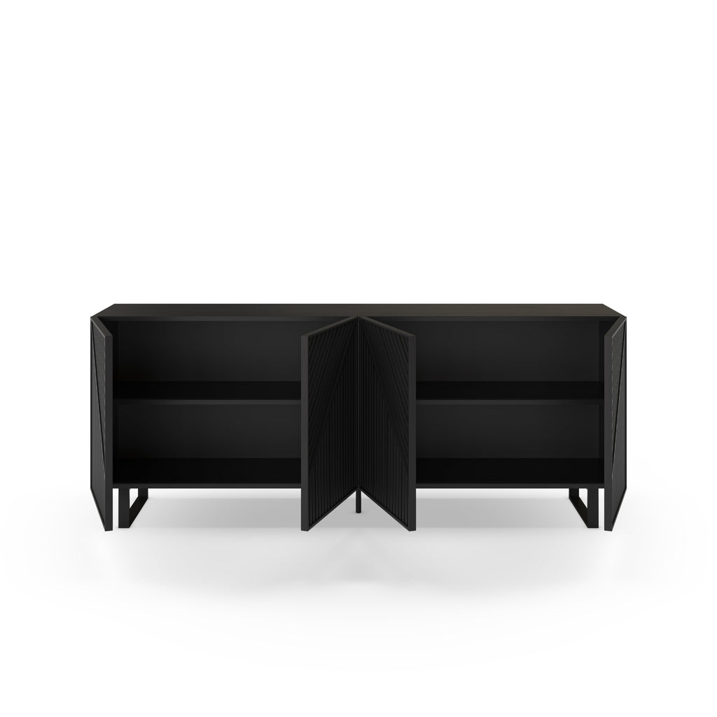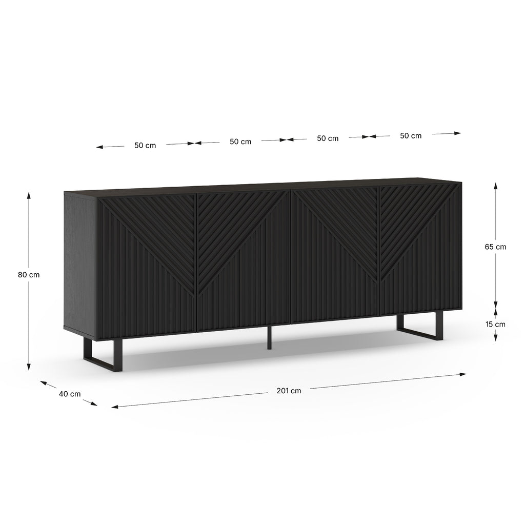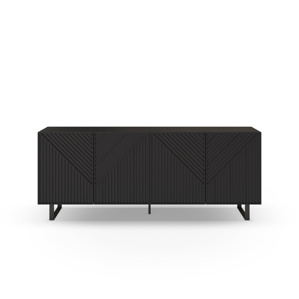 The Peta Sideboard combines modern style with practical storage, featuring four chevron-patterned doors and sleek curved metal legs in a striking black finish.
