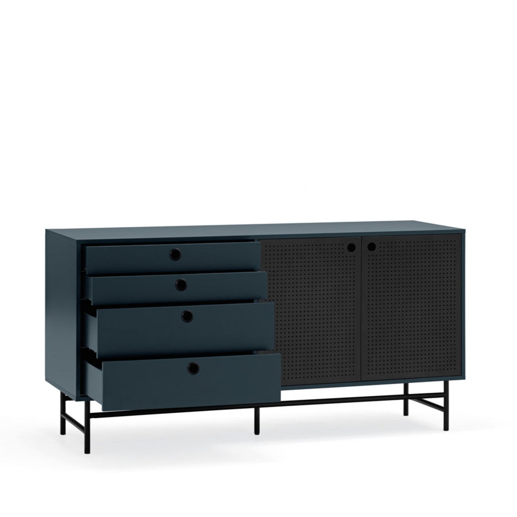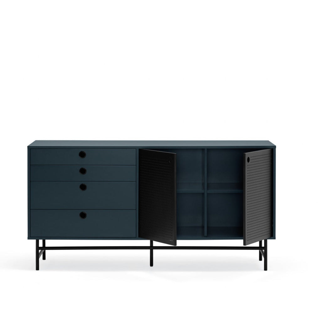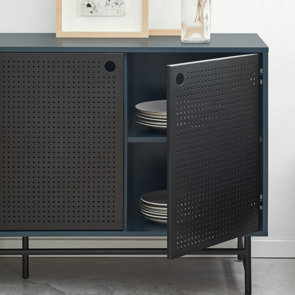 The eye-catching matt black perforated metal doors conceal four spacious shelves, while four sumptuous dark blue lacquered drawers provide sophisticated storage solutions. Elegant circular flush handles seamlessly unite these contrasting elements, creating a harmonious visual flow. Standing on sleek powder-coated metal legs, this 150cm wide masterpiece combines generous proportions with contemporary flair. Invite admiration into your living space with this versatile sideboard that effortlessly balances industrial edge with refined elegance.