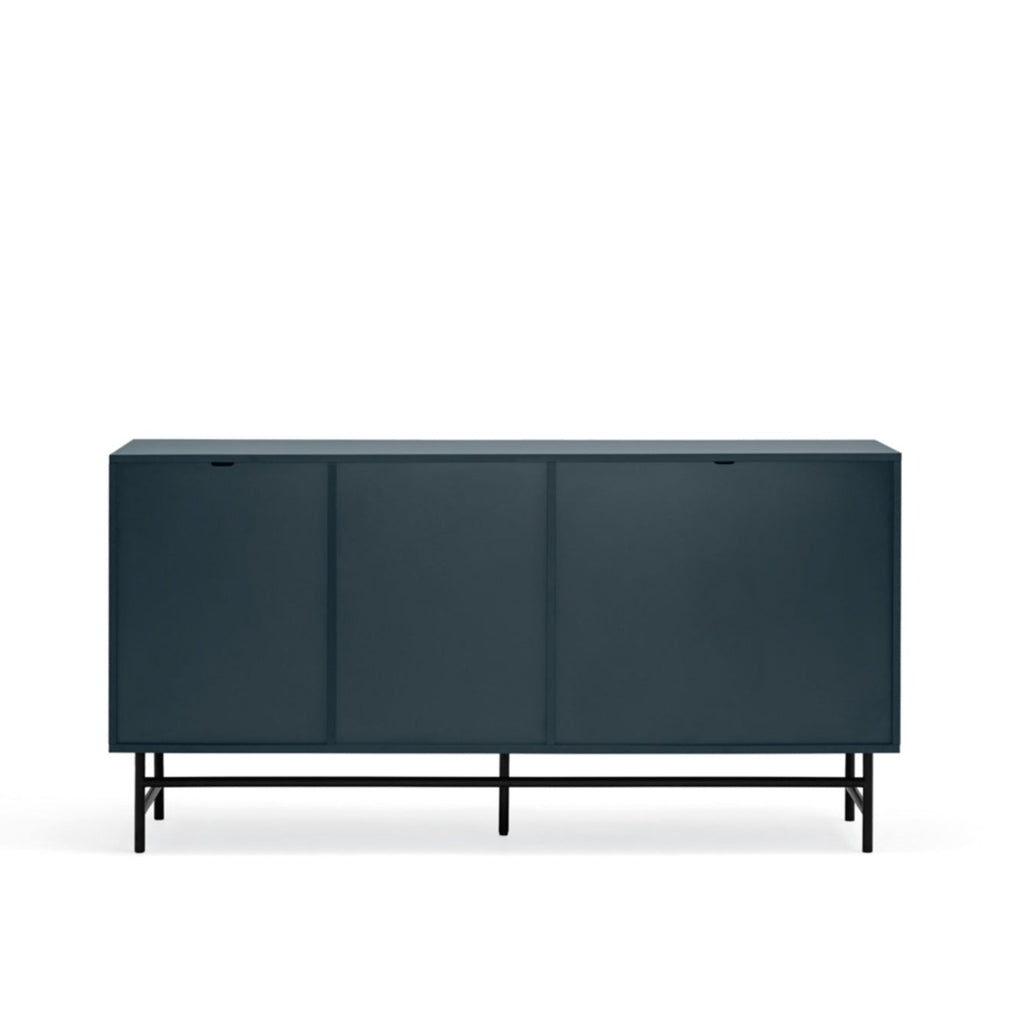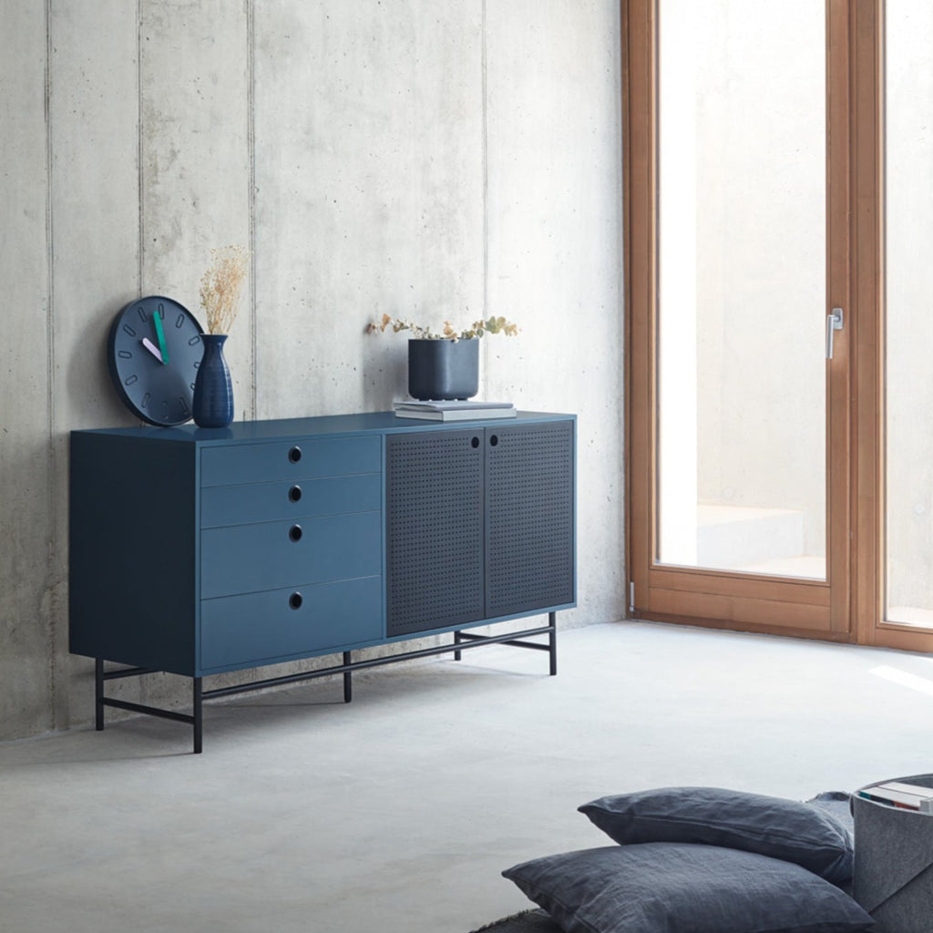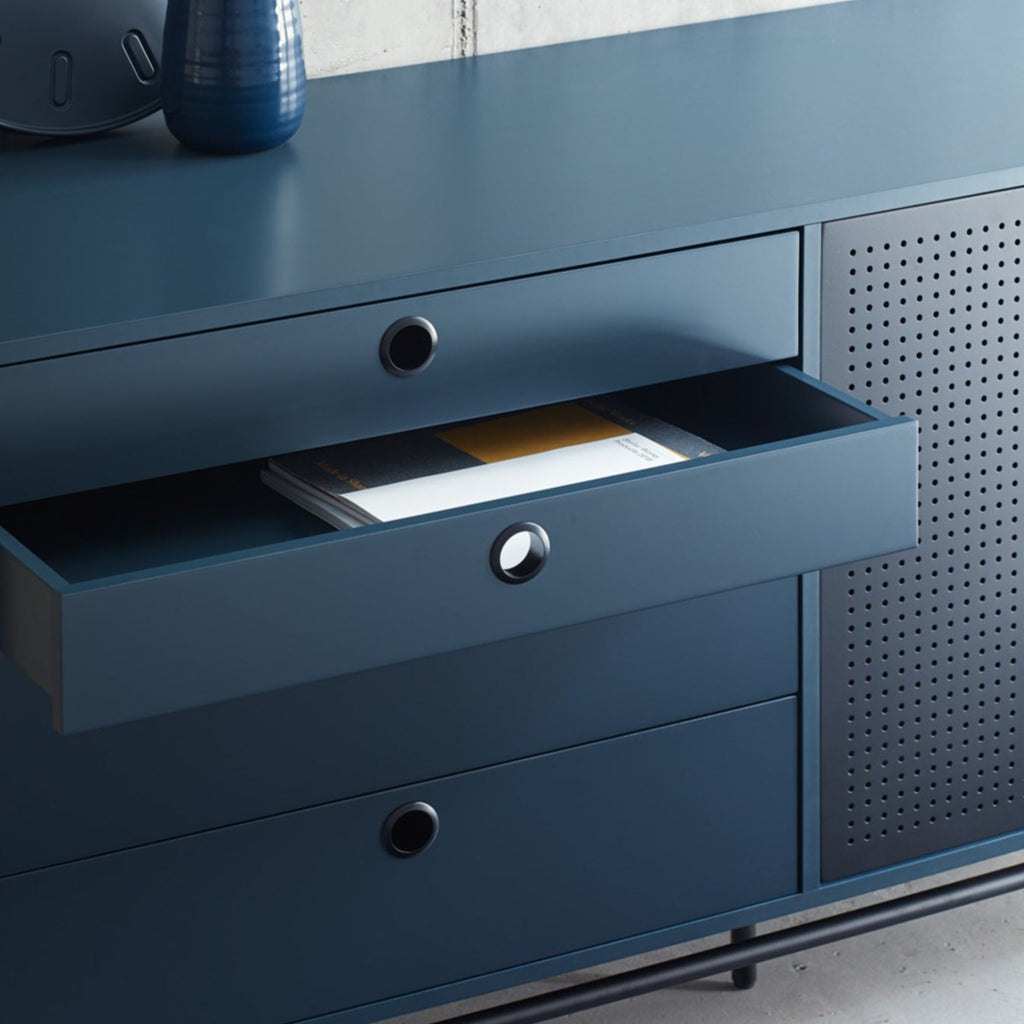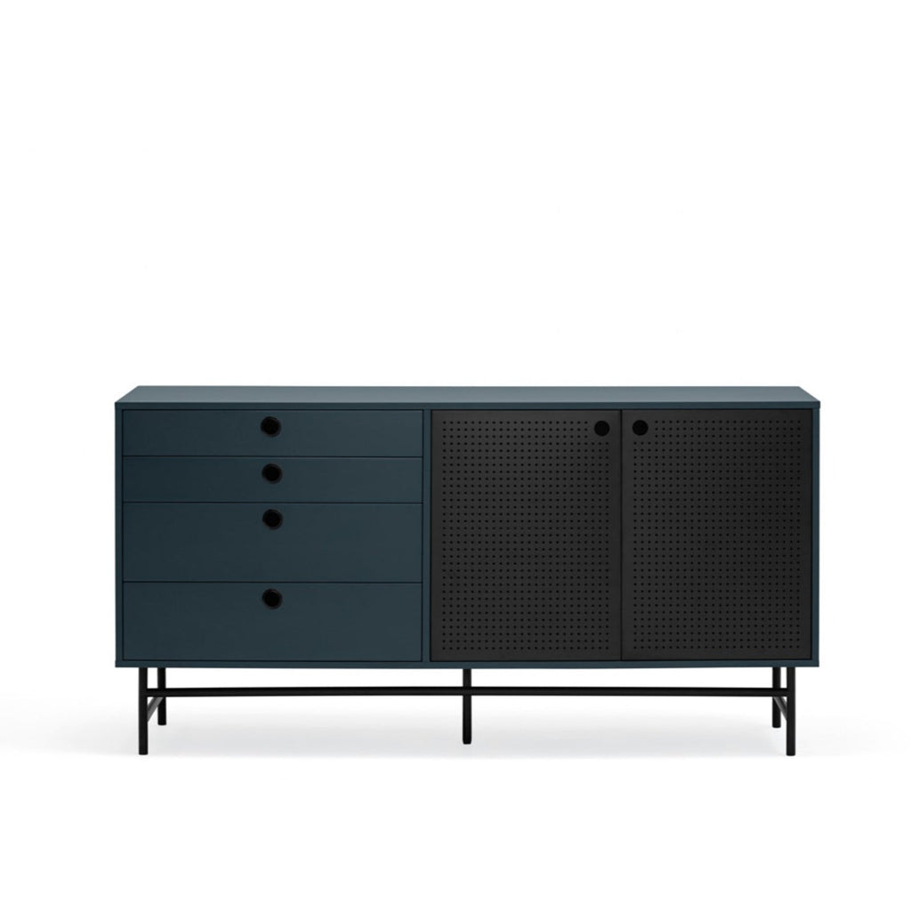 The eye-catching matt black perforated metal doors conceal four spacious shelves, while four sumptuous dark blue lacquered drawers provide sophisticated storage solutions. Elegant circular flush handles seamlessly unite these contrasting elements, creating a harmonious visual flow. Standing on sleek powder-coated metal legs, this 150cm wide masterpiece combines generous proportions with contemporary flair. Invite admiration into your living space with this versatile sideboard that effortlessly balances industrial edge with refined elegance.