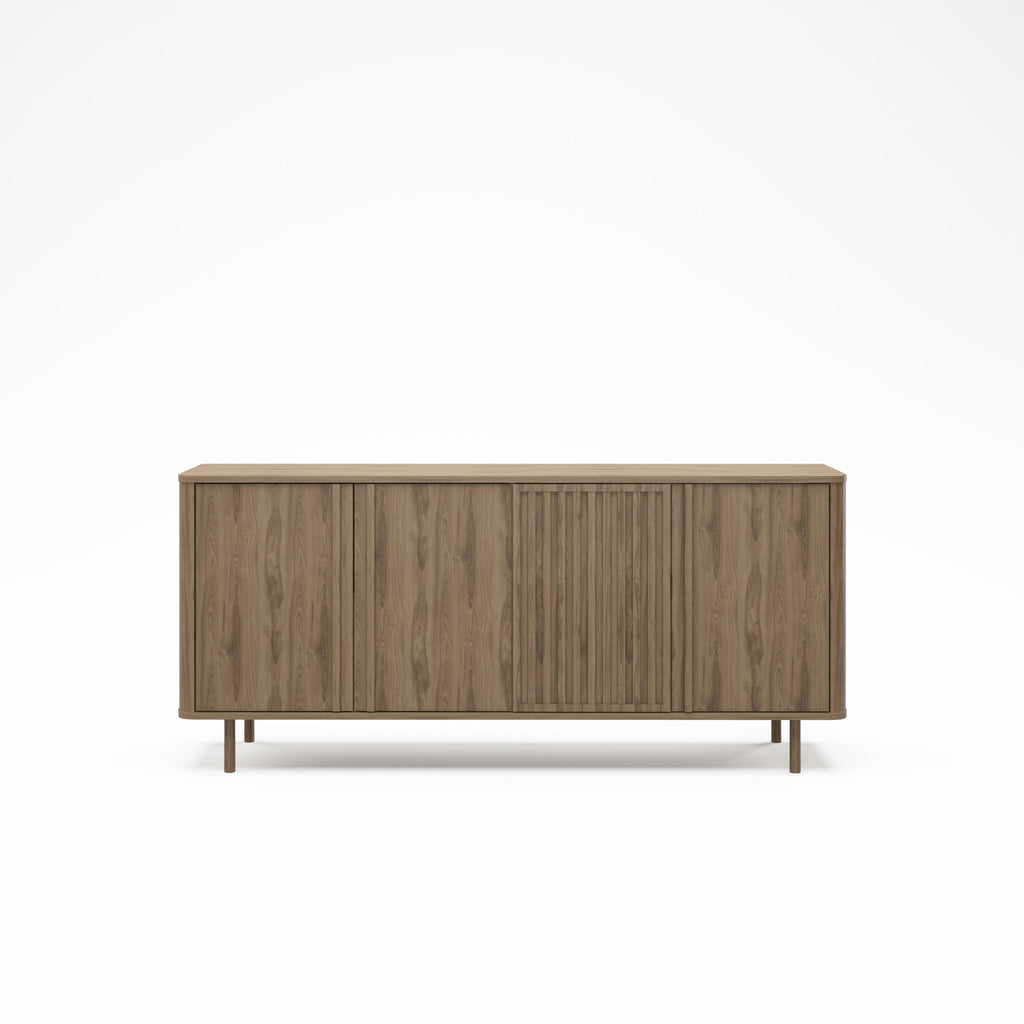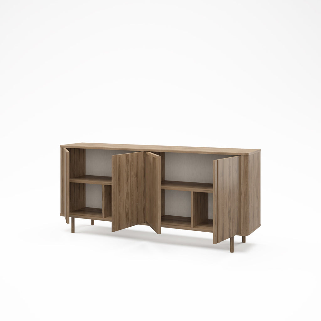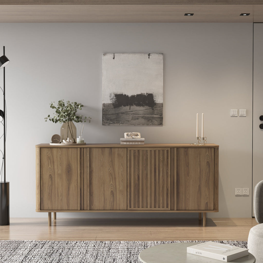 Its durable oak-finished laminate surface and unique fluted central door add a touch of elegance and texture. Inside, two spacious shelves provide ample storage to keep your belongings neatly organized. Supported by sturdy wooden legs, this sideboard offers lasting stability while enhancing any room with its refined craftsmanship. Elevate your space with a piece that perfectly balances functionality and sophisticated design.