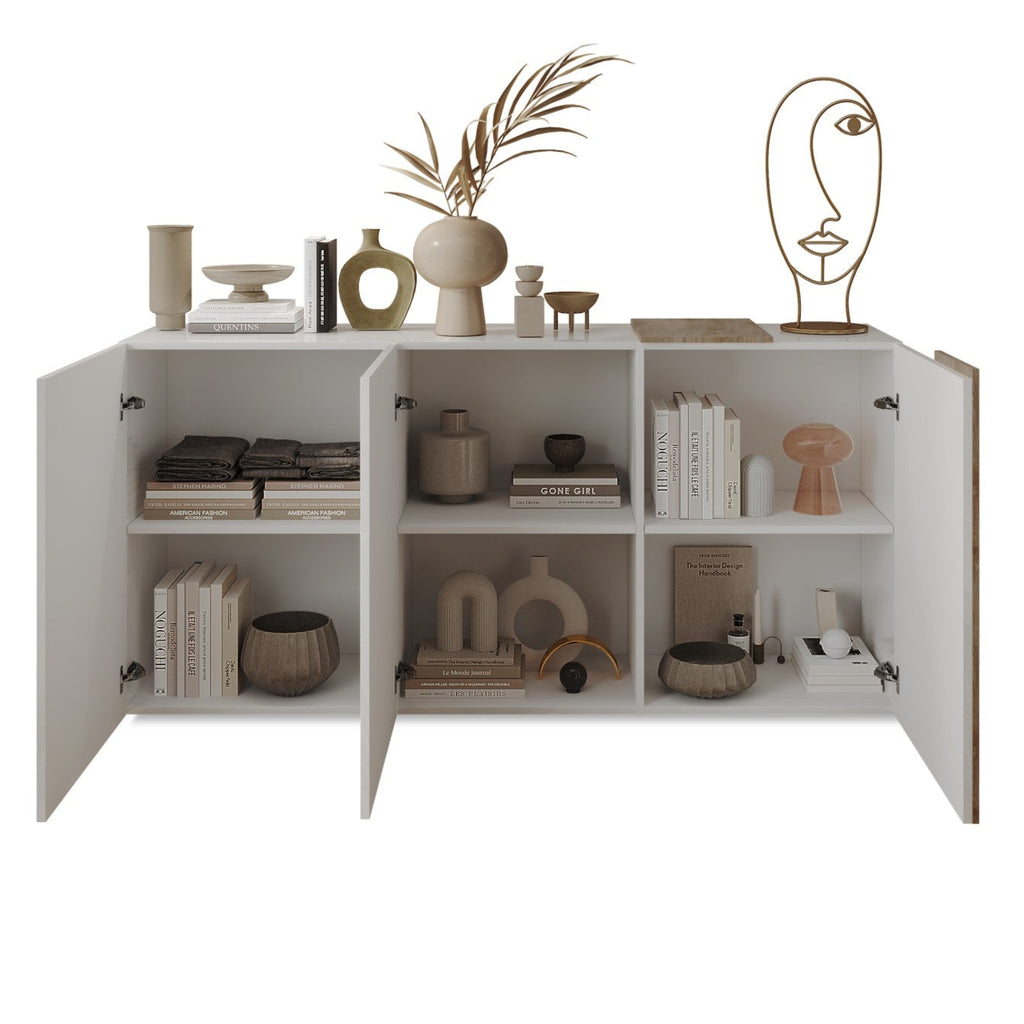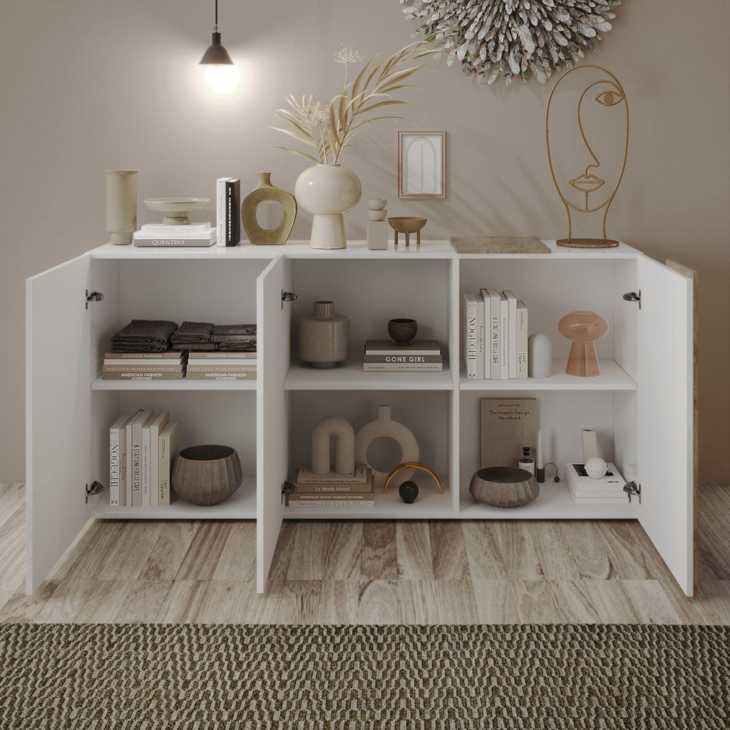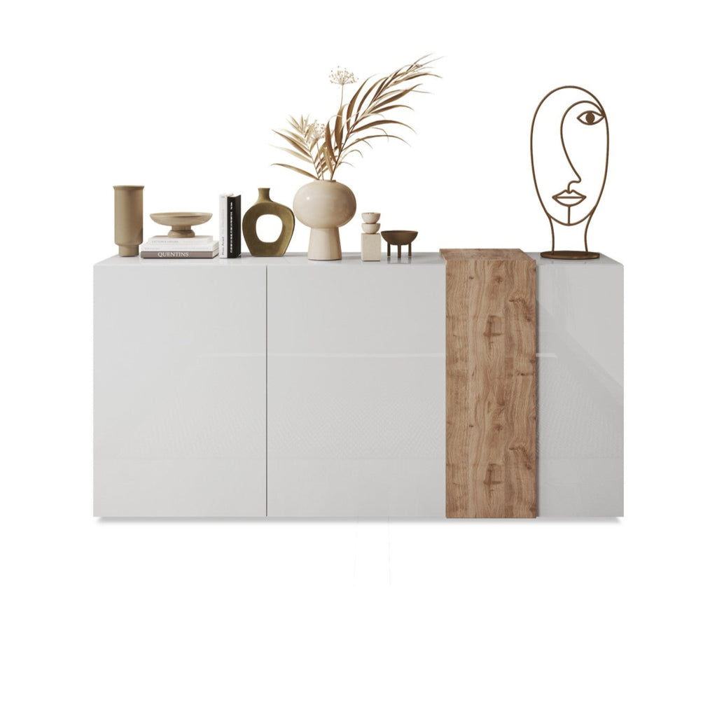 The Vinovo Sideboard features a striking gloss white finish complemented by a light oak door wrap, blending modern style with natural warmth.