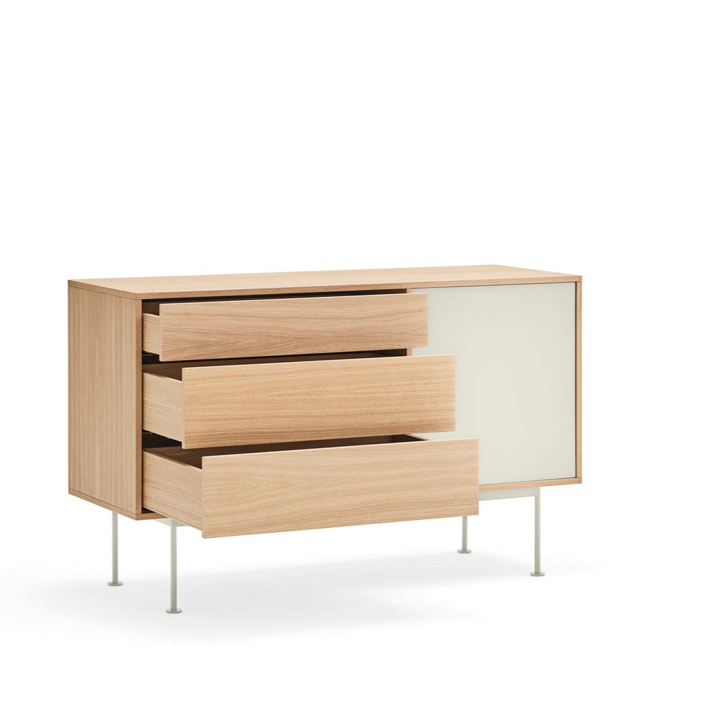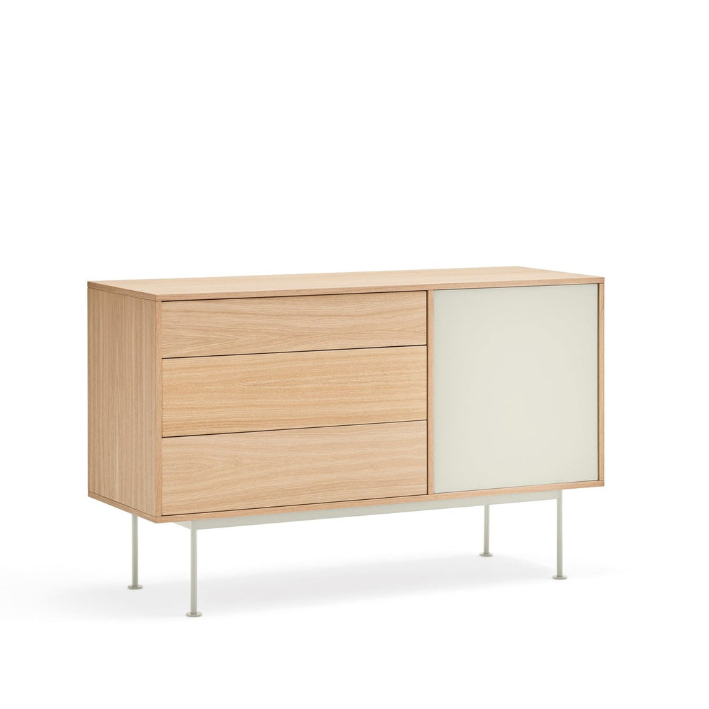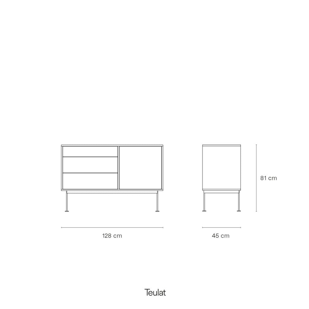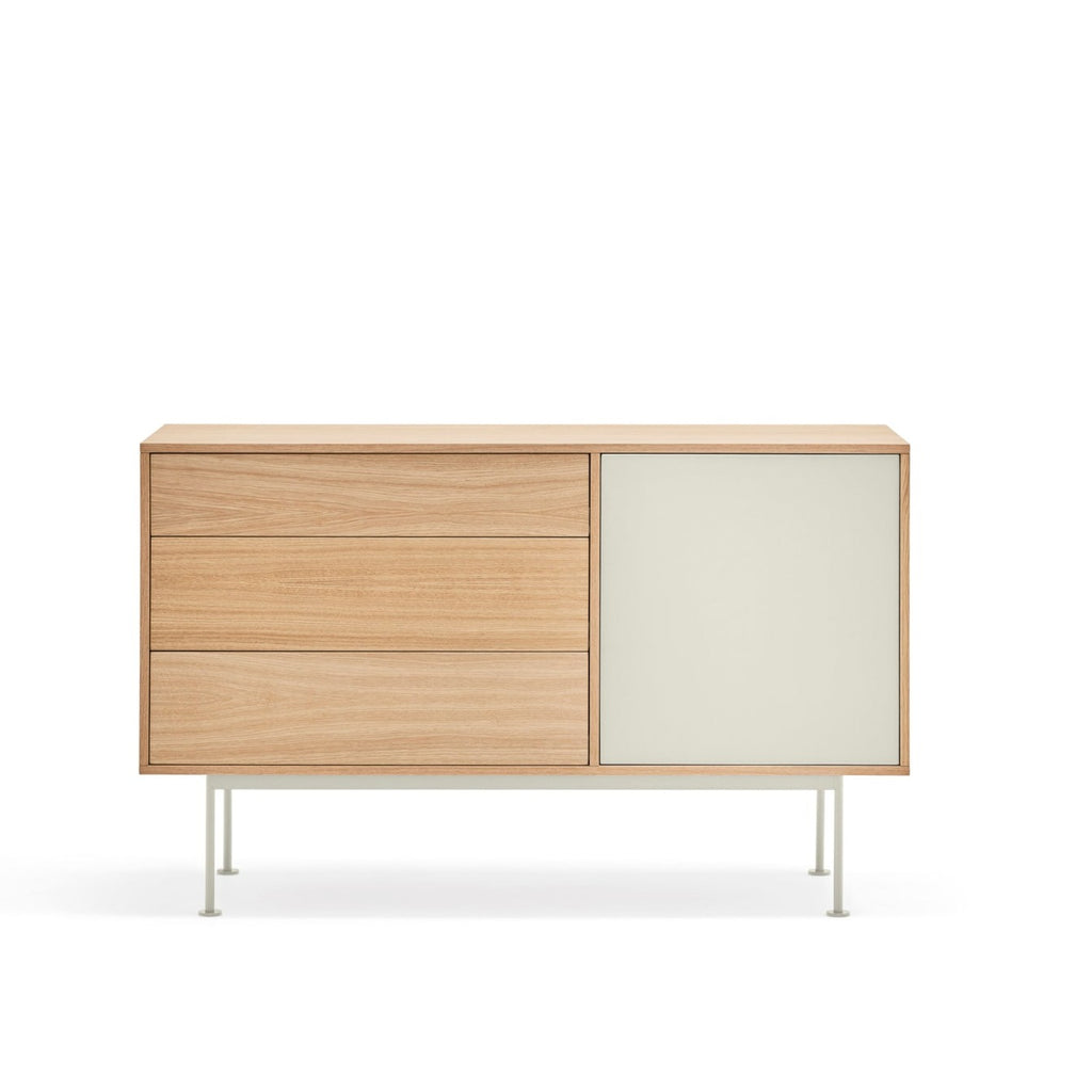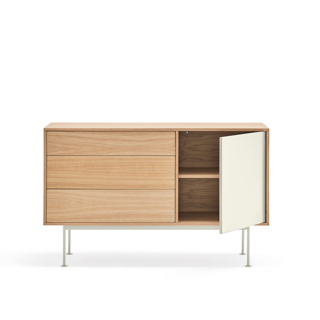 This sophisticated storage solution features three premium soft-close drawers on metal runners and a spacious shelved compartment behind a statement cream door. The distinctive powder-coated metal frame with eye-catching disc feet provides both stability and style. At a perfectly proportioned 128cm wide, this versatile sideboard doesn't just organize your belongings—it transforms your interior with its designer aesthetic. Invest in the perfect balance of form and function that will elevate your home for years to come.