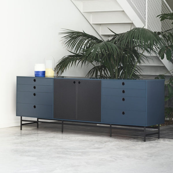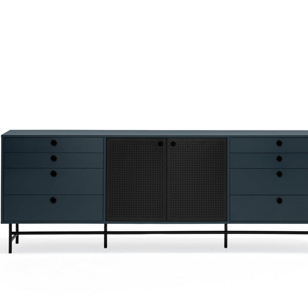 Punto Sideboard, Eight Drawers, Two Industrial Design Metal Doors, Wood with Metal Frame, Four Shelves - Dark Blue and Matt Black Finish
